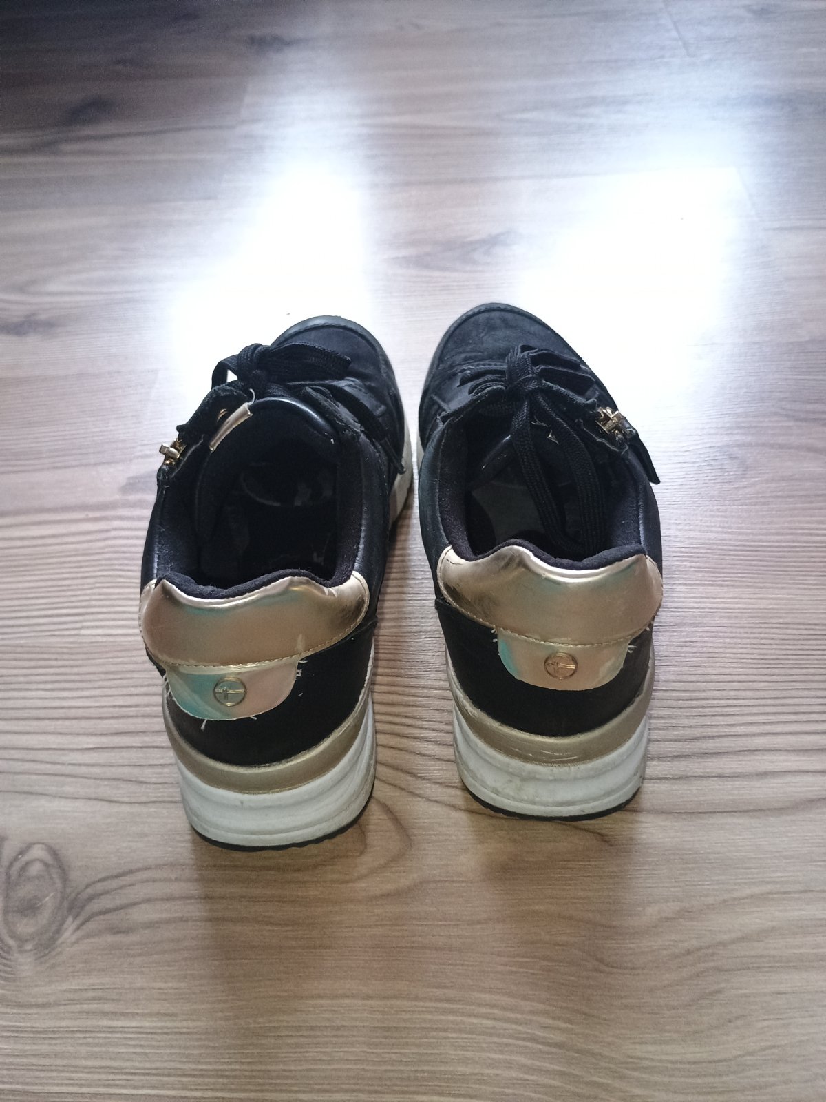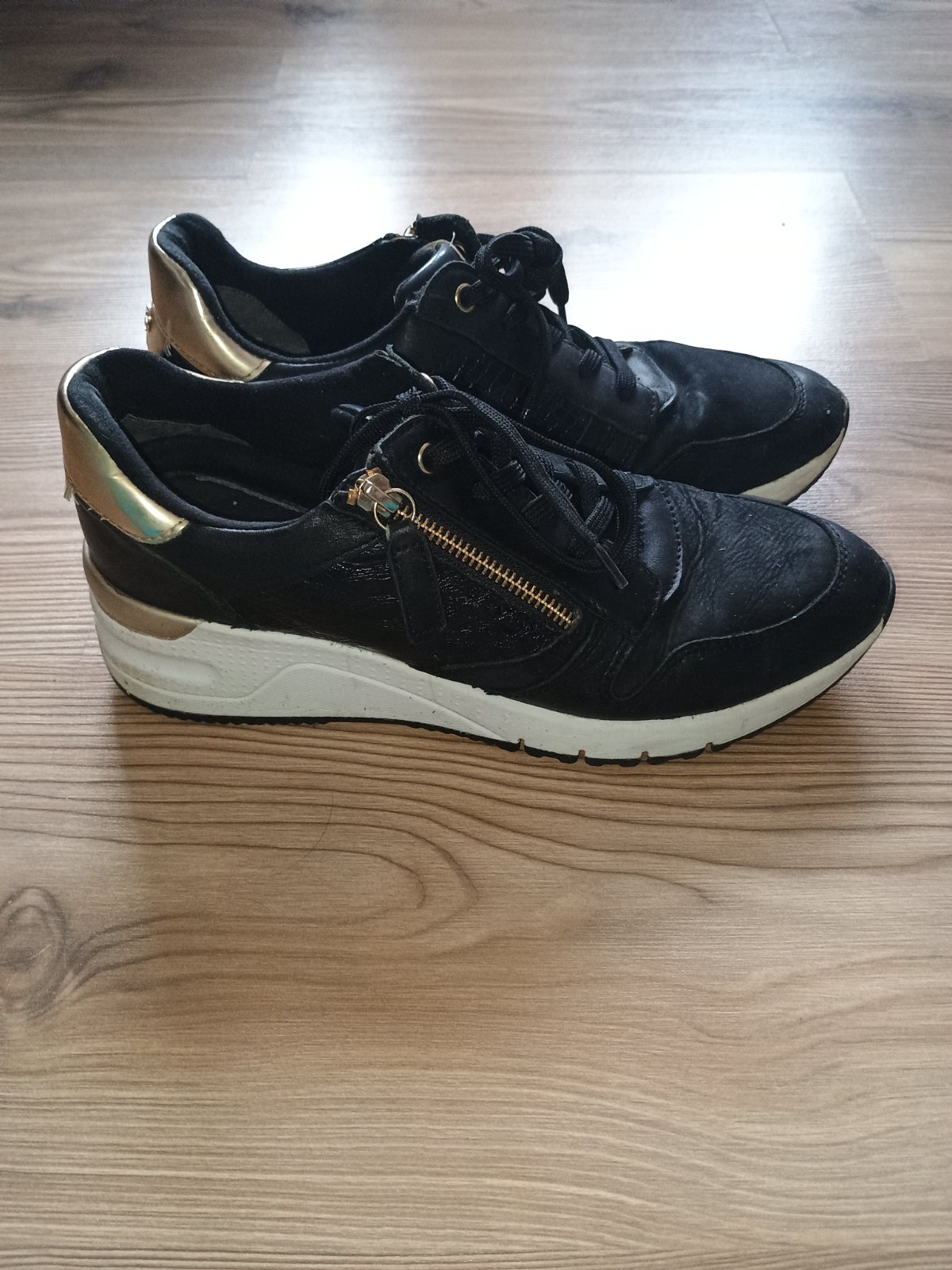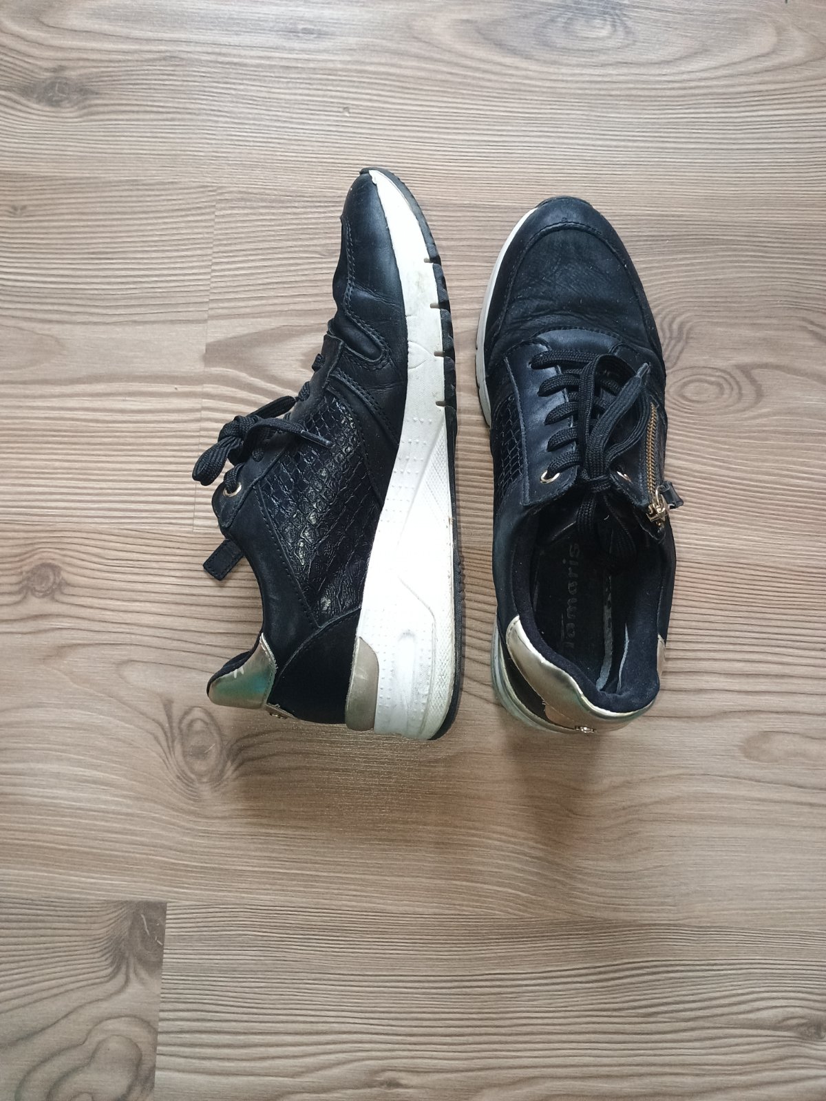 Kožené tenisky Tamaris asi jednu sezónu nosené dobry stavl a akurát sa mi zdá že trošku špičky sa odlepujú ale to sa dá obuvníckym lepidlom ľahko zalepiť. pata je trošku vyššie ako špička a zapínie je na zips ale aj na šnúrky