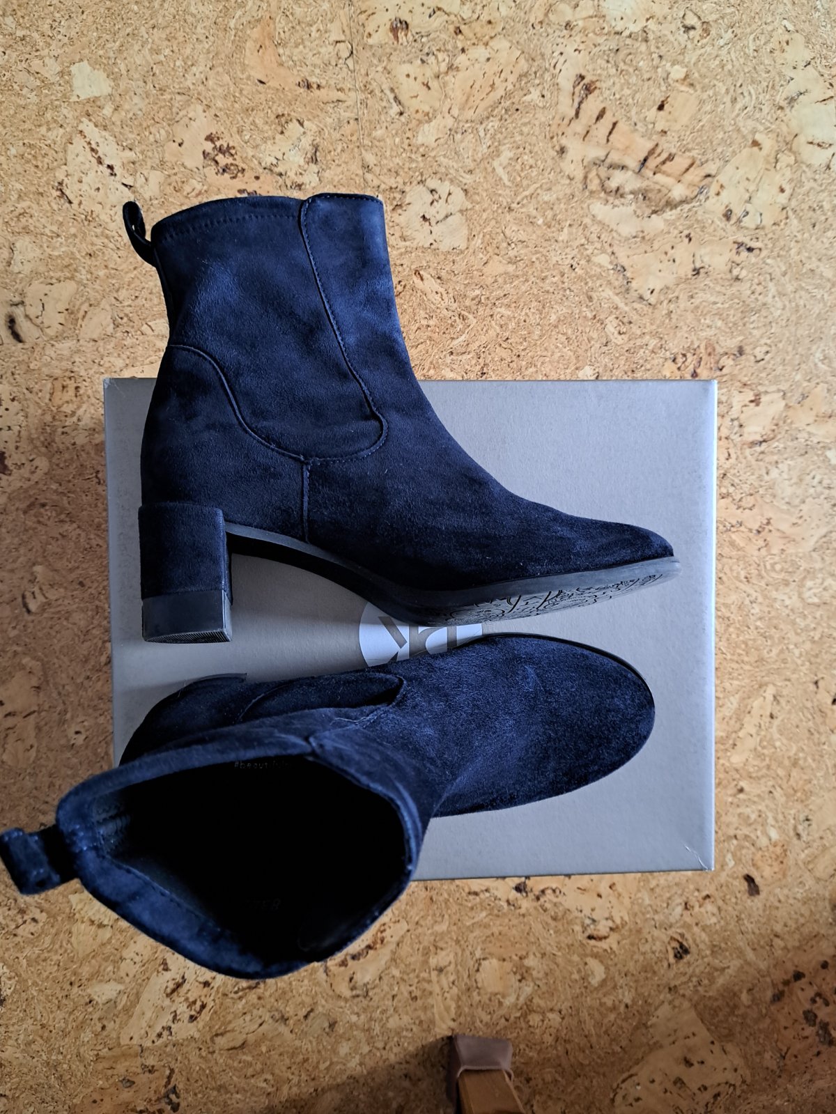 Krásne členkové čižmy tmavomodrej farby, nazúvacie, elastická koža (pravá koža). Veľmi kvalitné, PC okolo 200€. 100% stav, boli asi 2x obuté, nosenie vidno len na podrážka. Vnútorná stielka cca 23,5cm. Podpätok cca 6cm.