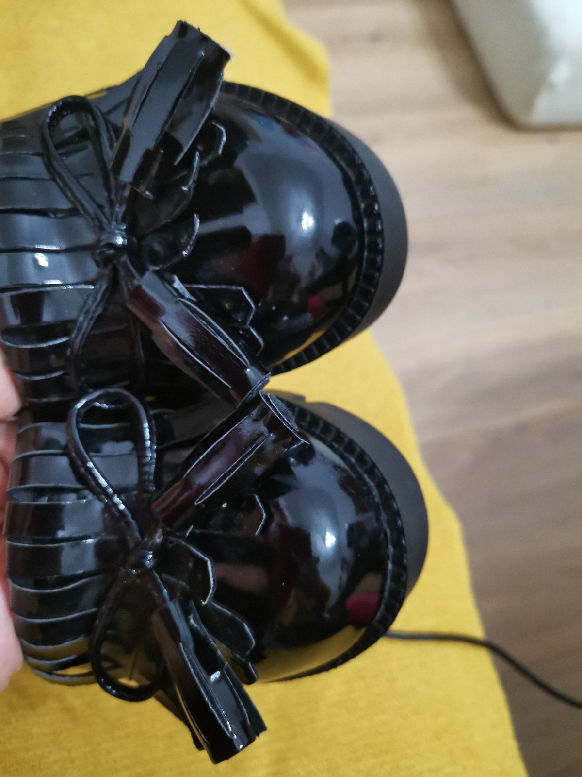 Krásne štýlové lakované topánky raz použité nestihla po nosiť kôli corone nôžka vyrástla