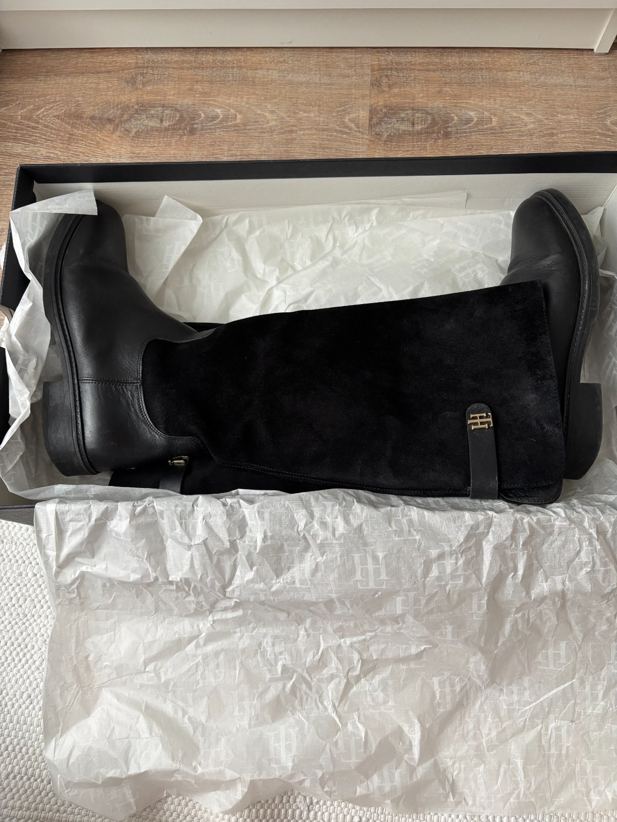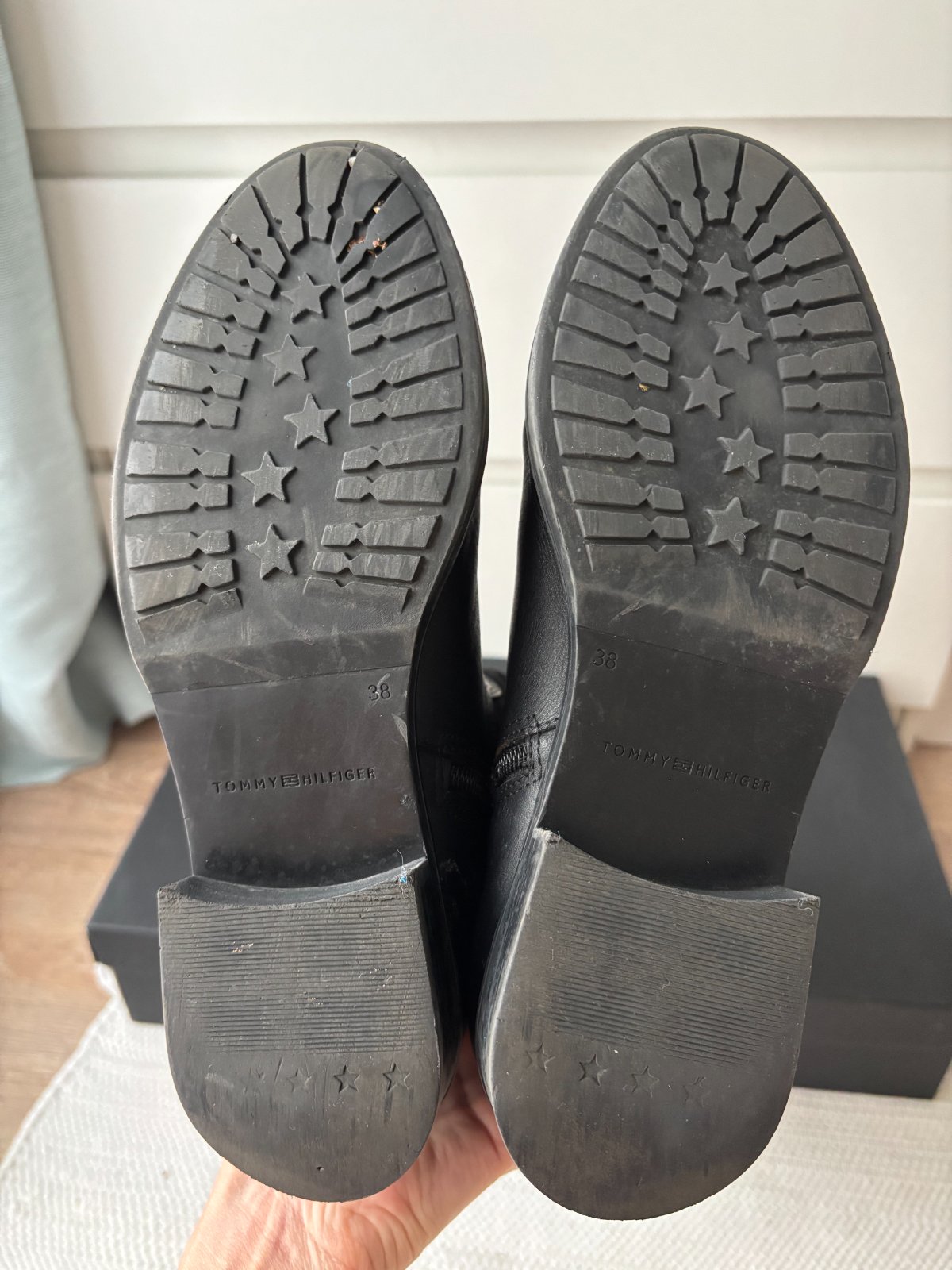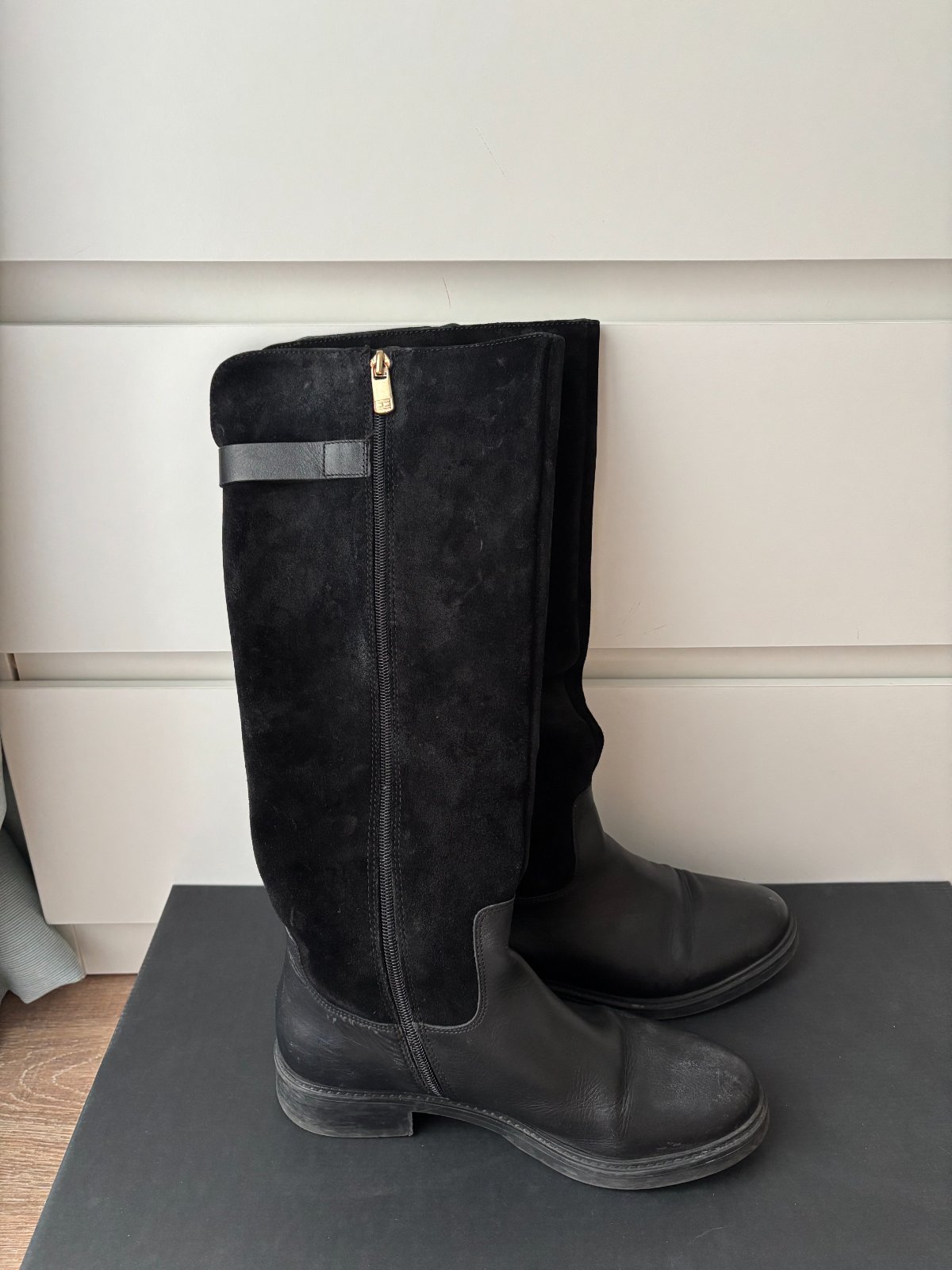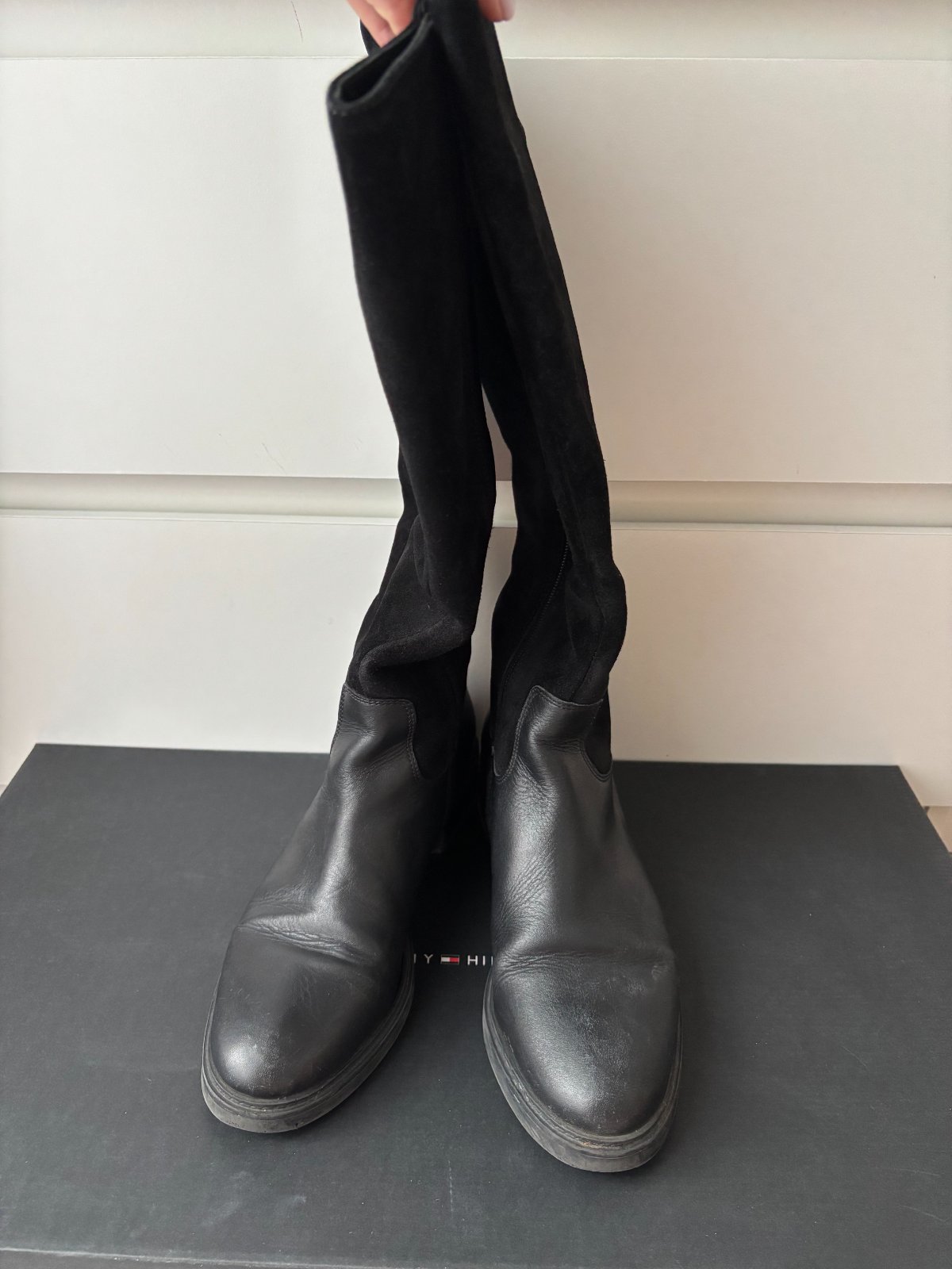 Čierne kožené čižmy Tommy Hilfiger v originálnej krabici, kupované priamo v e-shope Tommy Hilfiger, veľkosť 38, na jednej čižme je odpadnutý vrch zipsu (viď fotka), inak sú čižmy bez poškodení. Osobný odber je možný v BA a NR.