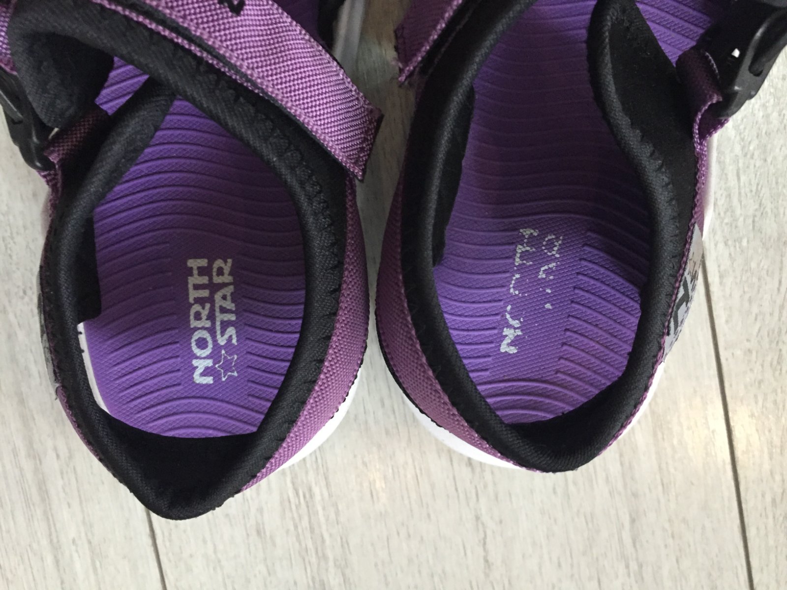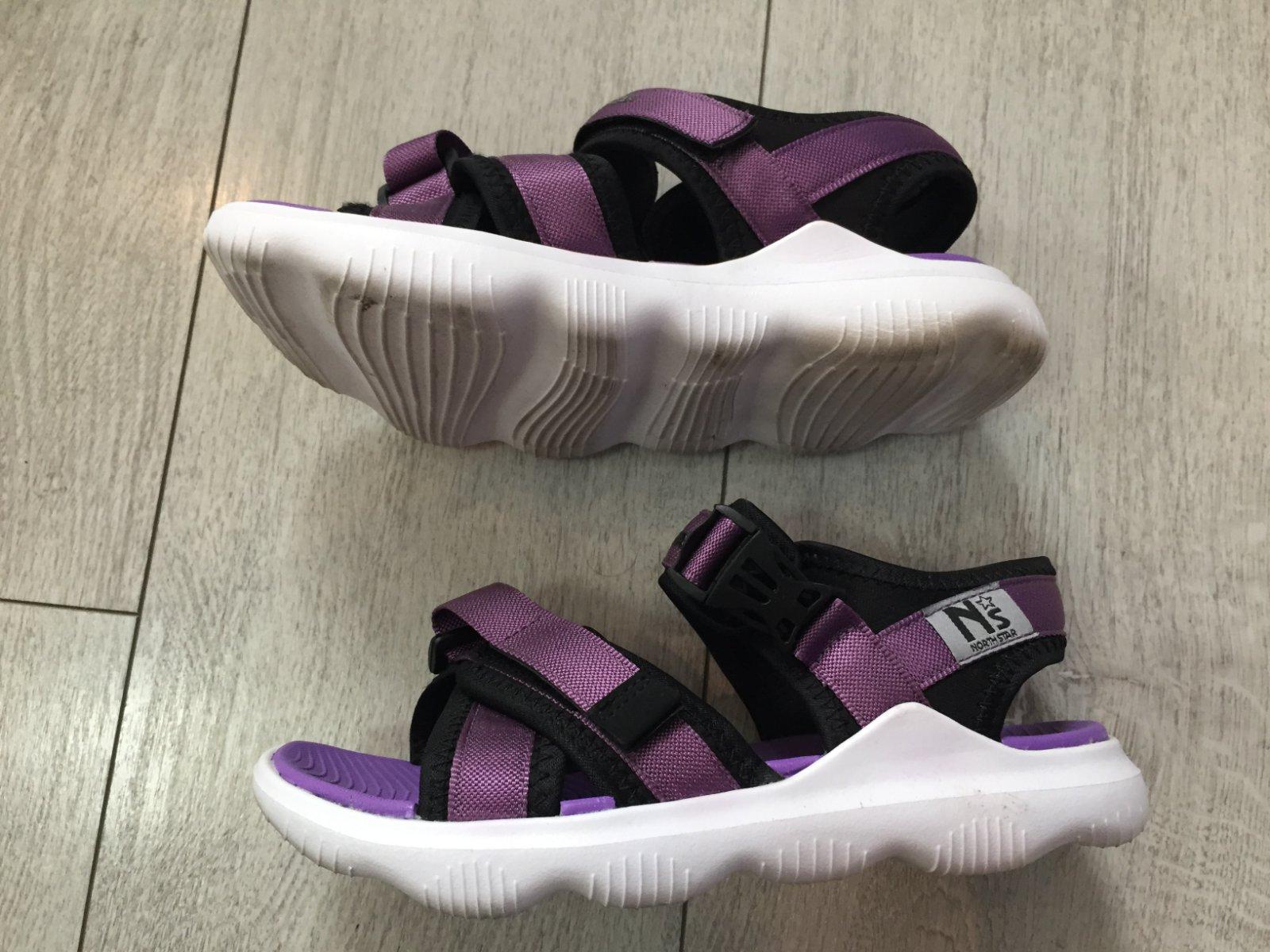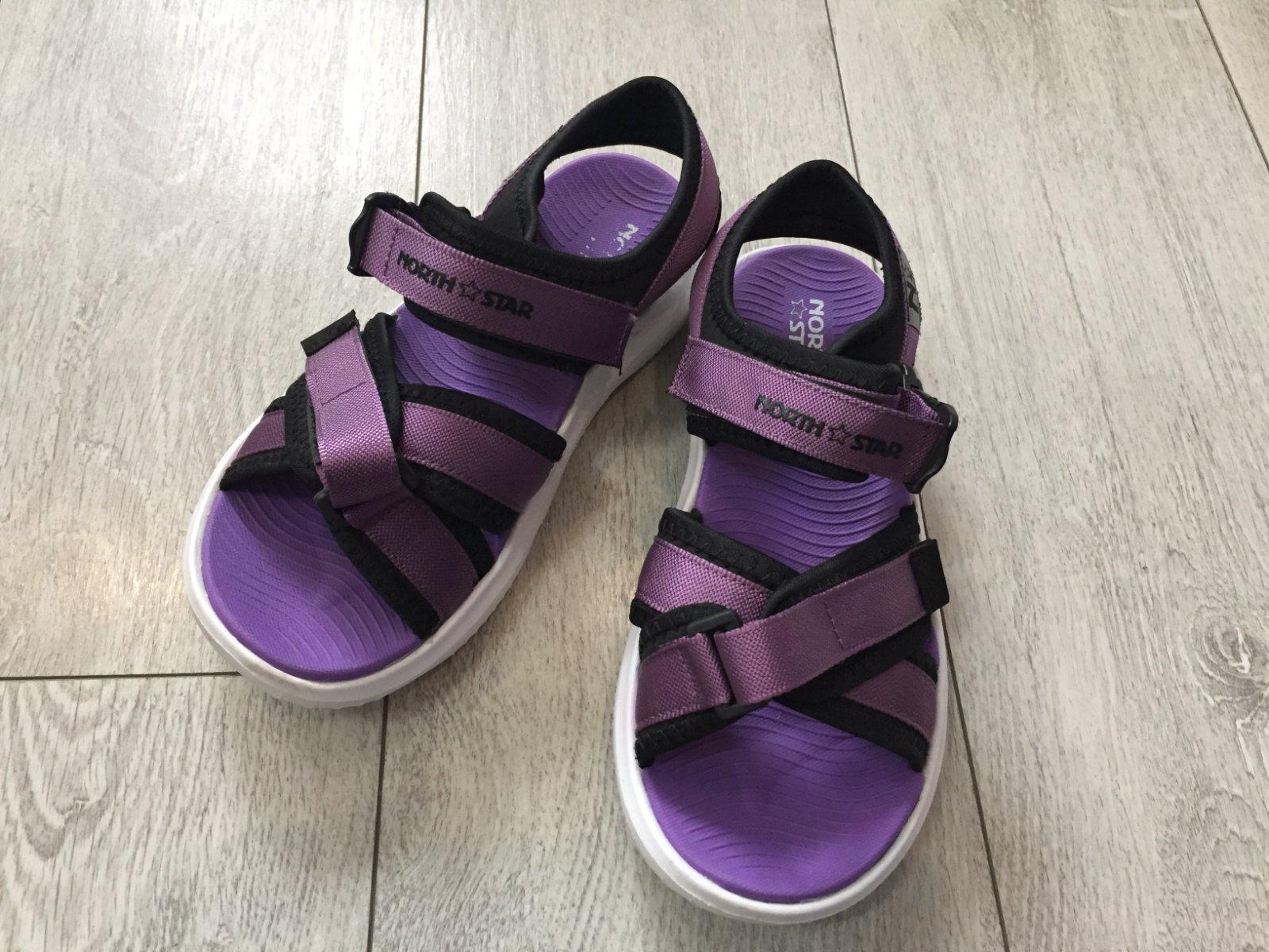 Sandale 3x obute. Kupene u Batu. Vnutorna dlžka cela fialova čast 24cm, podražka 25,5cm.