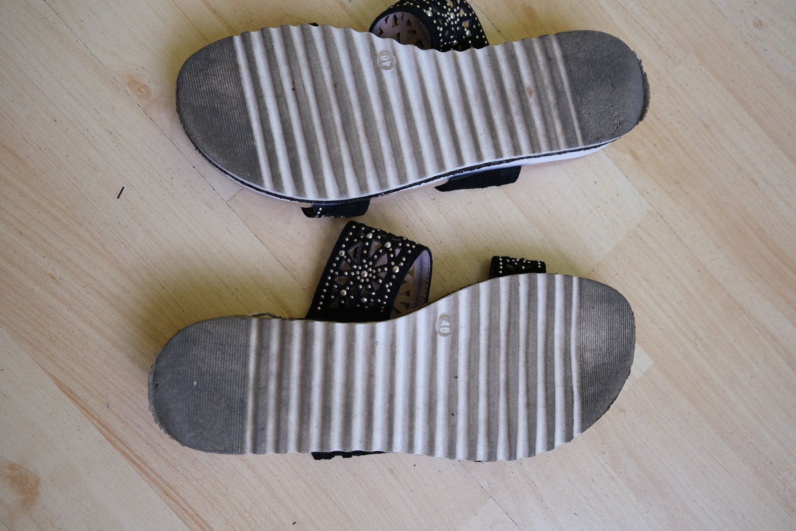 Veľkosť: písaná veľkosť je 40 ale určite menšia max 39, vnútorná dĺžka meraná je 26 cm, ale na chodidlo by mala byť 24,8 cm vonkajšia 26 cm