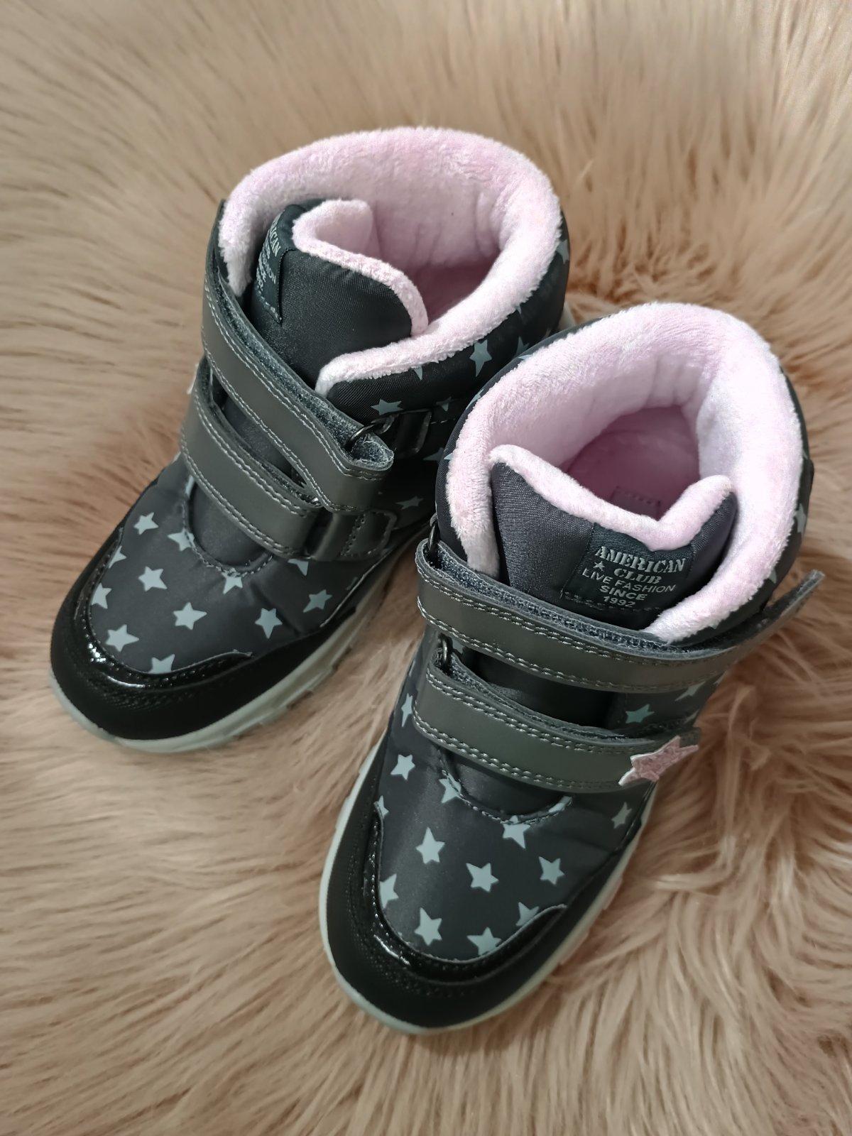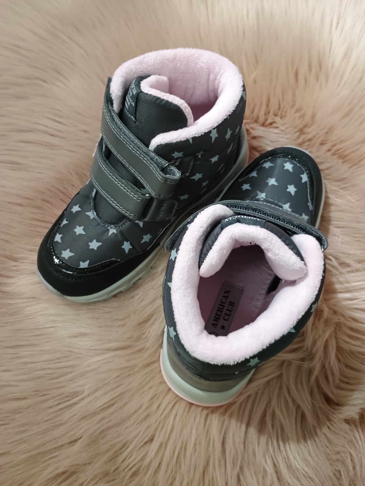 Zvršok topánok je vyrobený z odolného syntetického materiálu, ktorý odpudzuje vlhkosť a zároveň sa ľahko čistí. Vnútro je zateplené mäkkou kožušinou, ktorá udrží nohy v teple aj počas chladných dní. Dvojitý suchý zips zabezpečí rýchle obúvanie a dokonalé prispôsobenie nohe dieťaťa.
