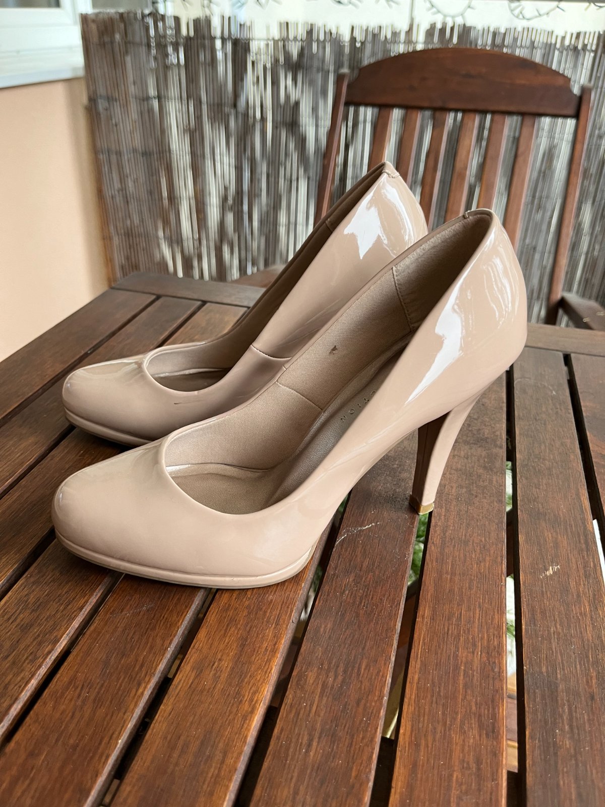 Vo veľmi dobrom stave, vnútri sú mäkučké. Na jednej topánke je zvnútra zboku škvrnka, inak sú v poriadku. UK veľkosť 5, EU 38. Výška opätku takmer 11cm. Vnutorna dlzka vlozky je 24cm.