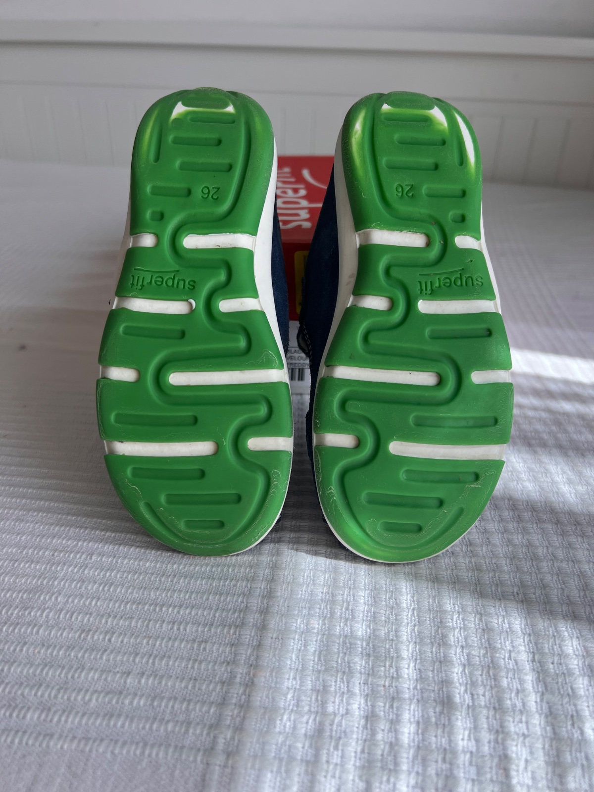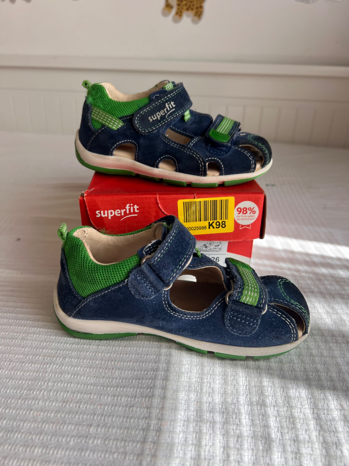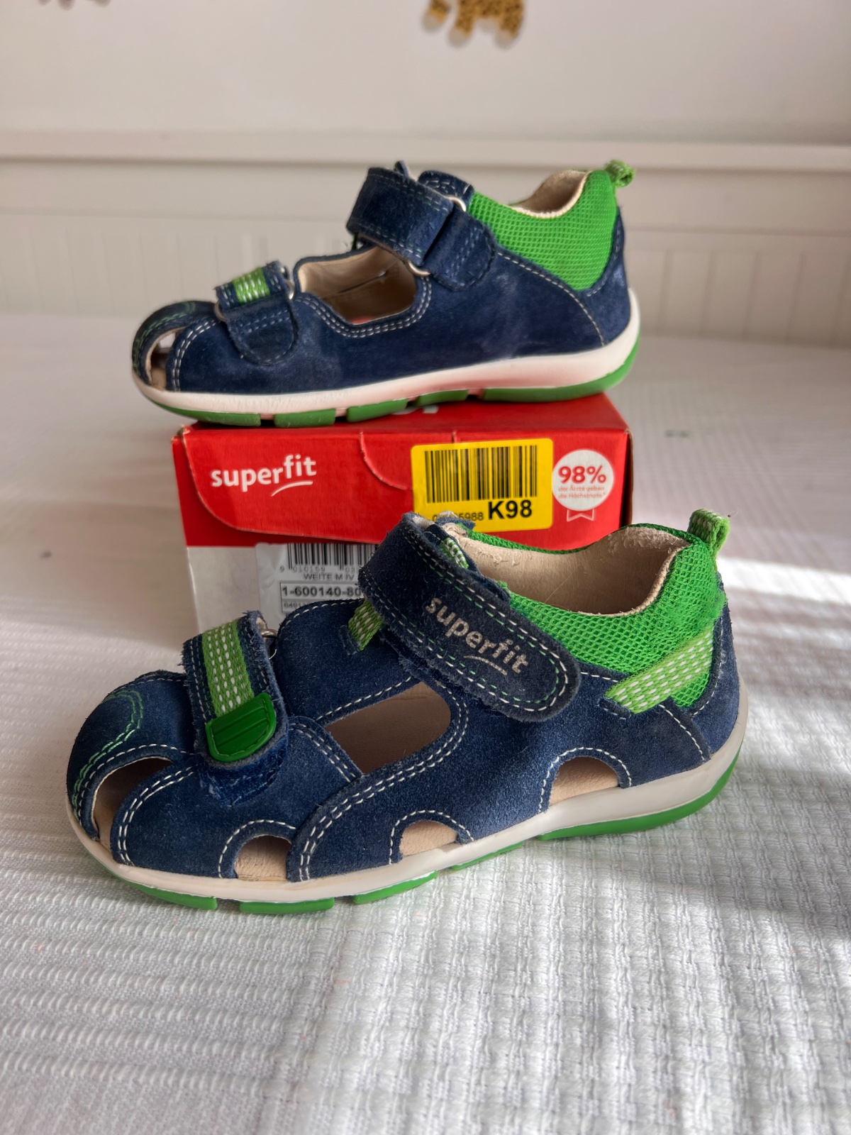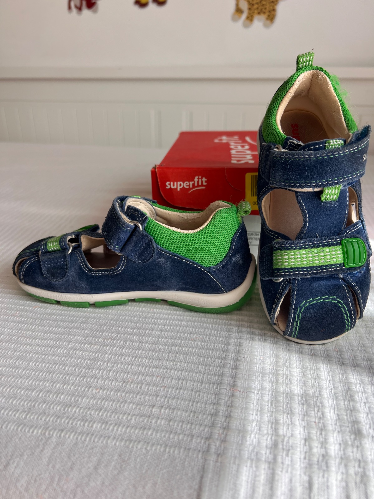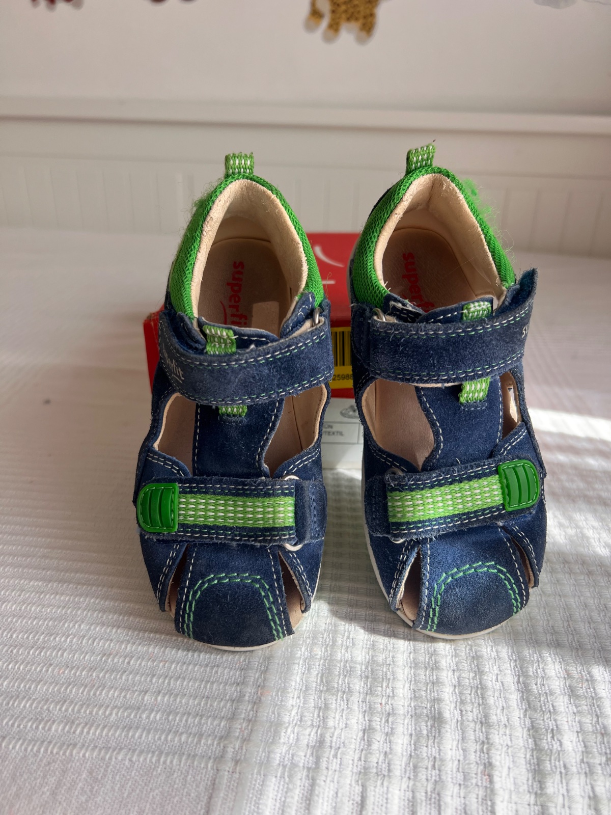 Kvalitné sandálky z brúsenej kože, tmavomodré so zelenou textilnom častou. Hore na päte vo vnútri popraskané.