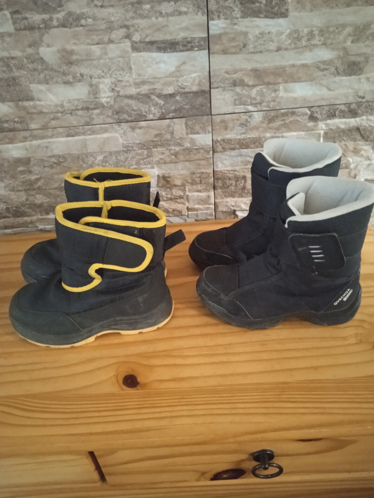 Predám vo veľmi dobrom stave chlapčenské zimné čižmy veľkosť 29 ( so žltým lemom skôr na doma) - 2,- eur, čierne 3,-eur+poštovné.