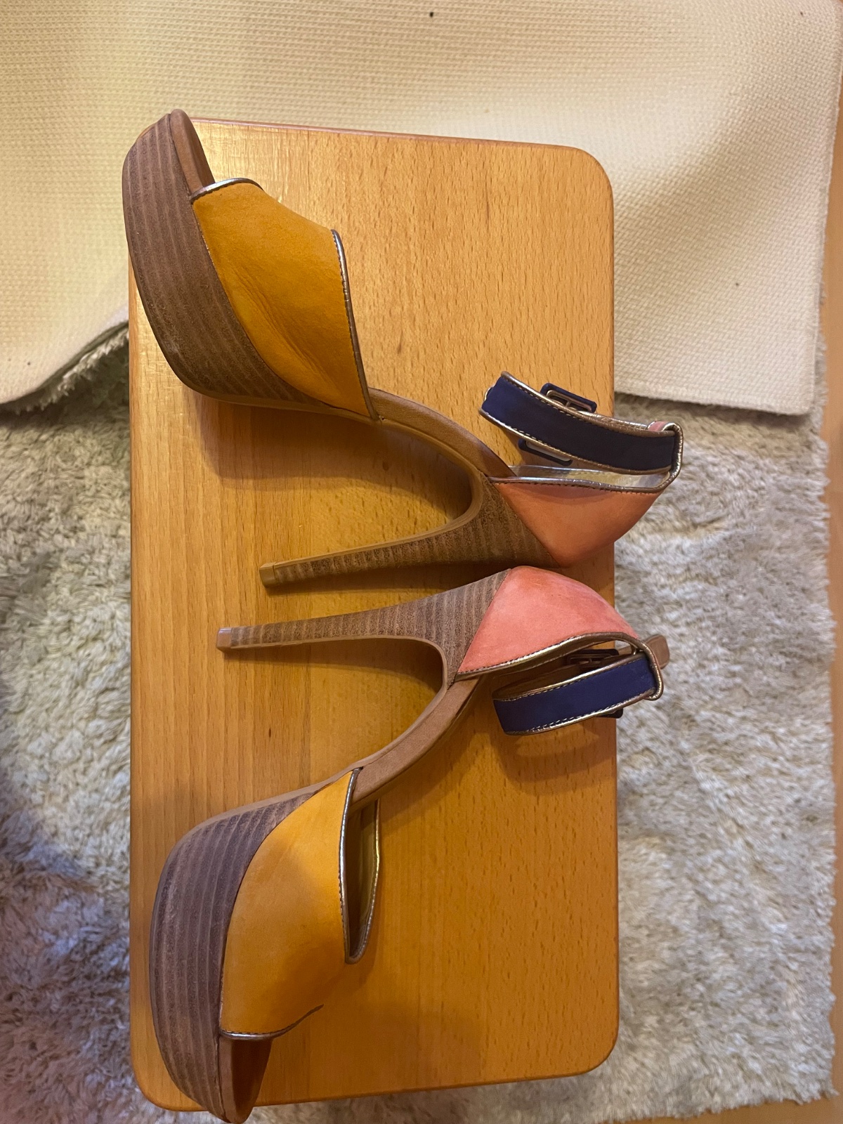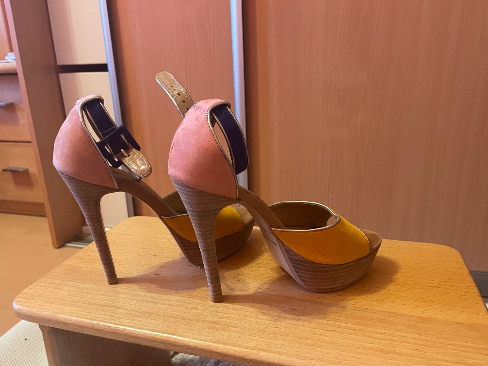 Kožené sandále vo vynikajúcom stave, opätok 12cm, platforma 3 cm. Dobre sa v nich chodí.