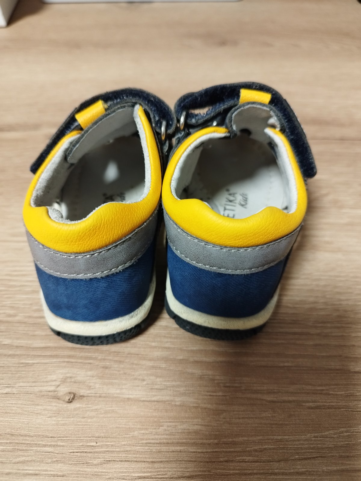 Sandálky Protetika,veľkosť 21,vd 14,5.Modra farba pustila na sivú.Vzadu je modrá farba vysuchana.