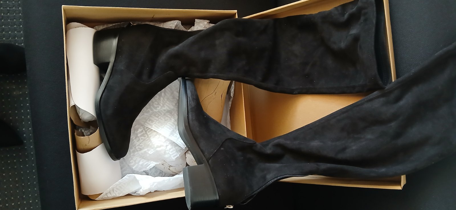 Predám čižmy nad kolená Steve Madden Salvador. Top stav, 2 x obuté, originál krabica. Materiál imitácia kože. Výška hornej časti čižmy 55 cm. Šírka hornej časti čižmy je 32 cm. Výška opätku 4,5 cm.