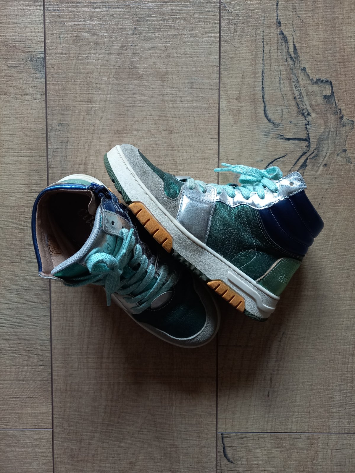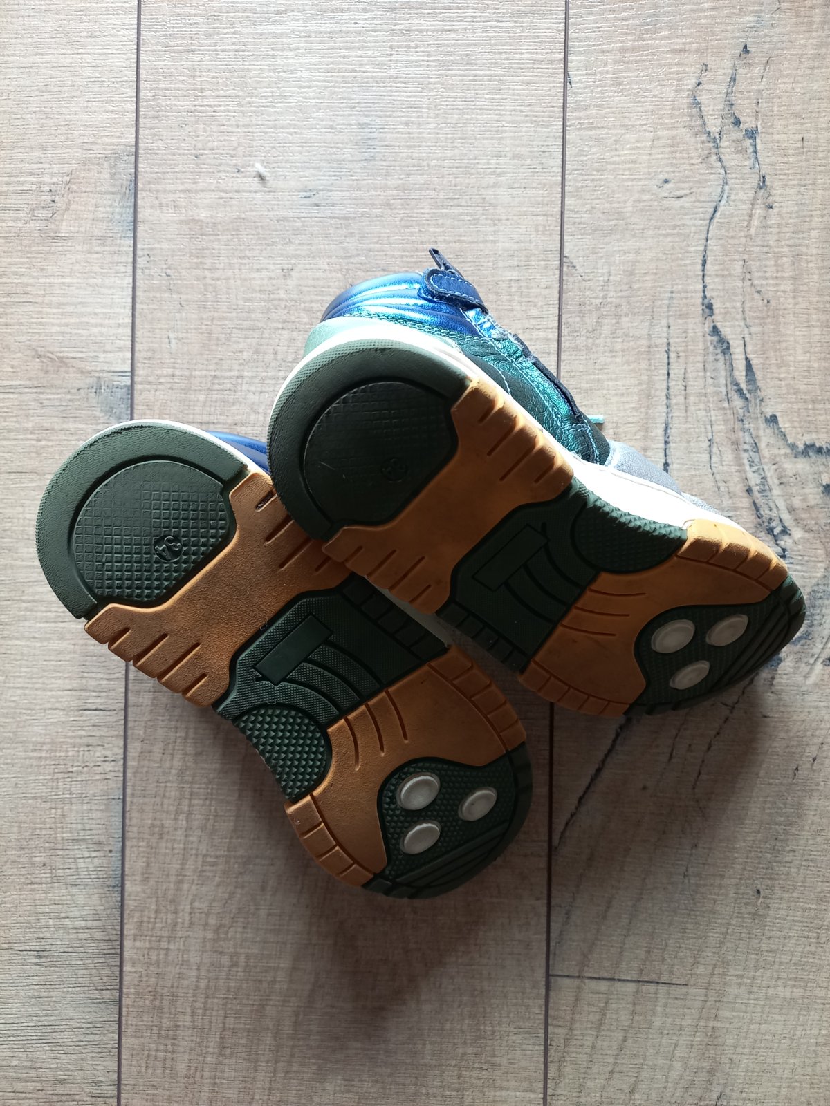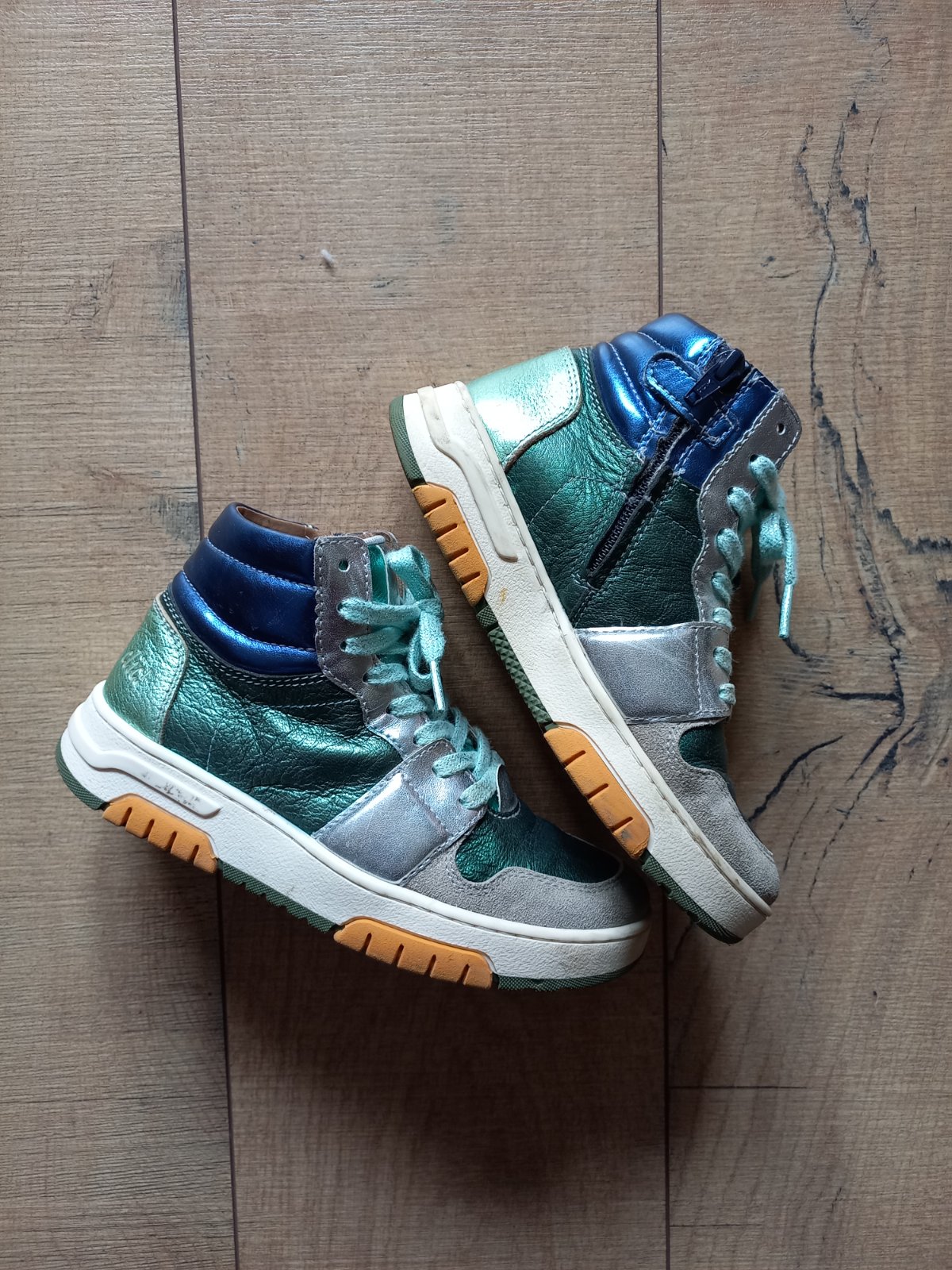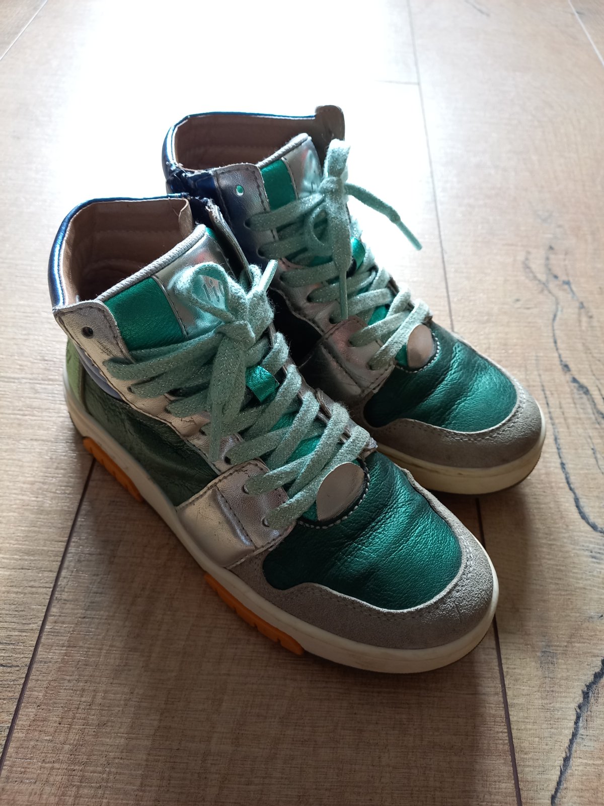 Kozene topanky zn. clic! Zapinanie zboku na zips plus snurovanie. Velkost uvadzana 34, ale sedia na 33. Dcera nosi teraz 34 a uz su jej male. Pekne, az metalicke farby. Podrazka je dost pevna. Bez poskodenia, max. nejake suchance na bielej casti podrazky.