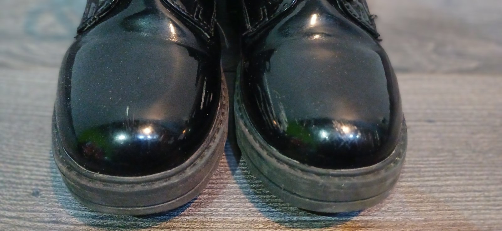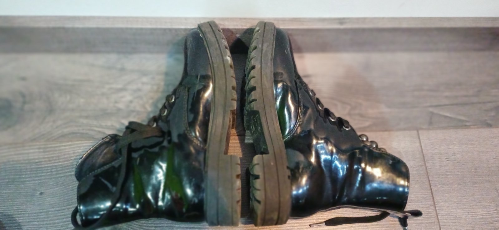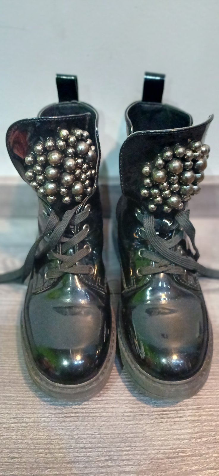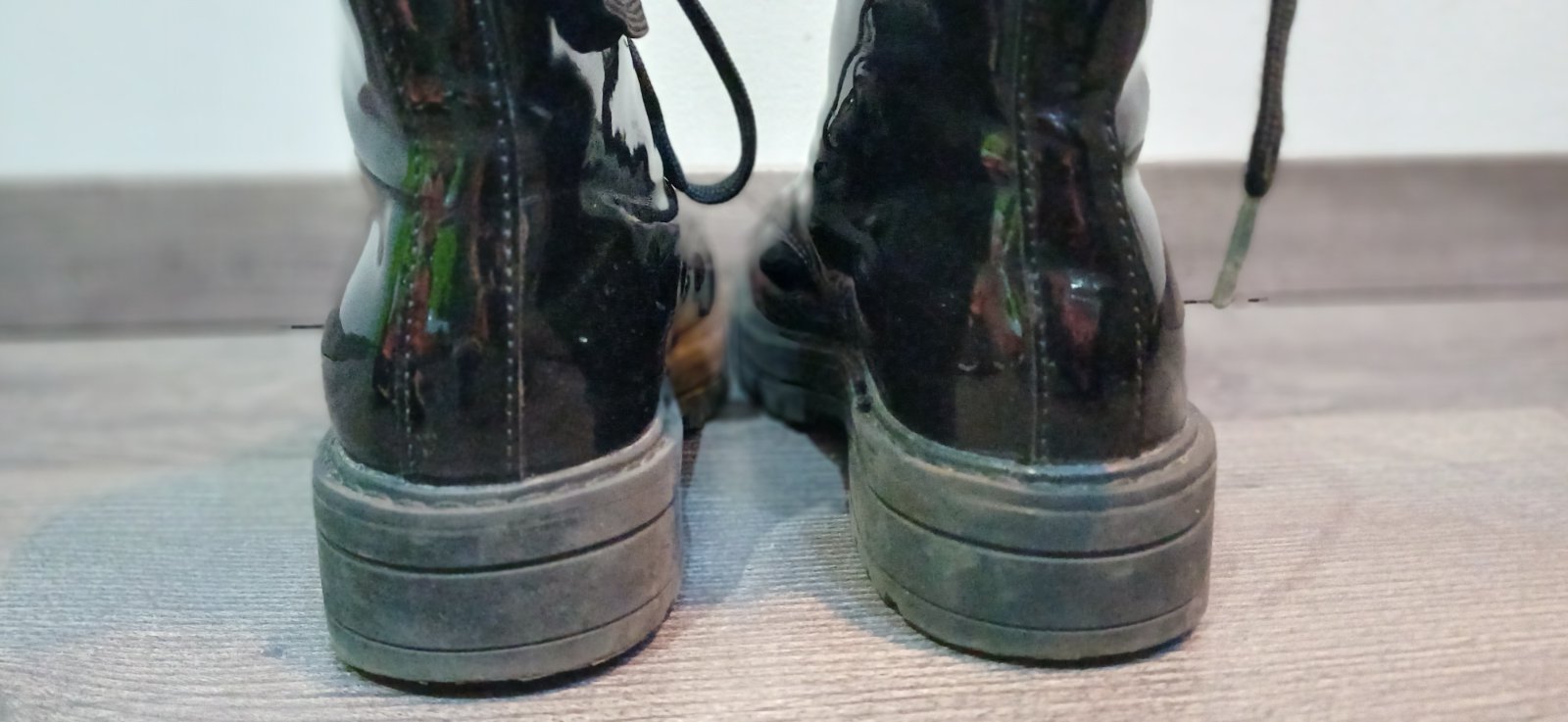 Lesklé šnurovacie topánky. Nosené. Nemajú škrabance ale gumové šmuhy.