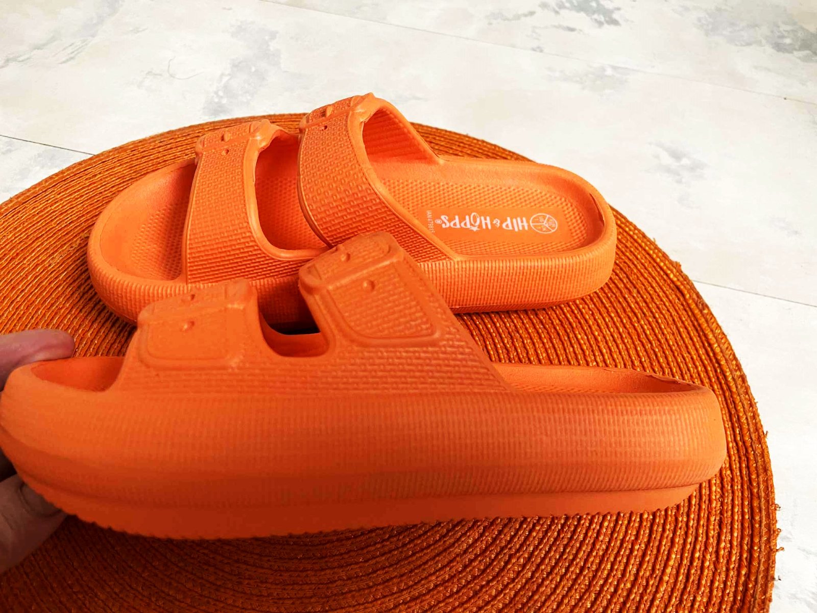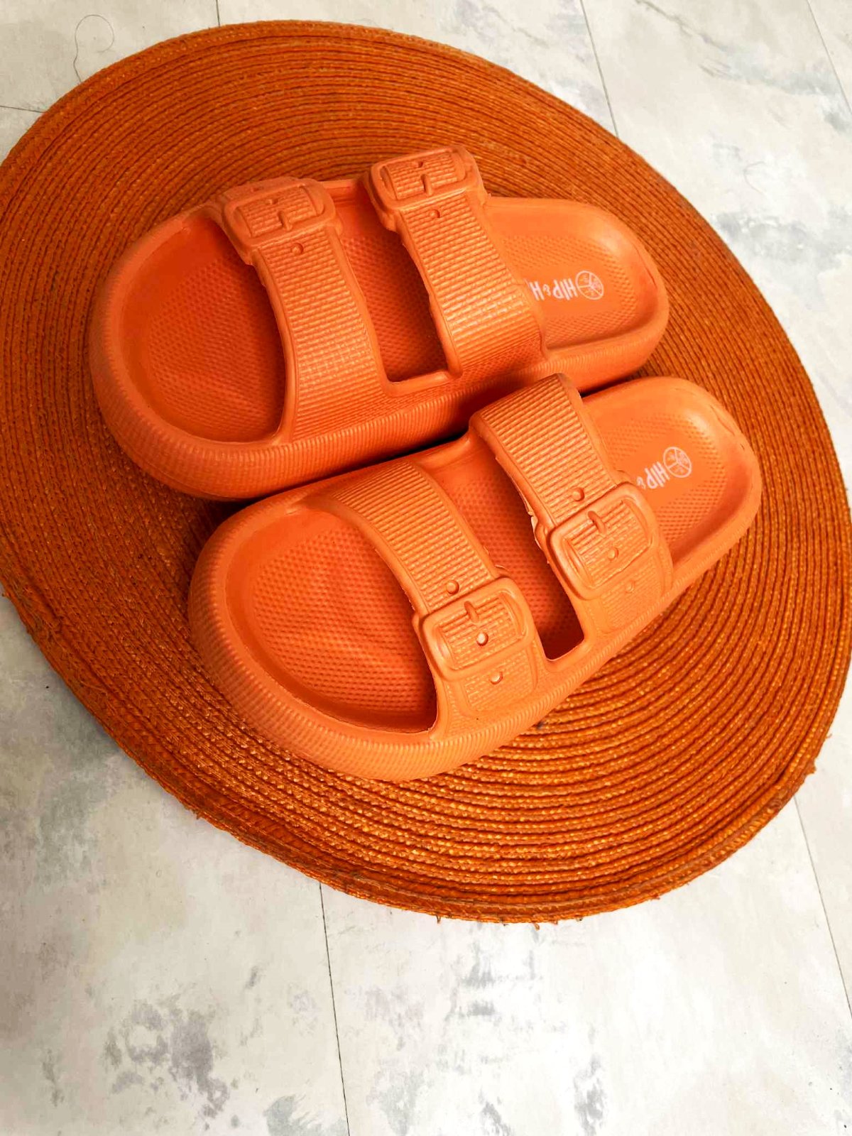 pestré sýto oranžové unisex šľapky,nešité a nelepené, z jedného kusa plastu,vkusný vzor