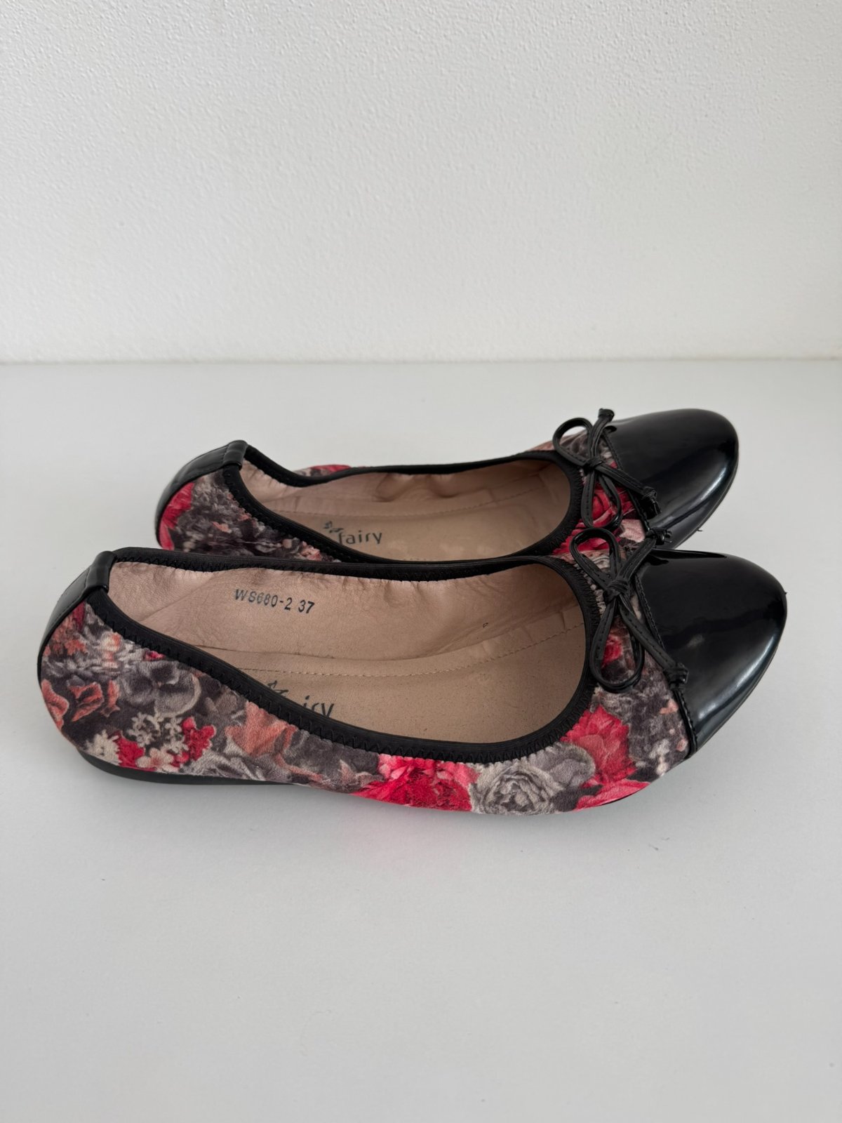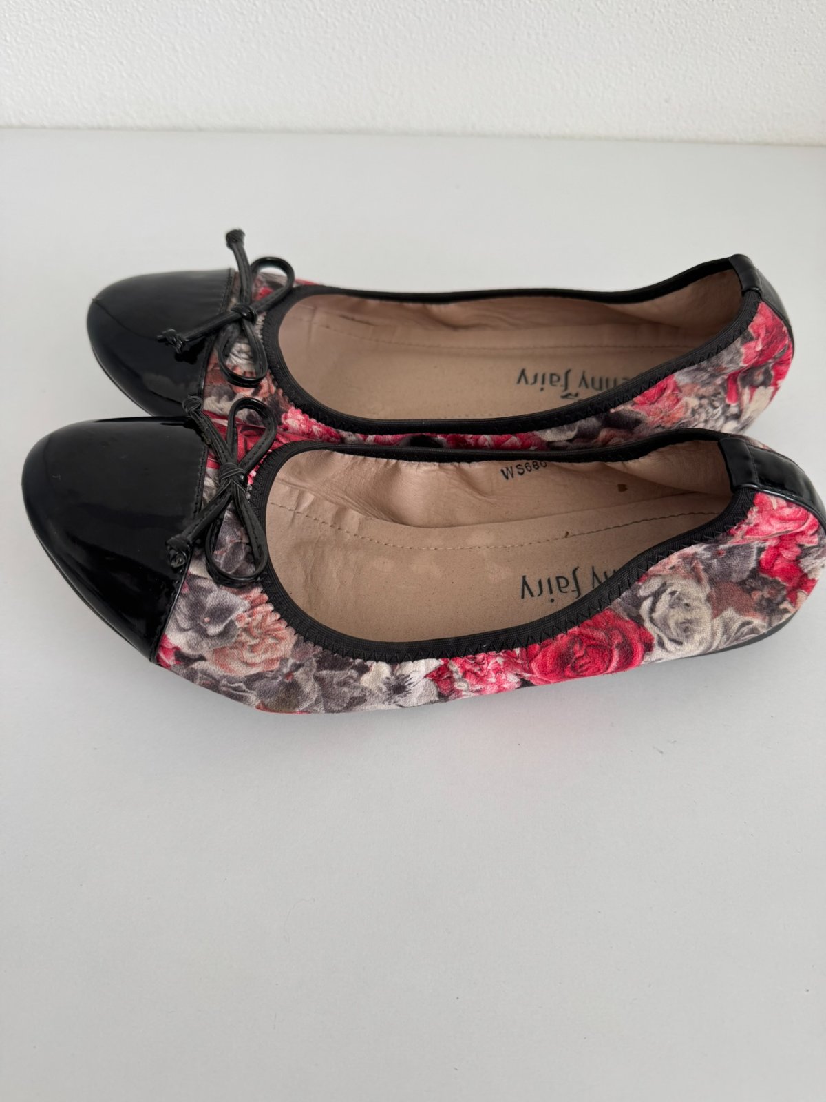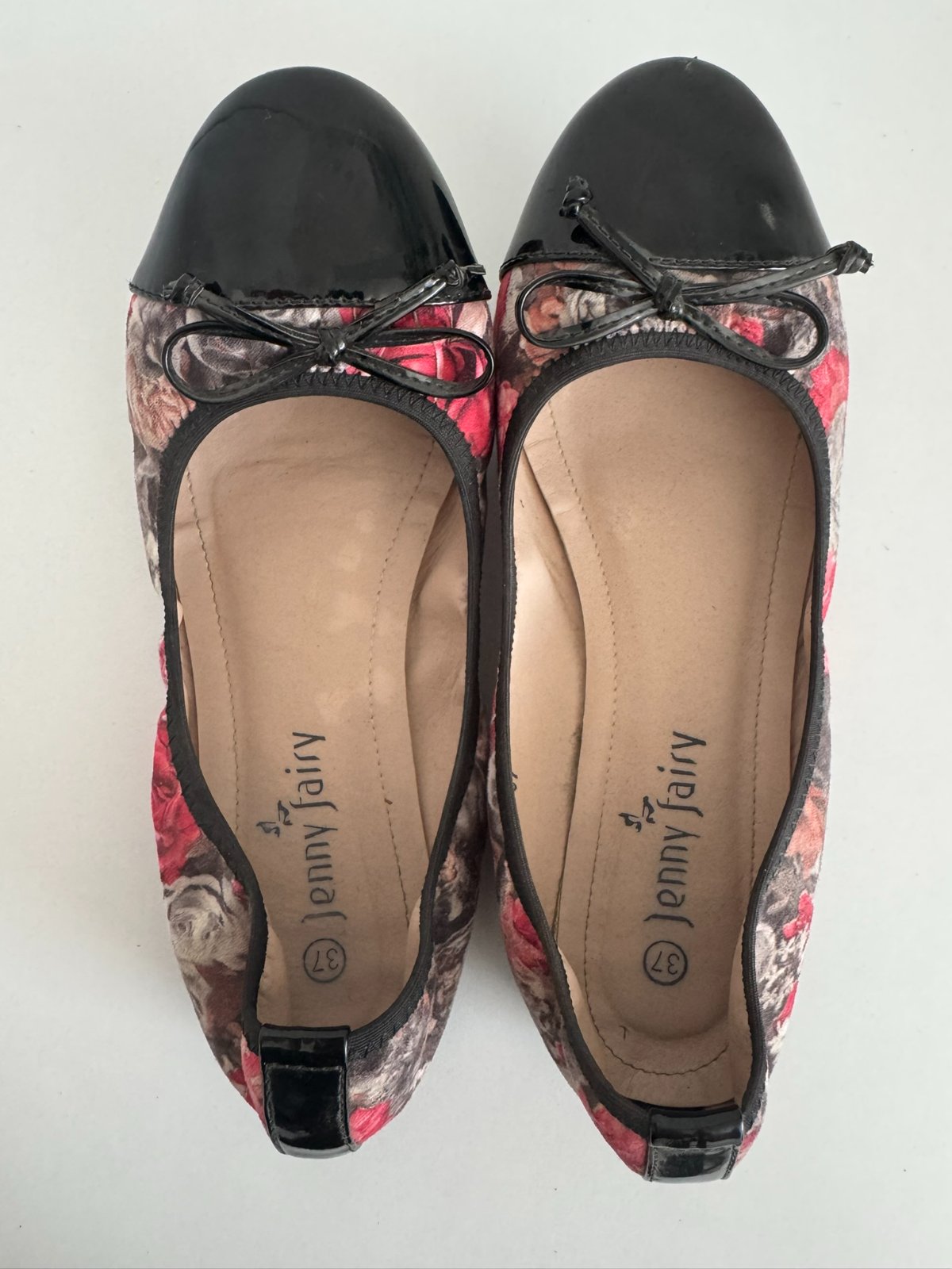 dámske baleríny v čierne farbe s červeným motívom, lesklá špička, minimálne nosené, značka Jenny Fairy