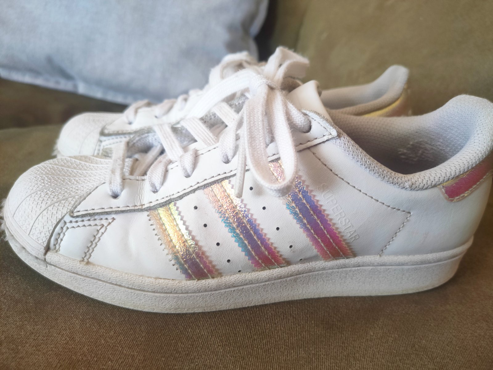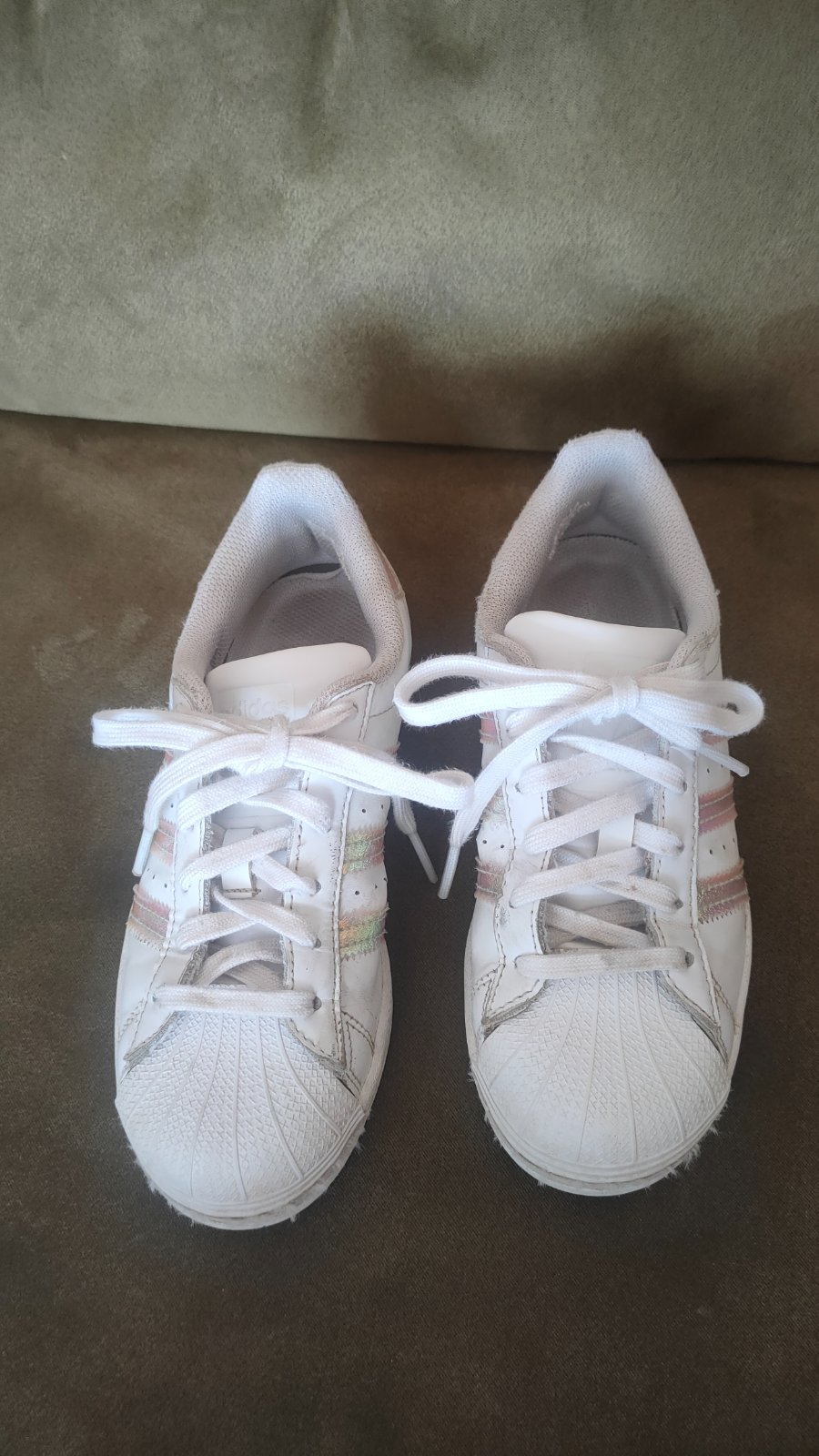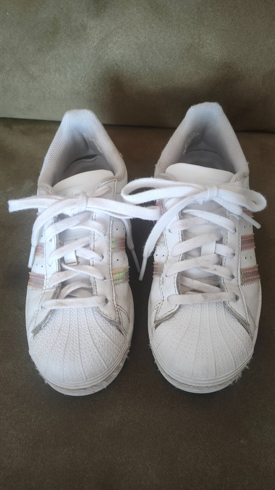Predám dcérkou nosené kožené tenisky Adidas SuperStar v bielej farbe kombinované s červenou. Sú veľmi pekné, rýchlo nám vyrástla nôžka.