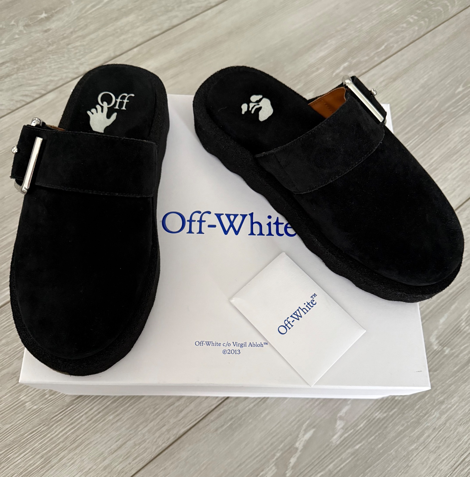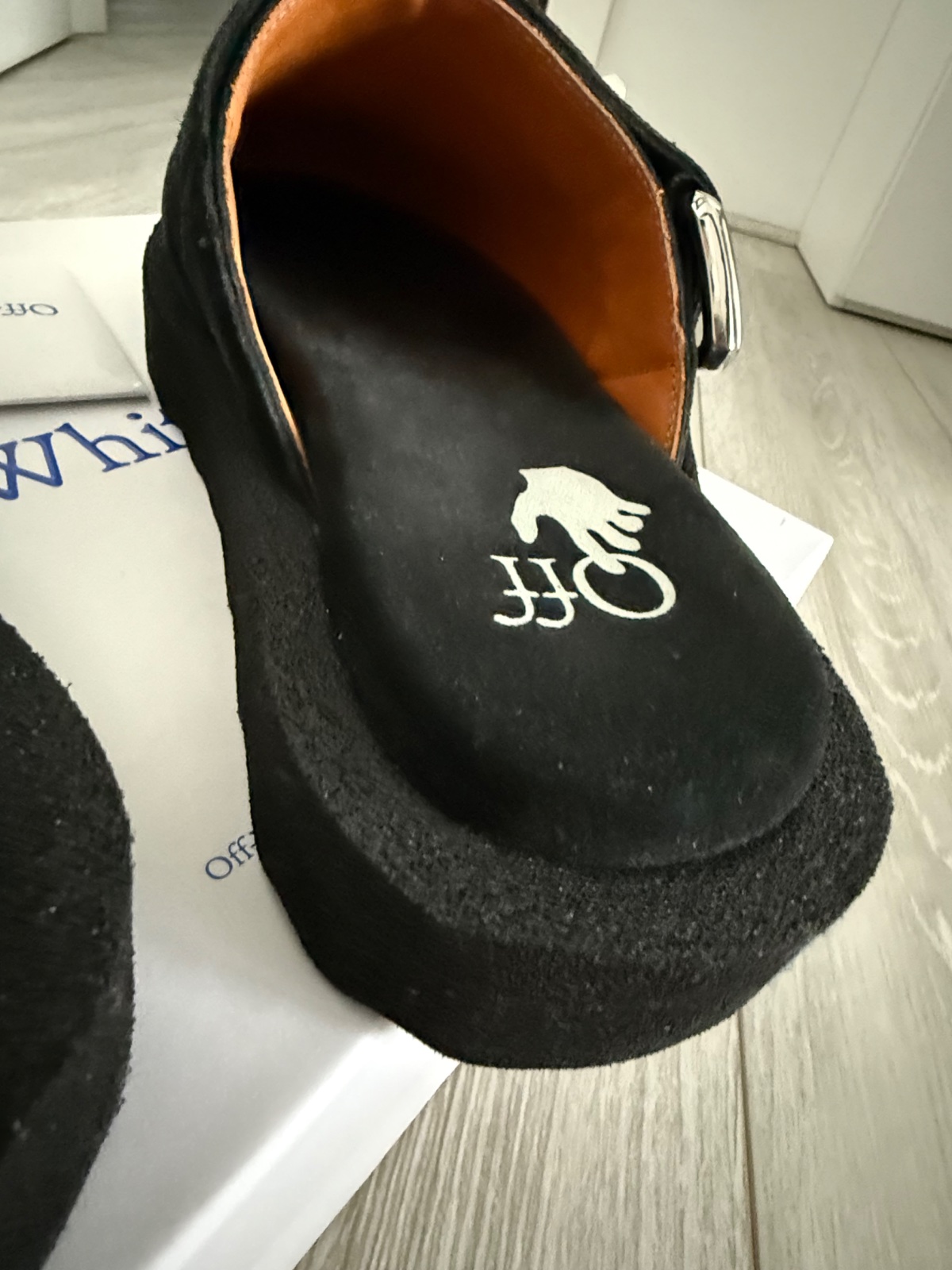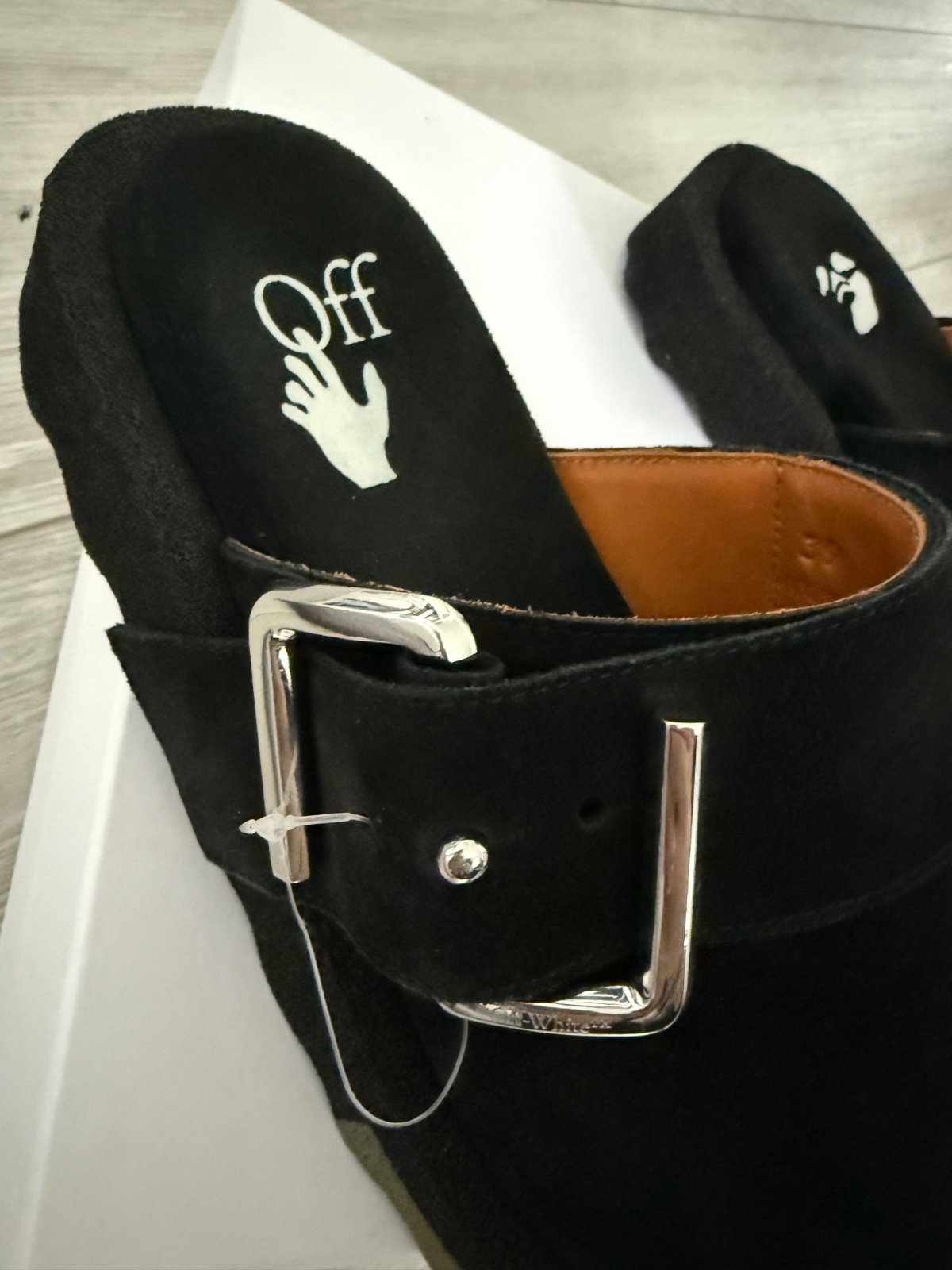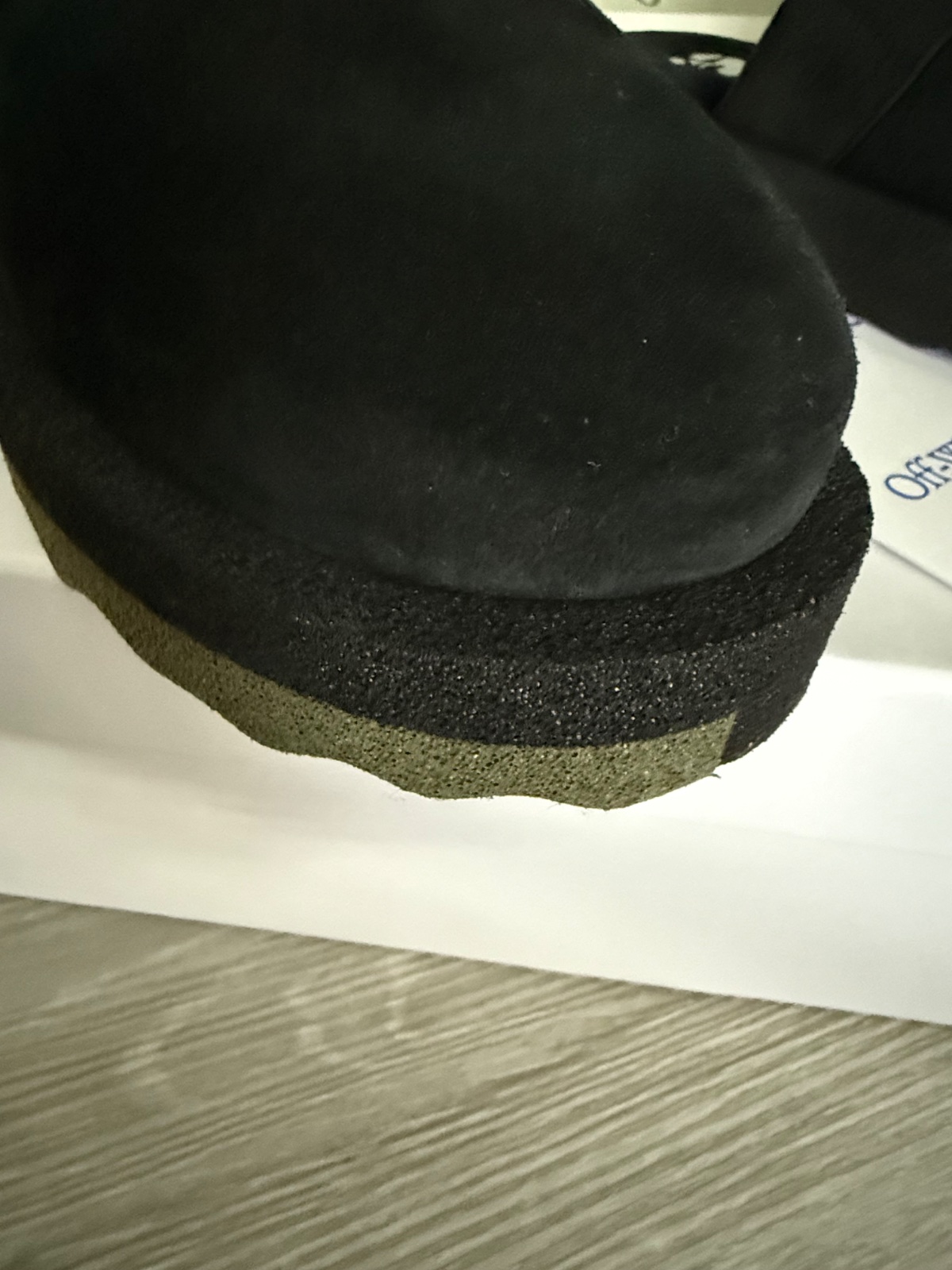 Krasne a velmi pohodlné šľapky s plnou špicou Sponge Off-White. Materiál čiena brúsená koža. Hore ozdobná funkčná pracka s logom značky. Veľkosť 39. Nové s krabicou.