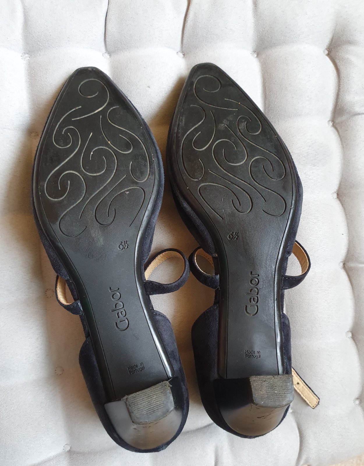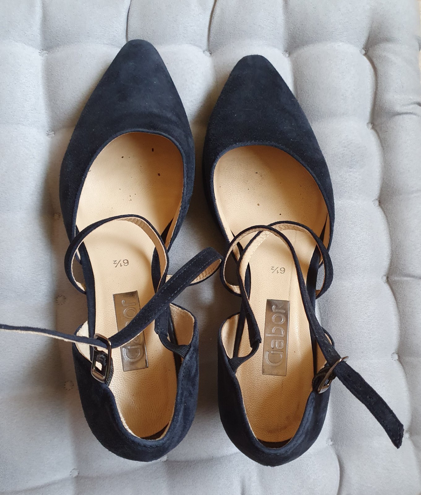 Nie sú zodrané, opätky sú plné funkčné a nízke. Zapínajú sa na remienky, takže sú vhodné aj na široké chodidlo. Tmavomodré takmer čierne.