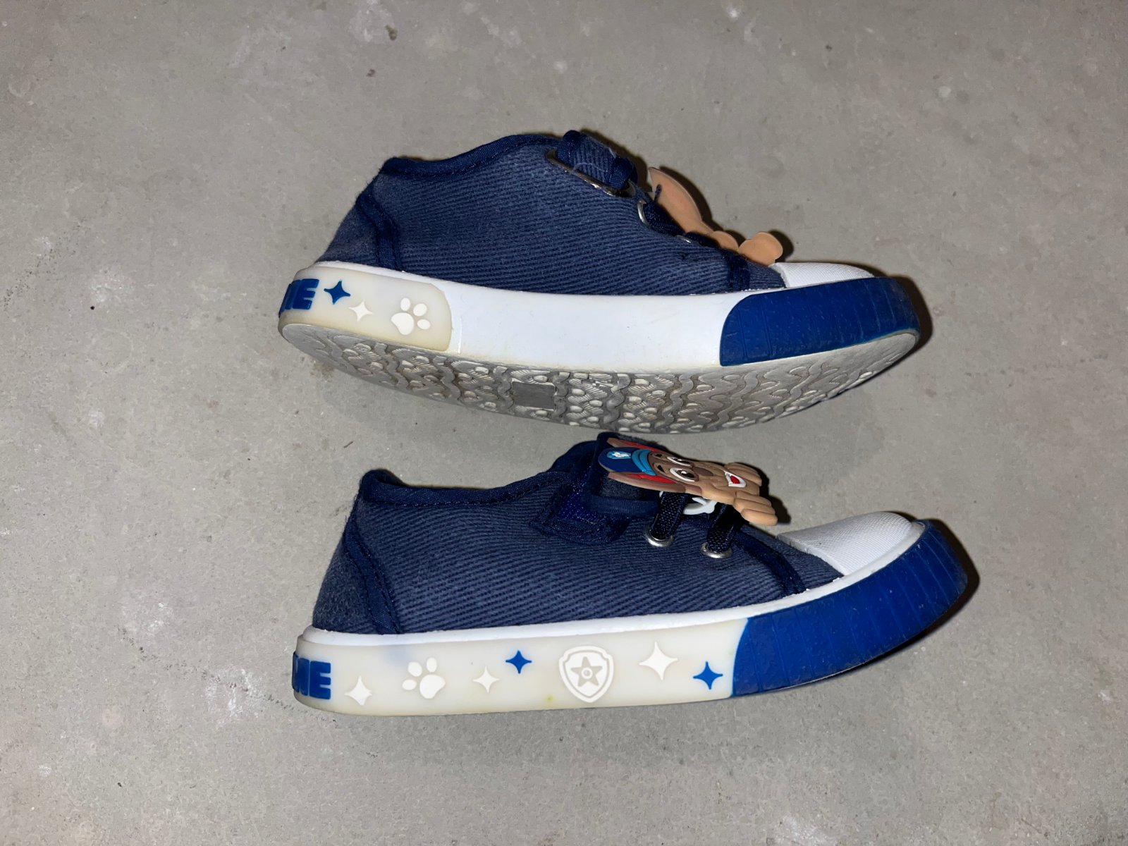 Predám plátenky paw patrol, veľkosť 24, dobrý používaný stav, zapínanie na suchý zips, elastické šnúrky, blikajúce diódy, od kúpy niekedy blikajú, niekedy nie. VD 15 cm.