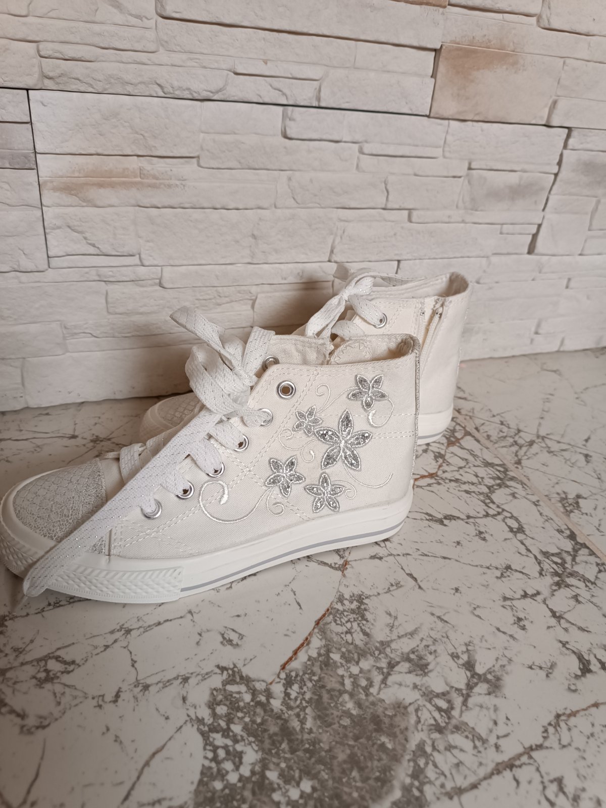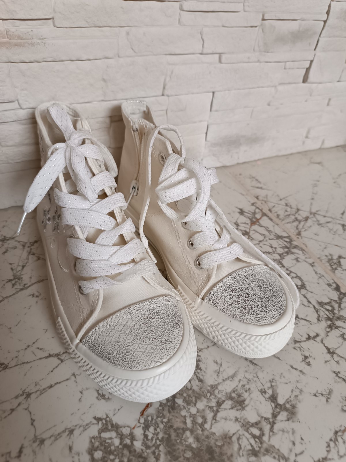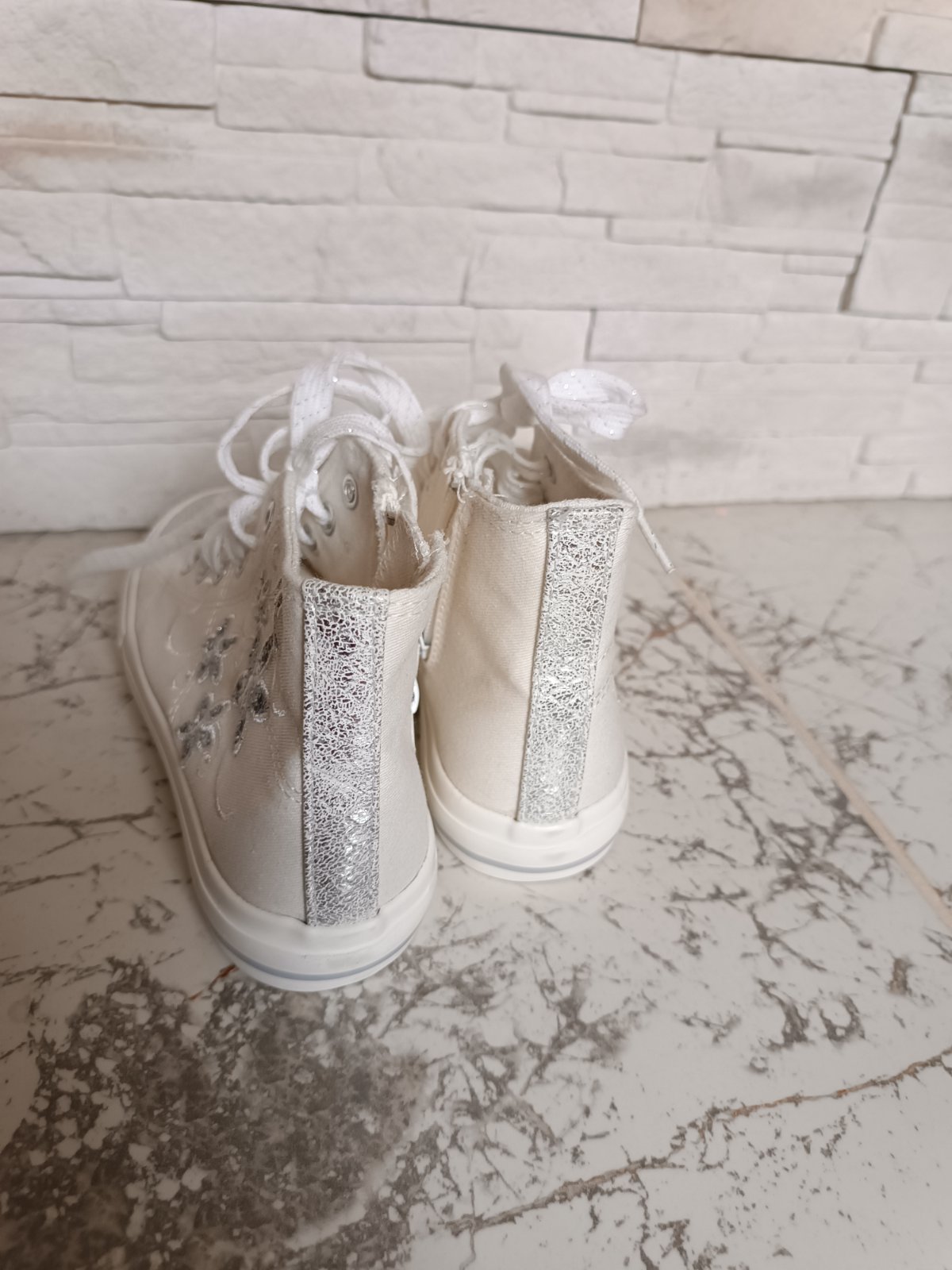 Kúpené kvôli vystúpeniu, použitie jediný krát aj to vo vnútri na pódiu, dcéra ich viac nechcela nosiť (vadilo jej členková výška). Sú ako nové! Bez poškodení. nútorná dĺžka 20 cm preto udávam veľkosť 32 ale na topánkach je označená ako 31.