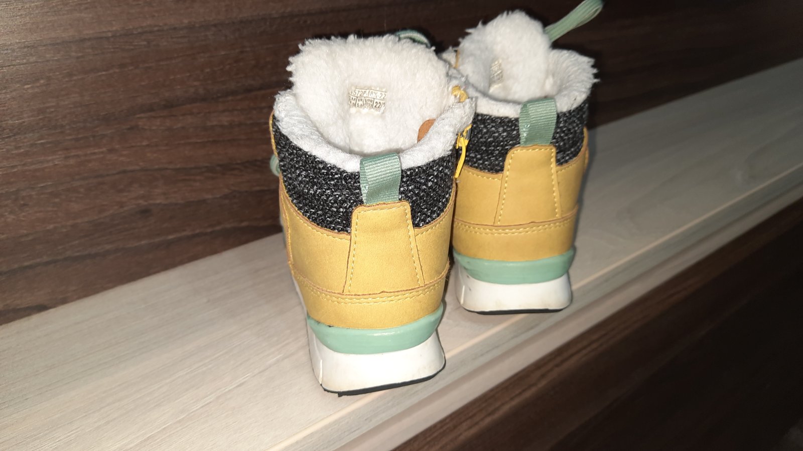 veľmi pekné a teplé topanky. veľkosť 22/23. nosený stav. na jednej je malinko oškretá špička, ale vôbec to nevadí. viď foto. zapínanie je na zips na vnútornej strane.