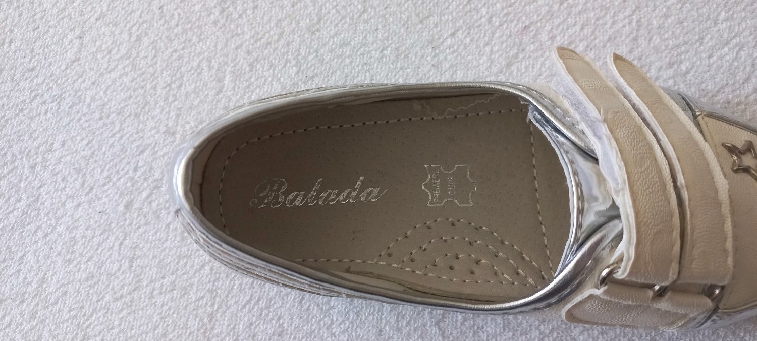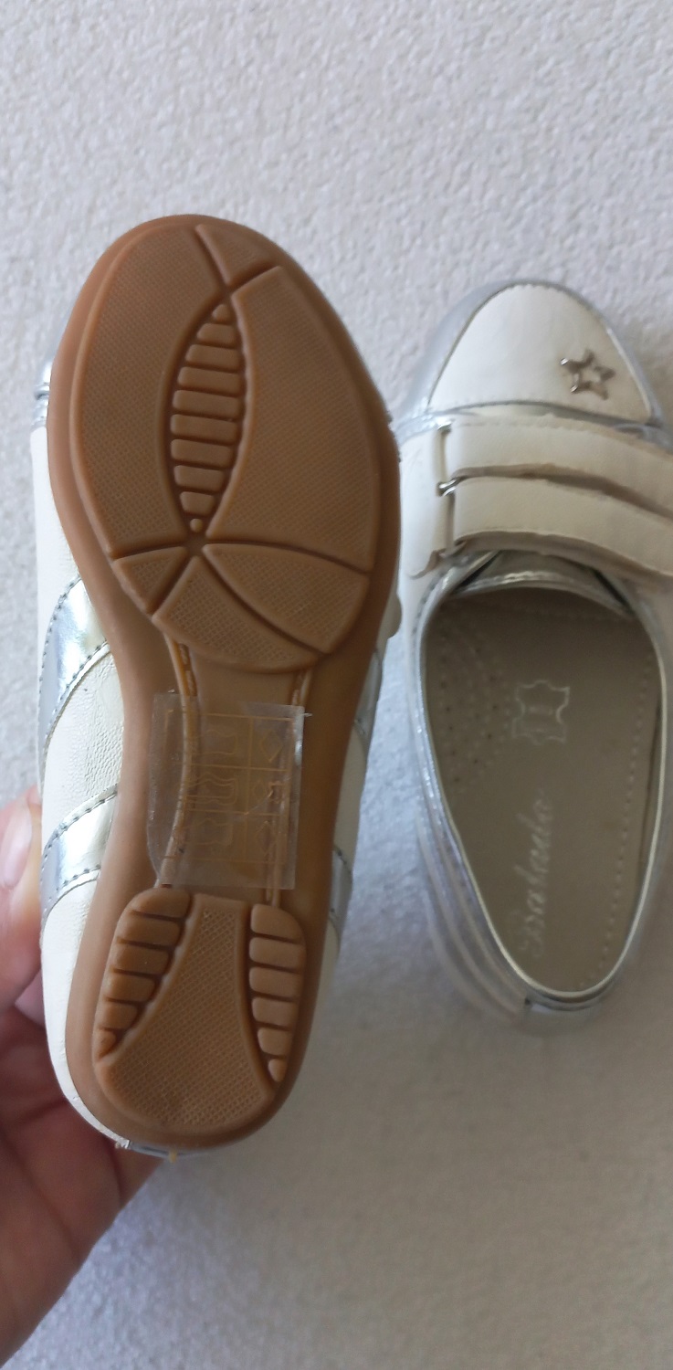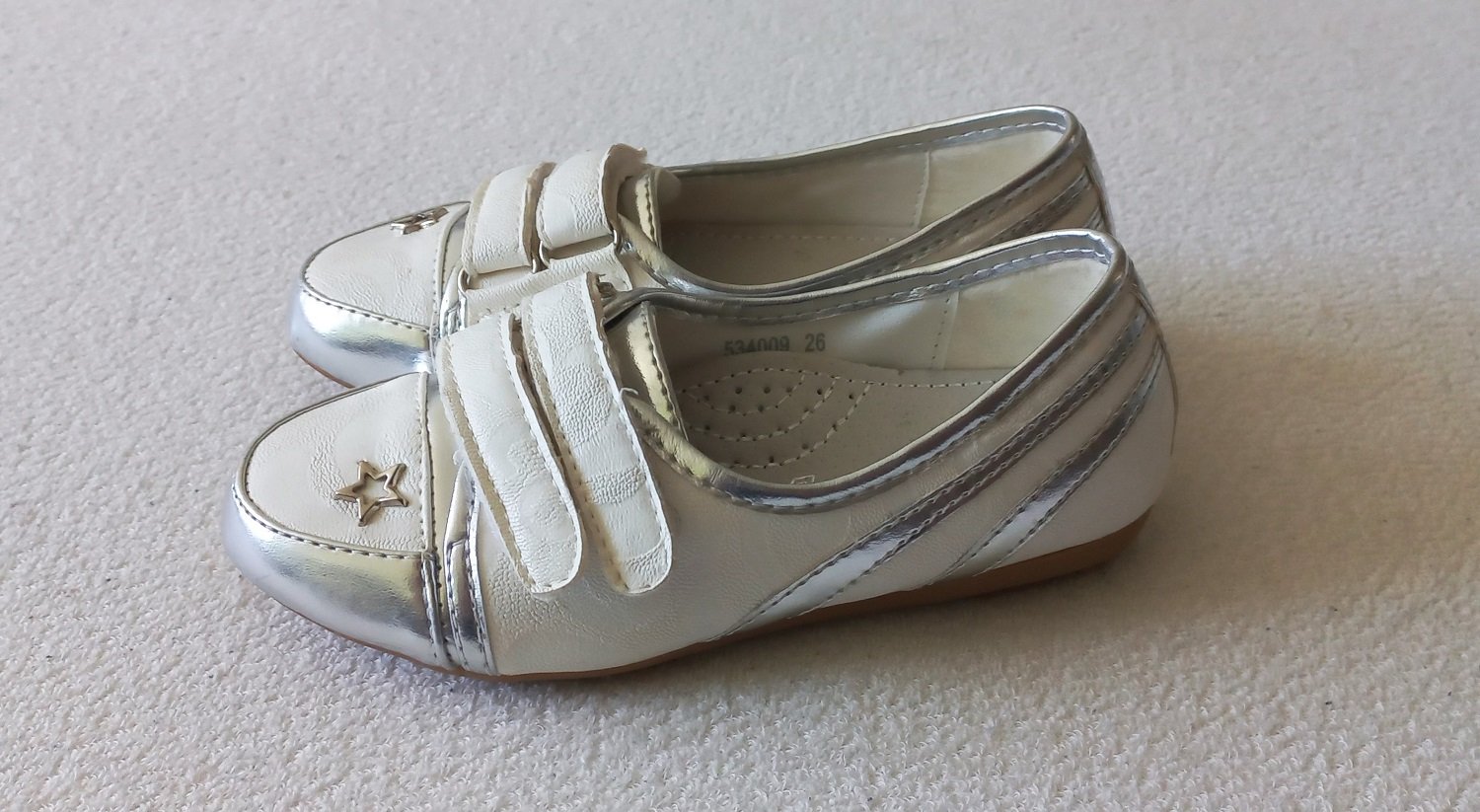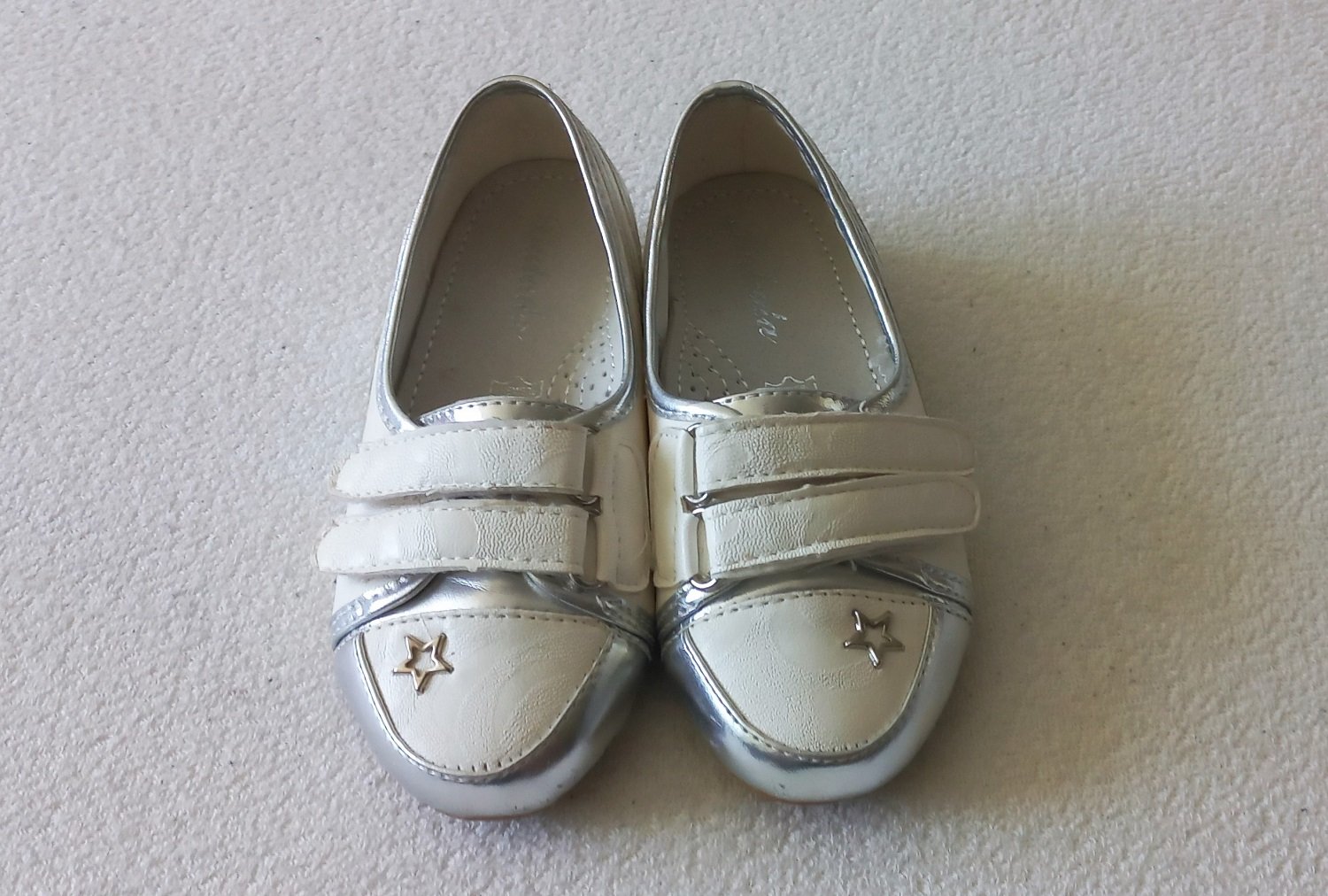 Biele balerínky so striebornými doplnkami, veľkosť 26, značka Balada. Párkrát obuté, nepoškodené. VD na foto. Máme viacero detských vecí, môžete si zostaviť vlastný balíček. Pri kúpe viac vecí, sa rada dohodnem na zľave.