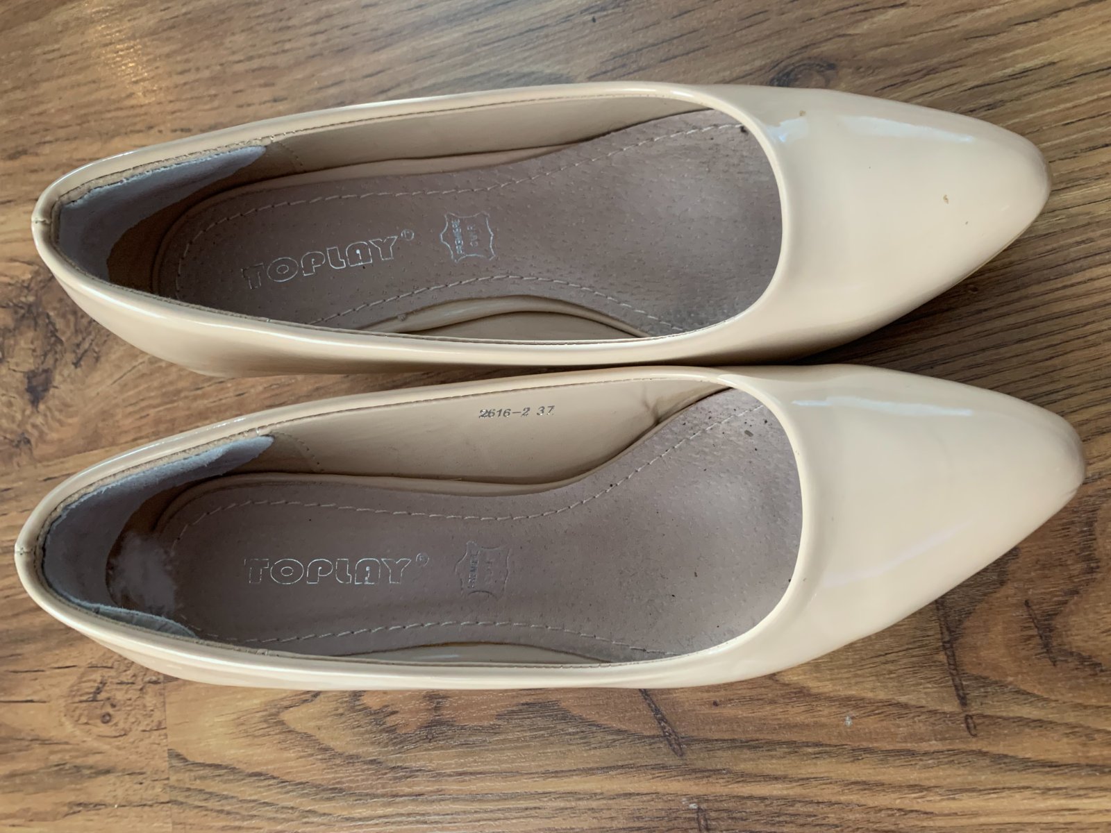 Topánočky jesenné na platforme... pieskovej farby. Remienok pôsobí na nohe elegantne, sú semišové a majú znamky pouzivania od kamienou. Zohľadnené v cene. Pri nosení to nie je vidieť nakoľko je to ...