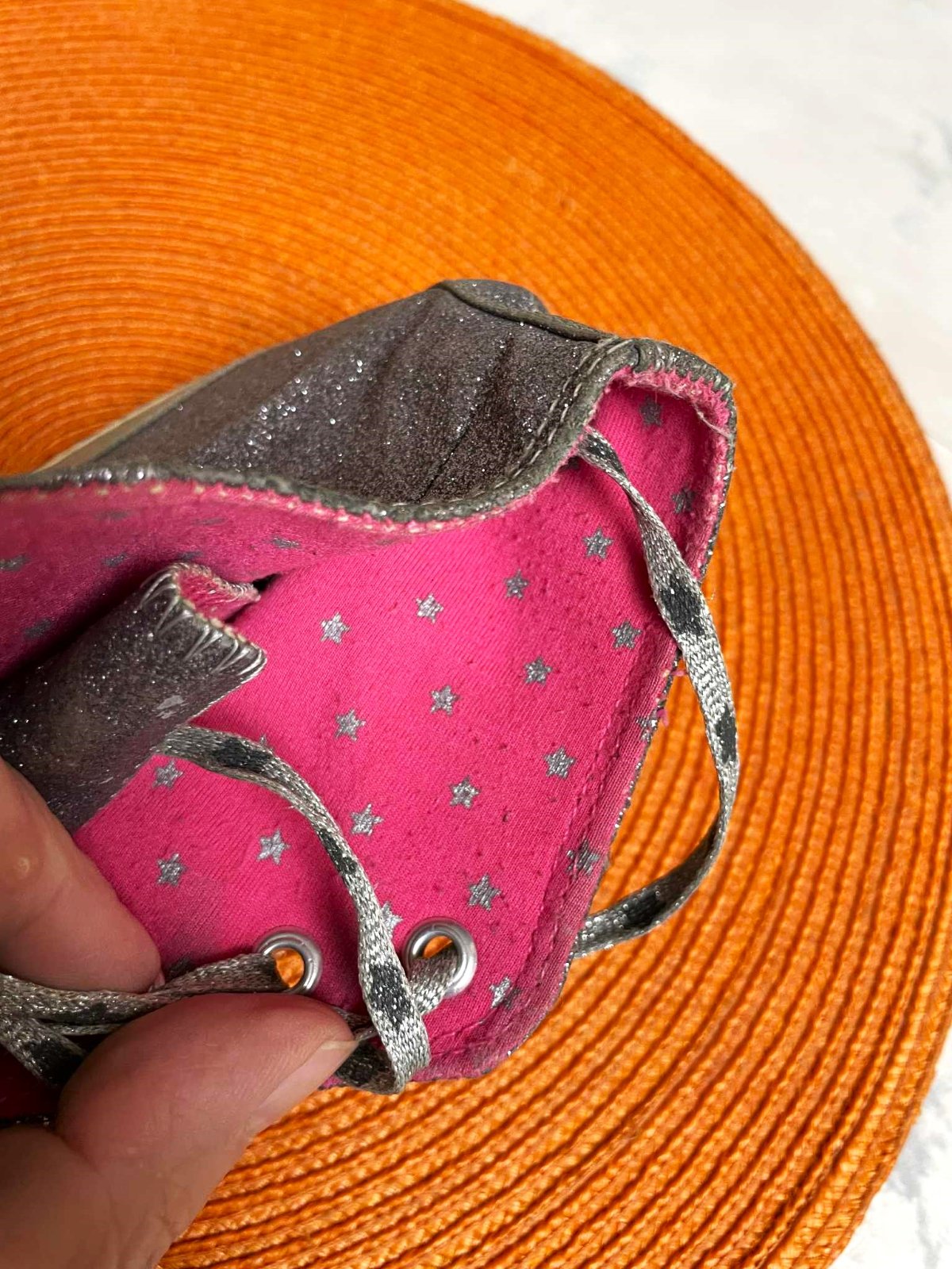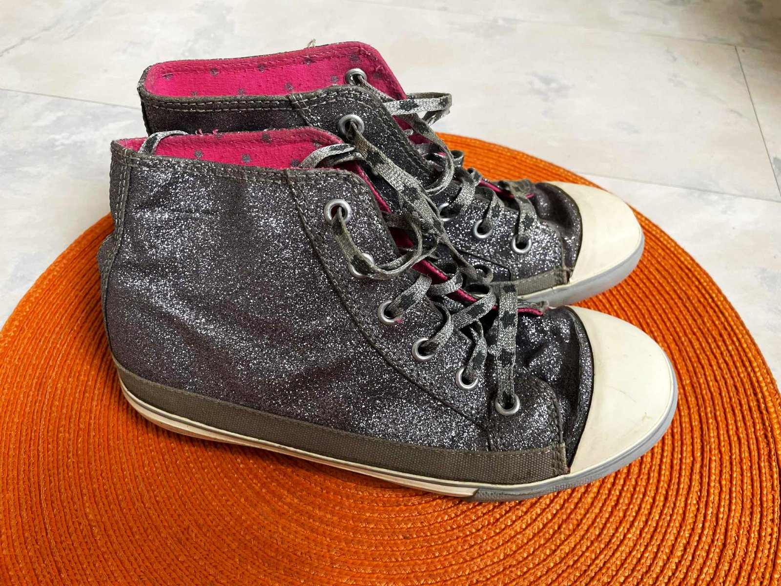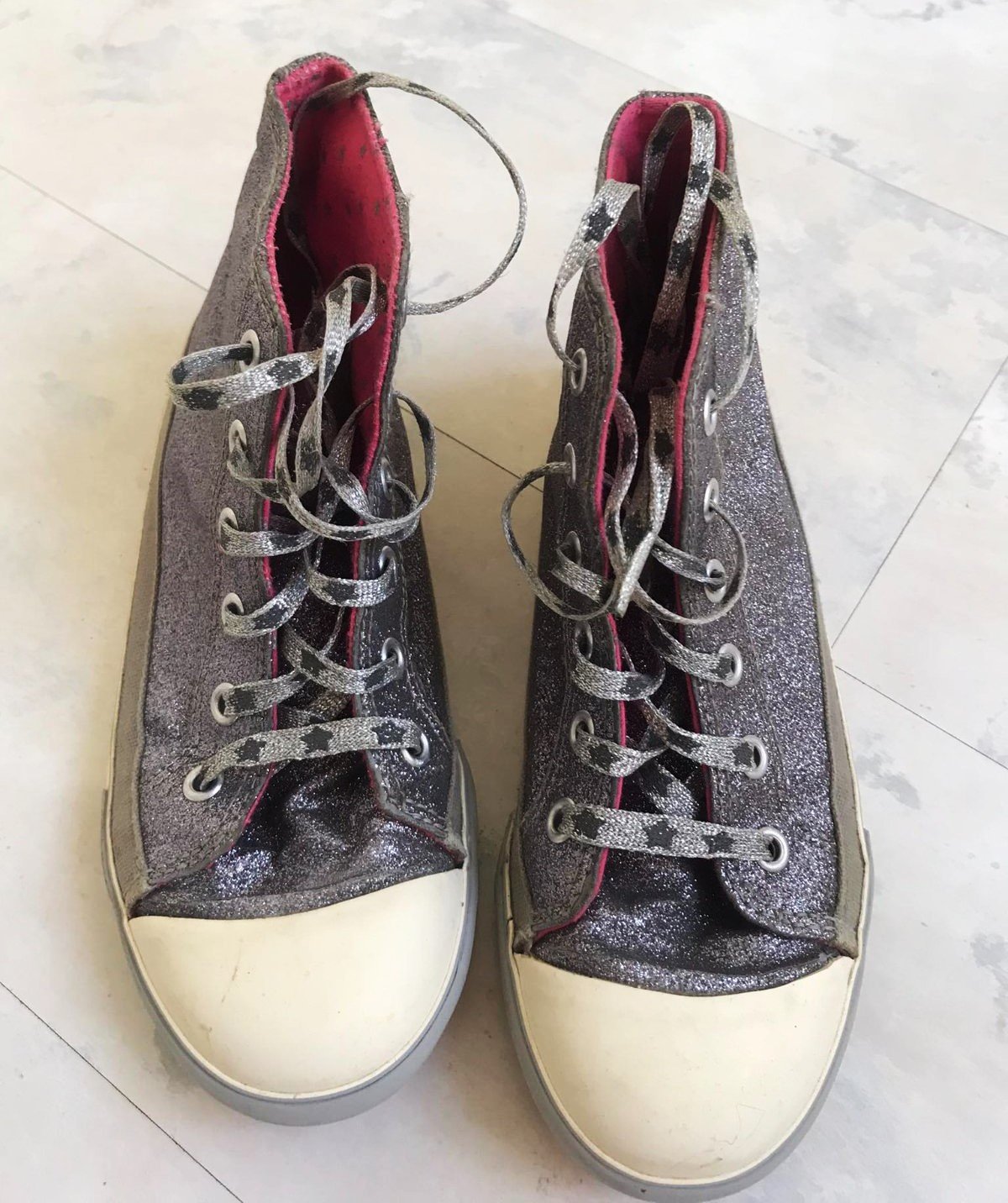 lurexové kotníkové tenisky - aj šnúrky sú lurexové,vnútro ružové so striebornými hviezdičkami,originál Next, vnútorná dlžka 22 cm až 22,5 cm, ( je to anglické číslo 2 )