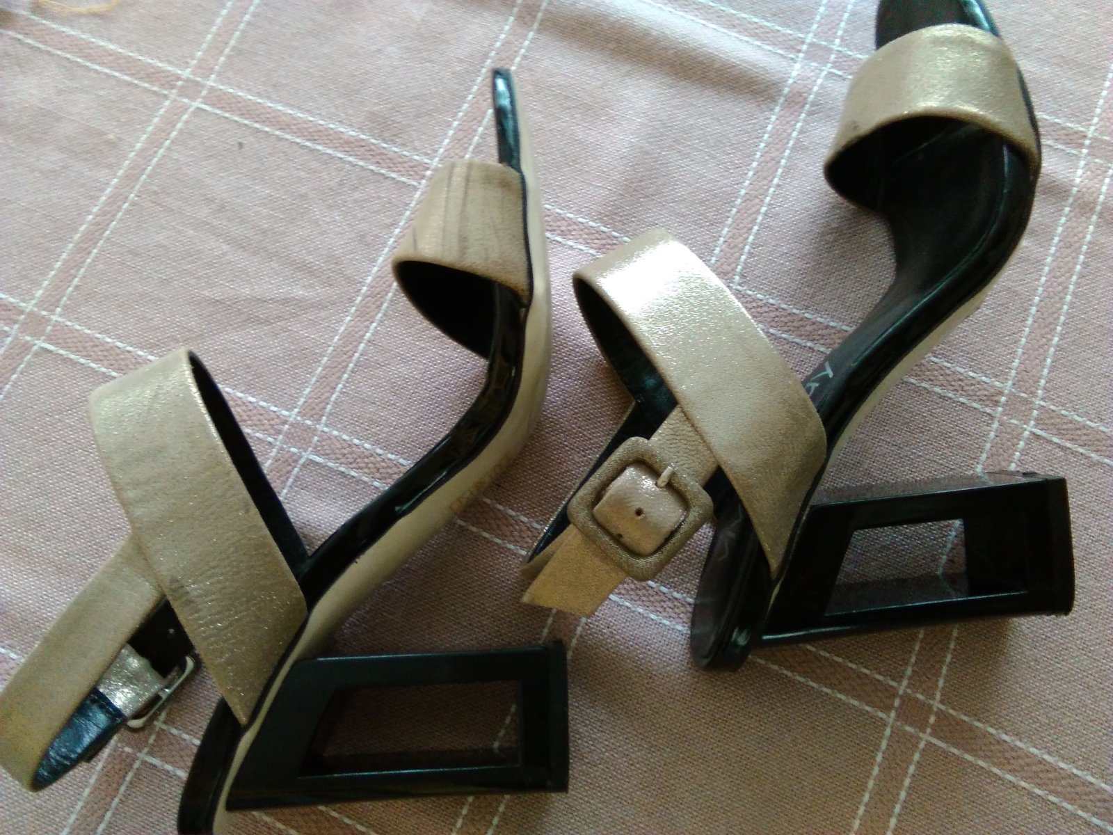 Dizajnovo-zaujímavé sandále, dvakrát obutè,vnútorná dĺžka 24cm,opätok 9 cm,na ľavej zaskrabnutè opätkom-zohľadnené v cene