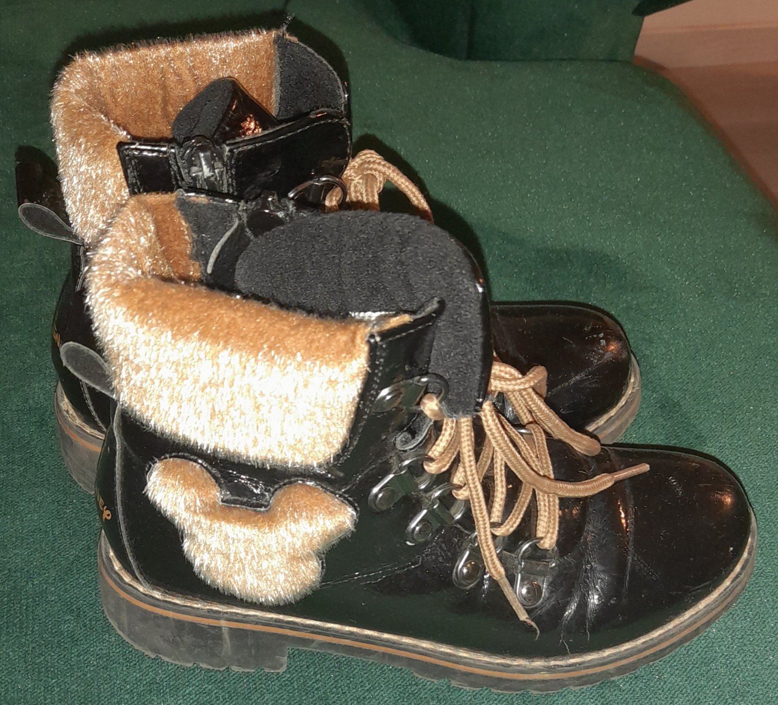 Predám lakované mierne zateplené topanky, sem tam škrabance,, ale len také jemné, nedá sa tomu zabrániť. Zapínanie na boku na zips, vpredu na šnurovanie. Veľkosť 32, vnútorná dĺžka cca 21,5cm.
