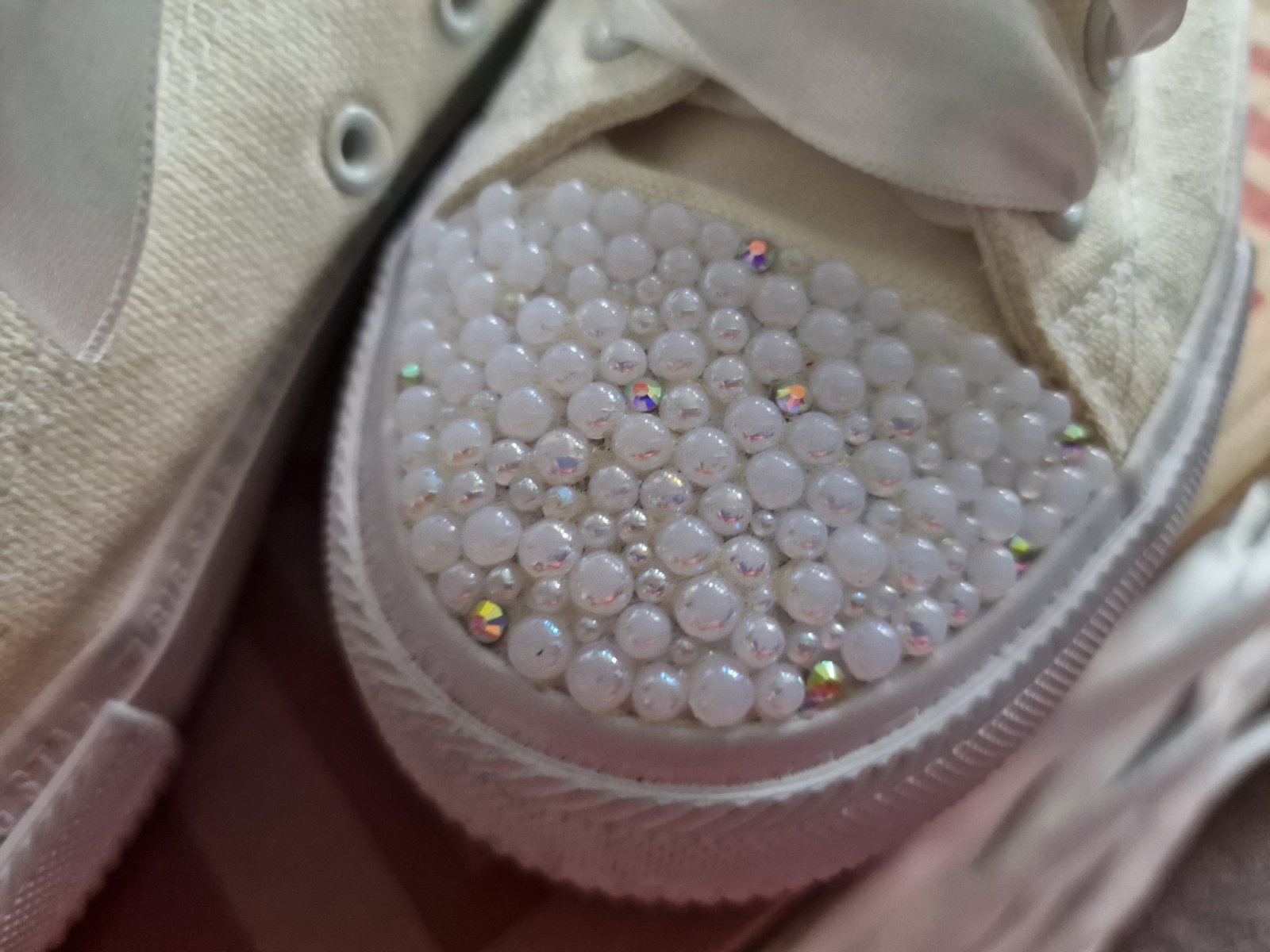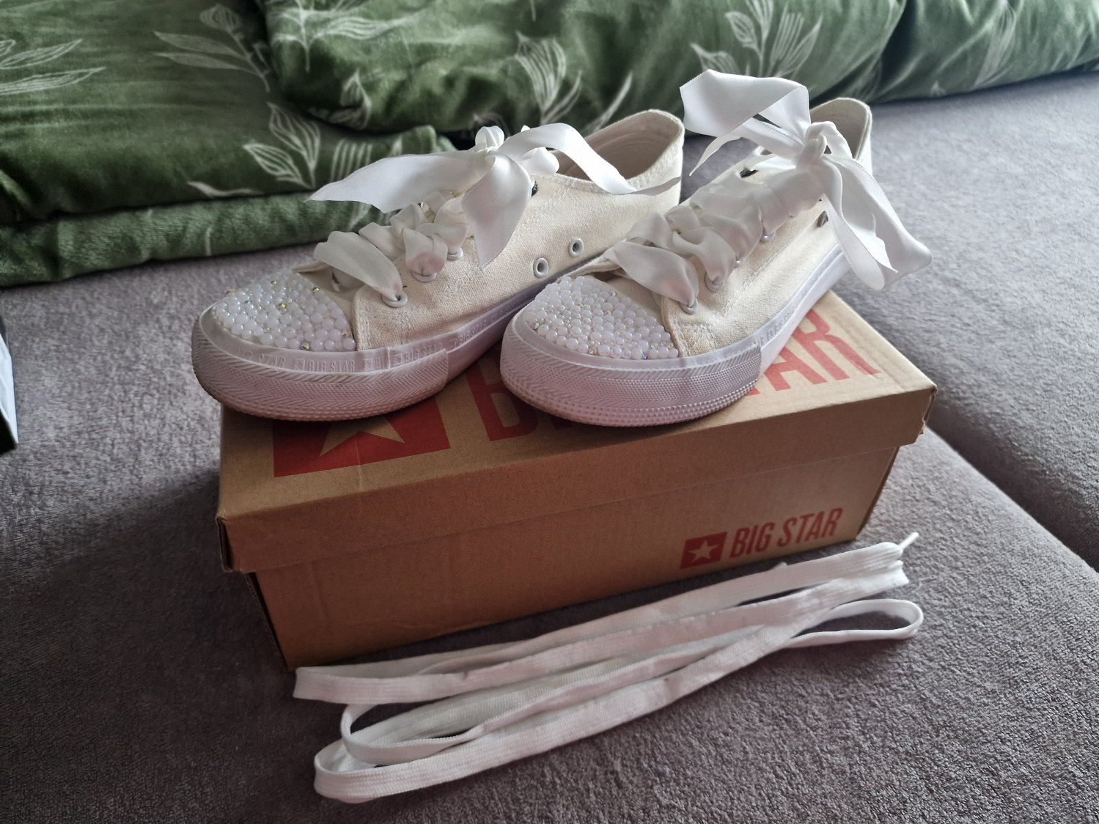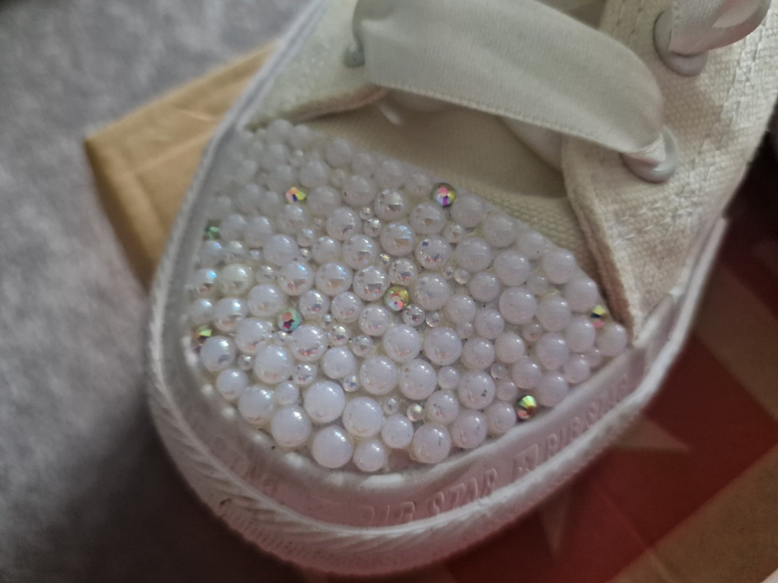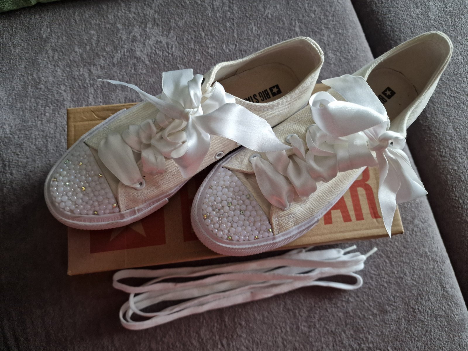Nemaju poskodenie. Nosene jednorazovo, tym ale ze boli zo 2 roky zabudnute v krabici, zozltli, povodne neboli uplne snehovobiele, ale urcite belsie. Maju stuhy na vymenu. Za snurky.