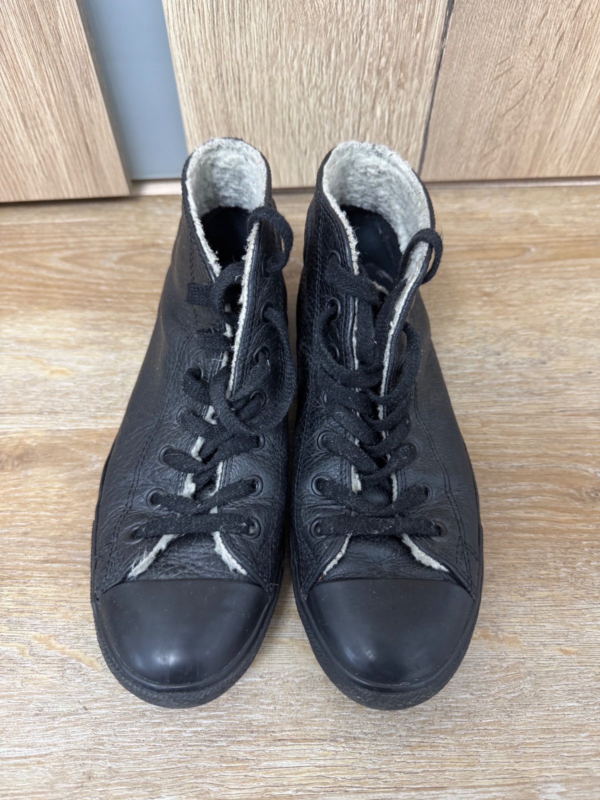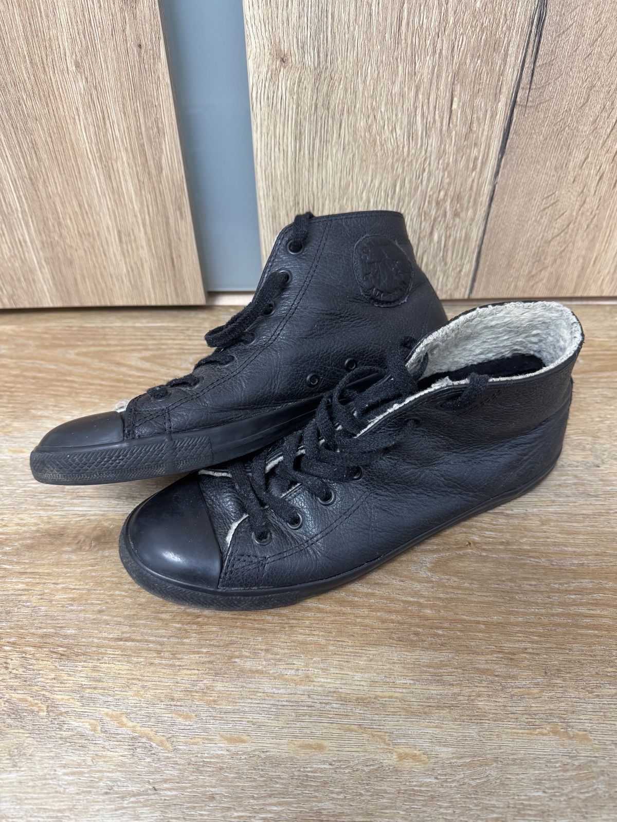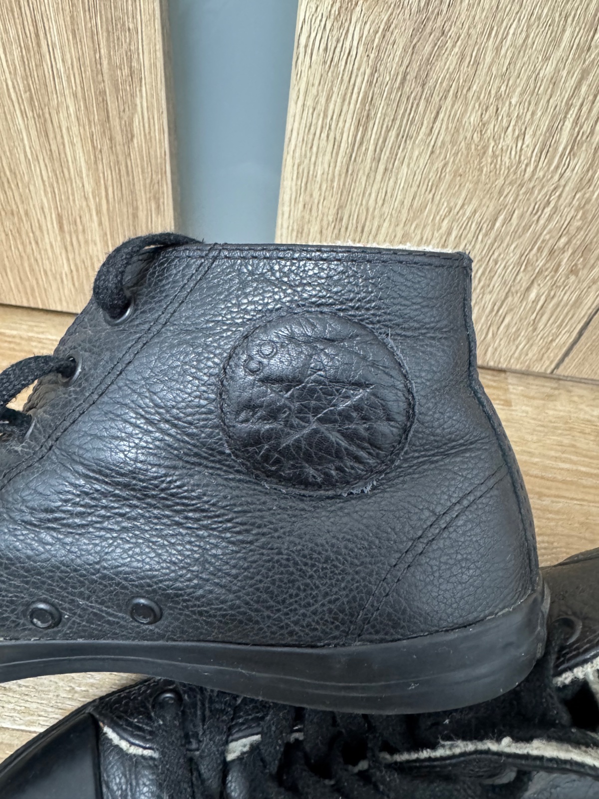 Ponúkam pekné čierne conversky. Sú kožené, takže čo to vydržia;) Veľkosť je uvedená 40 na 25,5cm ale ja mám 25,5cm a trolilinku cítim, takže odporúčam na nohu tak od cca 25 do max. 25,4cm:) Preto uvádzam 39,5. Boli sem-tam nosené, naďalej v peknom stave. Poštovné podľa taríf.