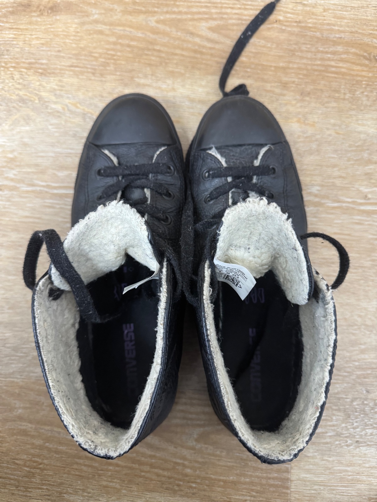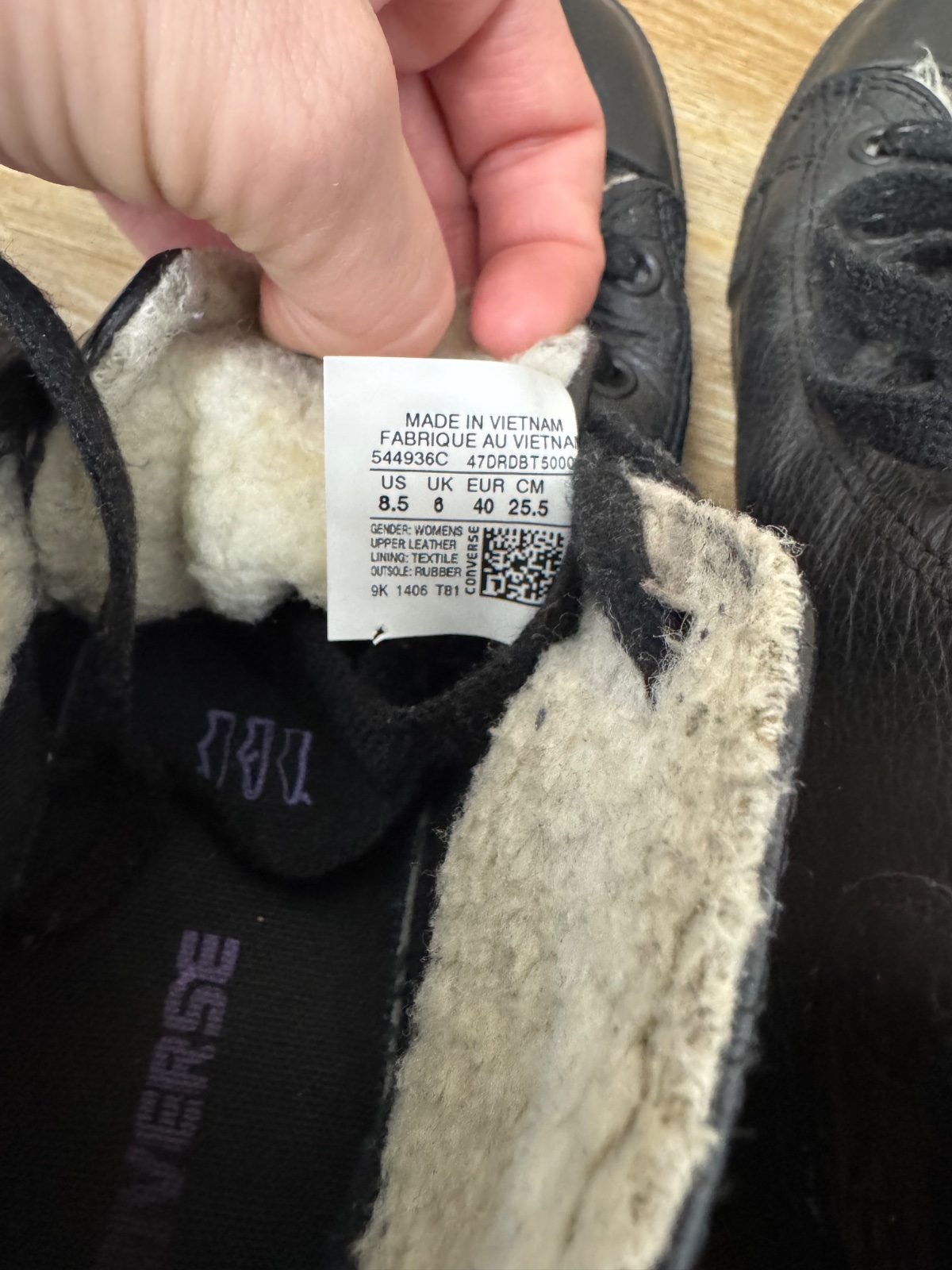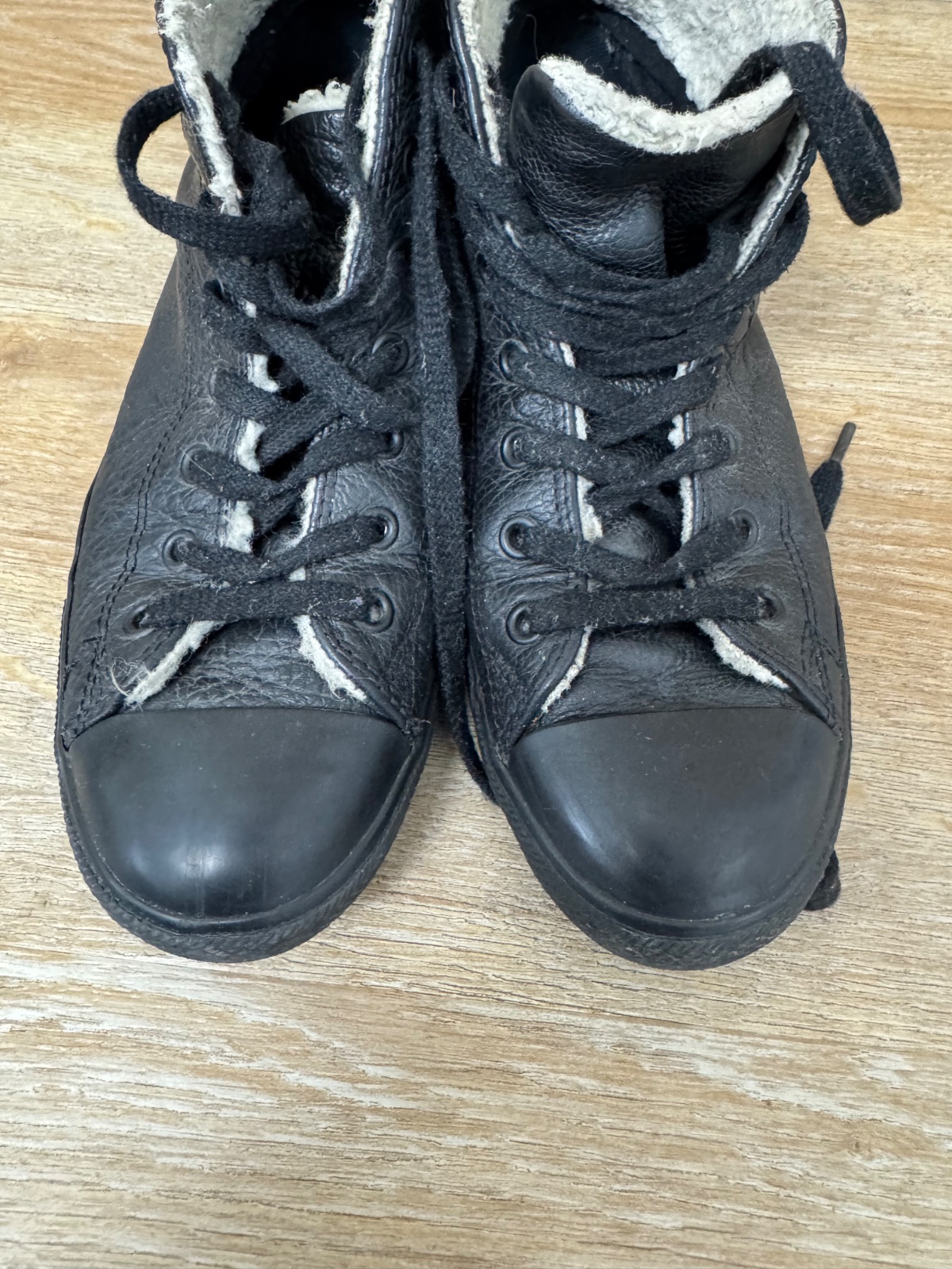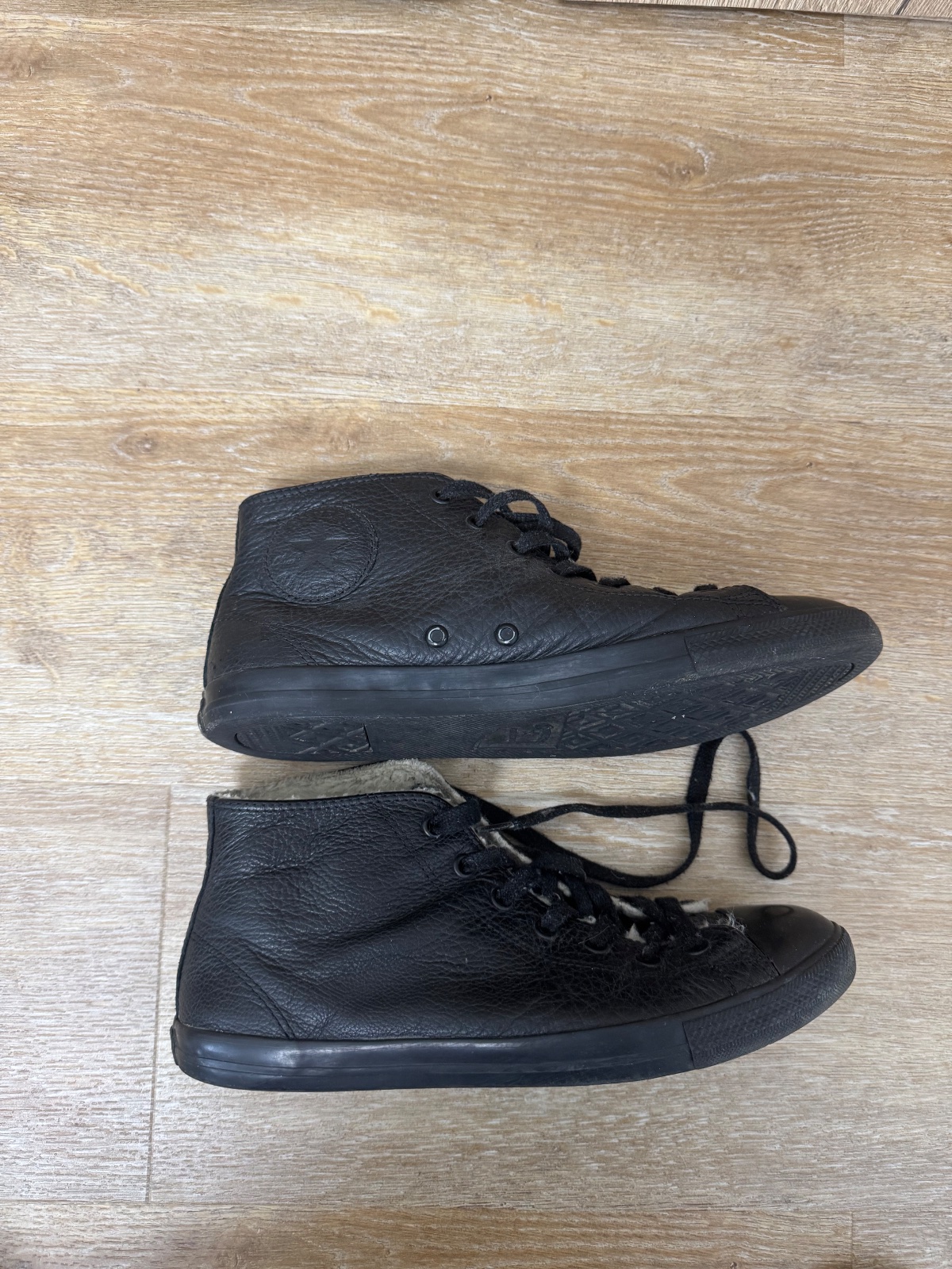 Ponúkam pekné čierne conversky. Sú kožené, takže čo to vydržia;) Veľkosť je uvedená 40 na 25,5cm ale ja mám 25,5cm a trolilinku cítim, takže odporúčam na nohu tak od cca 25 do max. 25,4cm:) Preto uvádzam 39,5. Boli sem-tam nosené, naďalej v peknom stave. Poštovné podľa taríf.