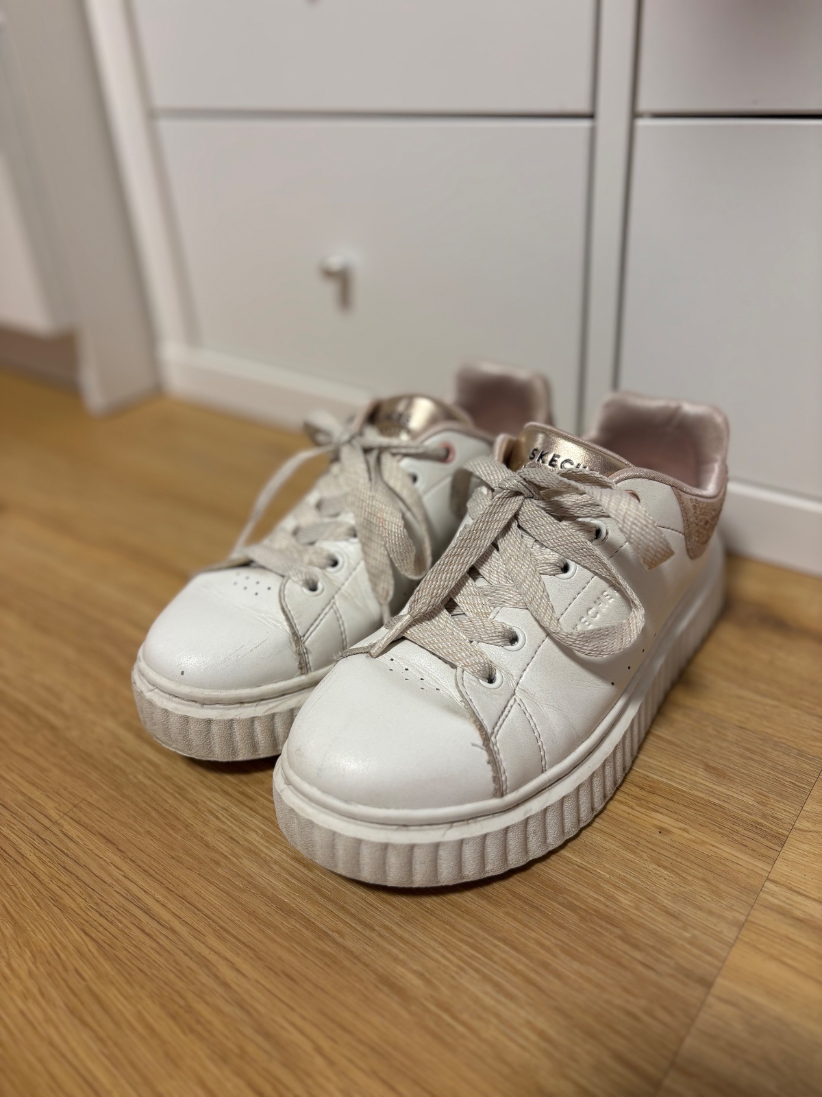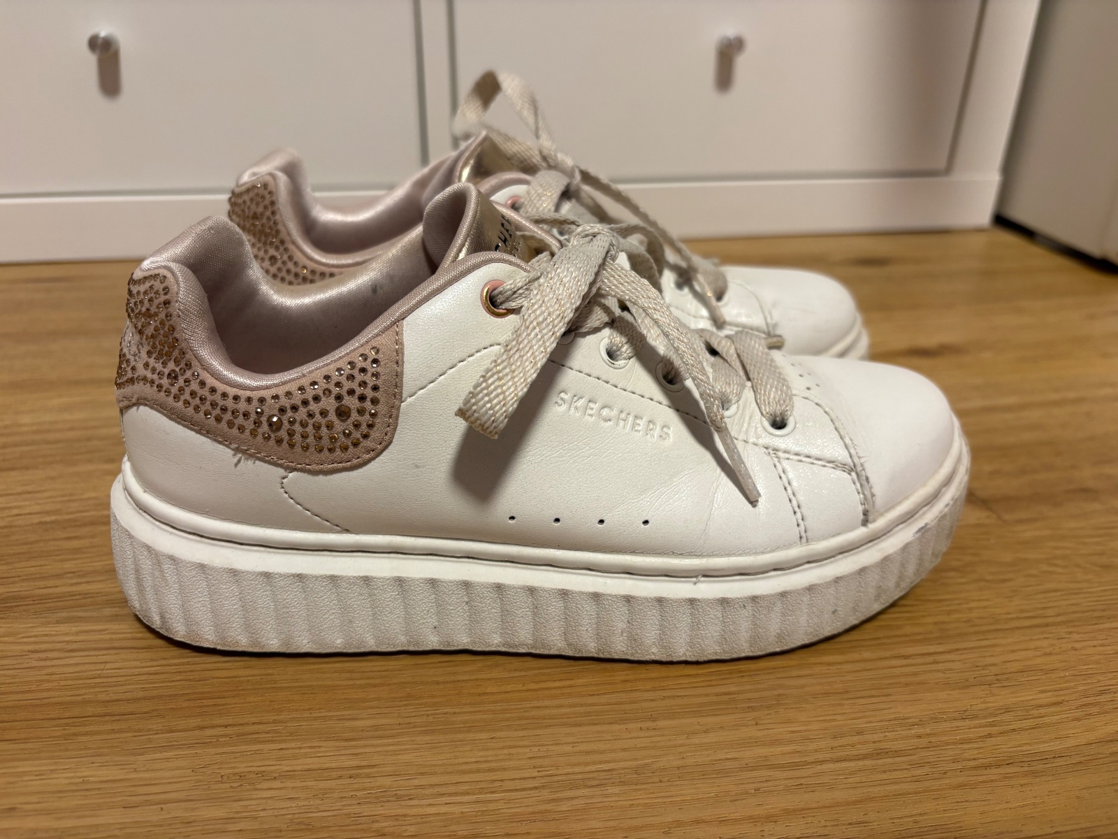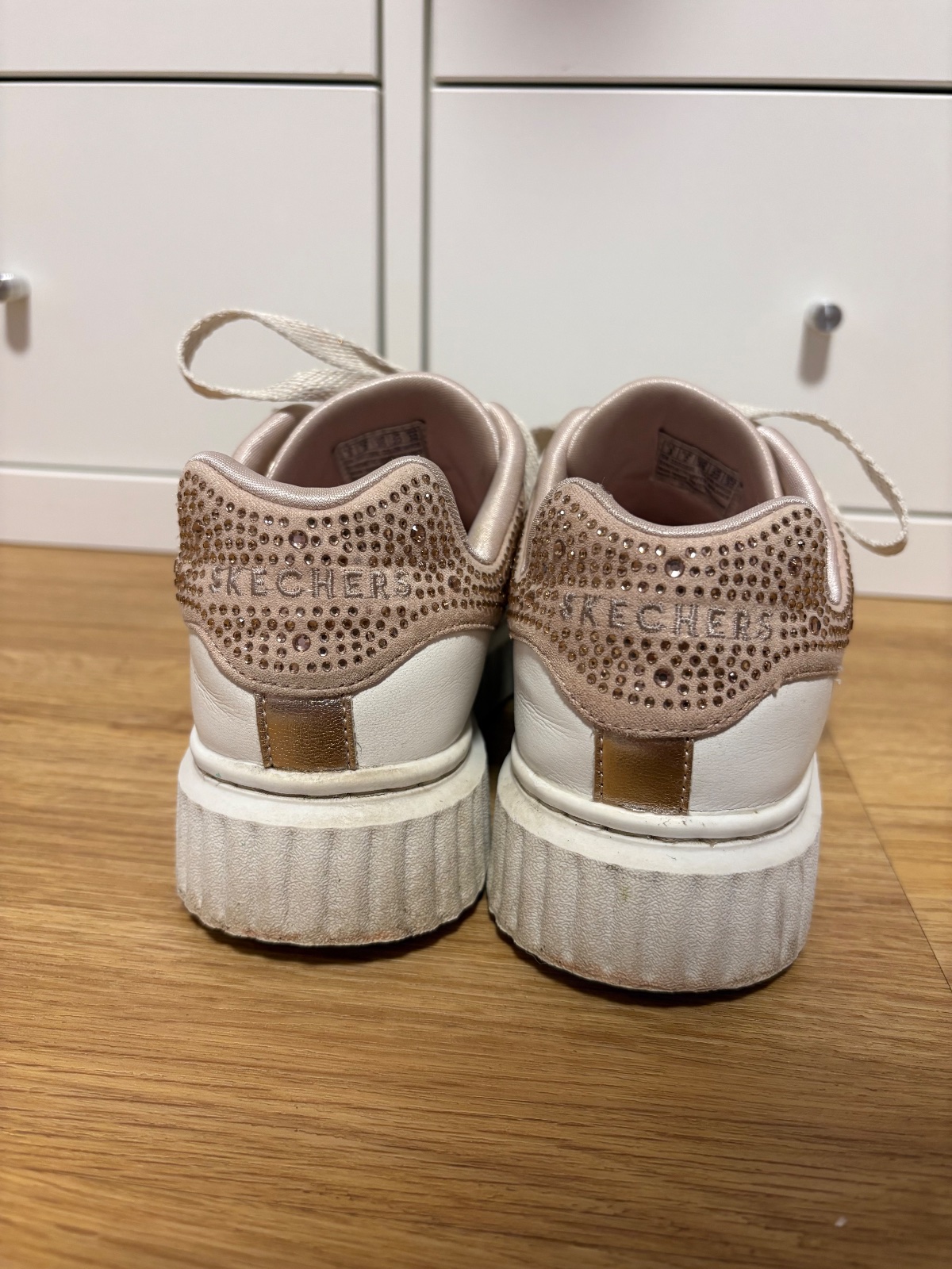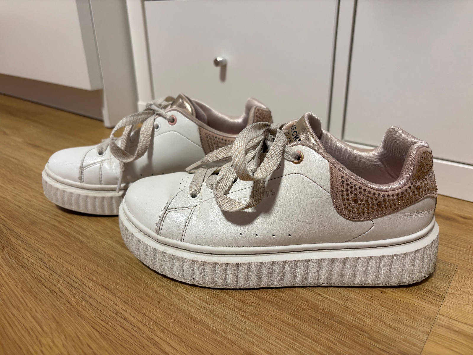 Bílé tenisky na zvýšené podrážce, růžové kamínky na patě.