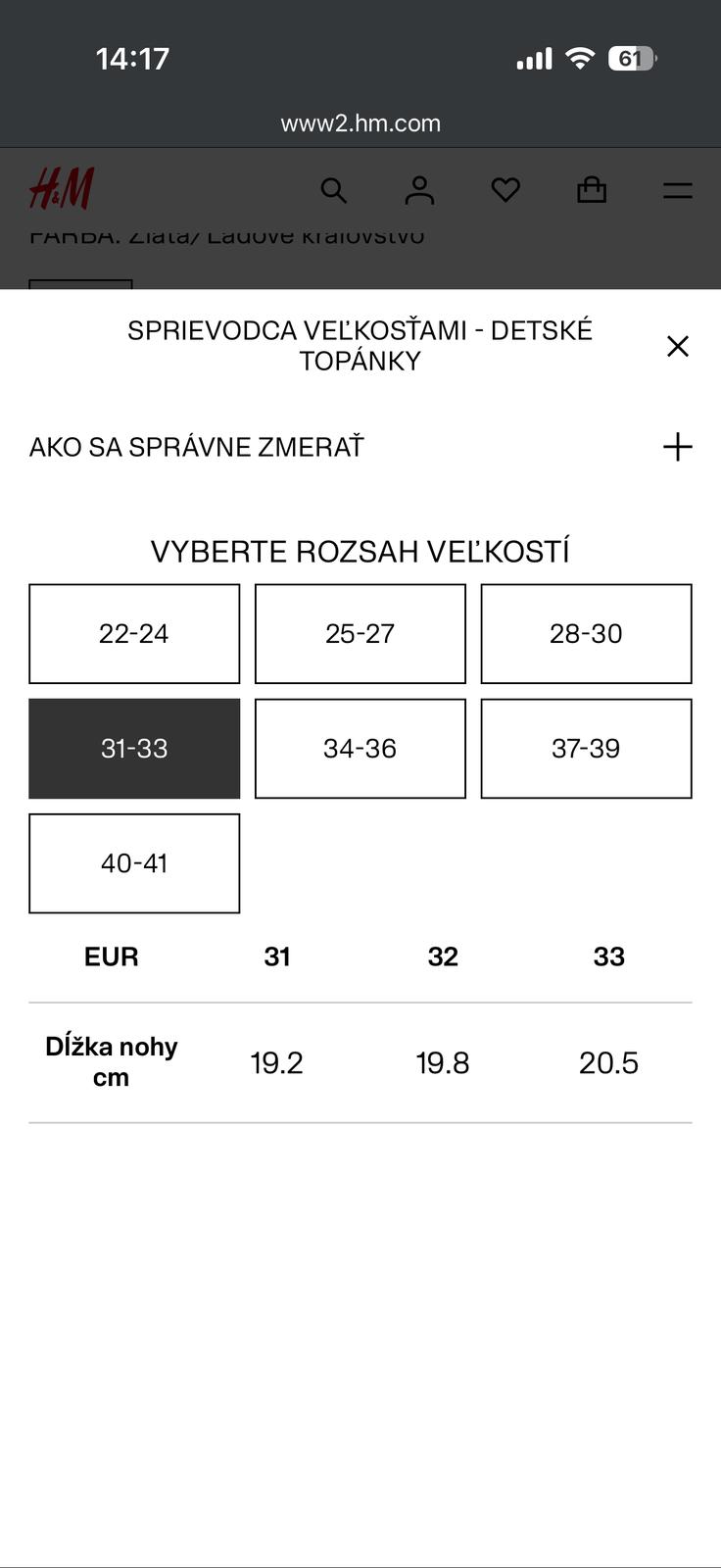 Obuté max 3 razy, top stav. Velkost H&M 32, písané na nožku 19,8 cm podla tabulky, podla topánky na 20 cm nožku. Vnútorná dlžka je 20,5 cm. Pôvodná cena 29,90 €.