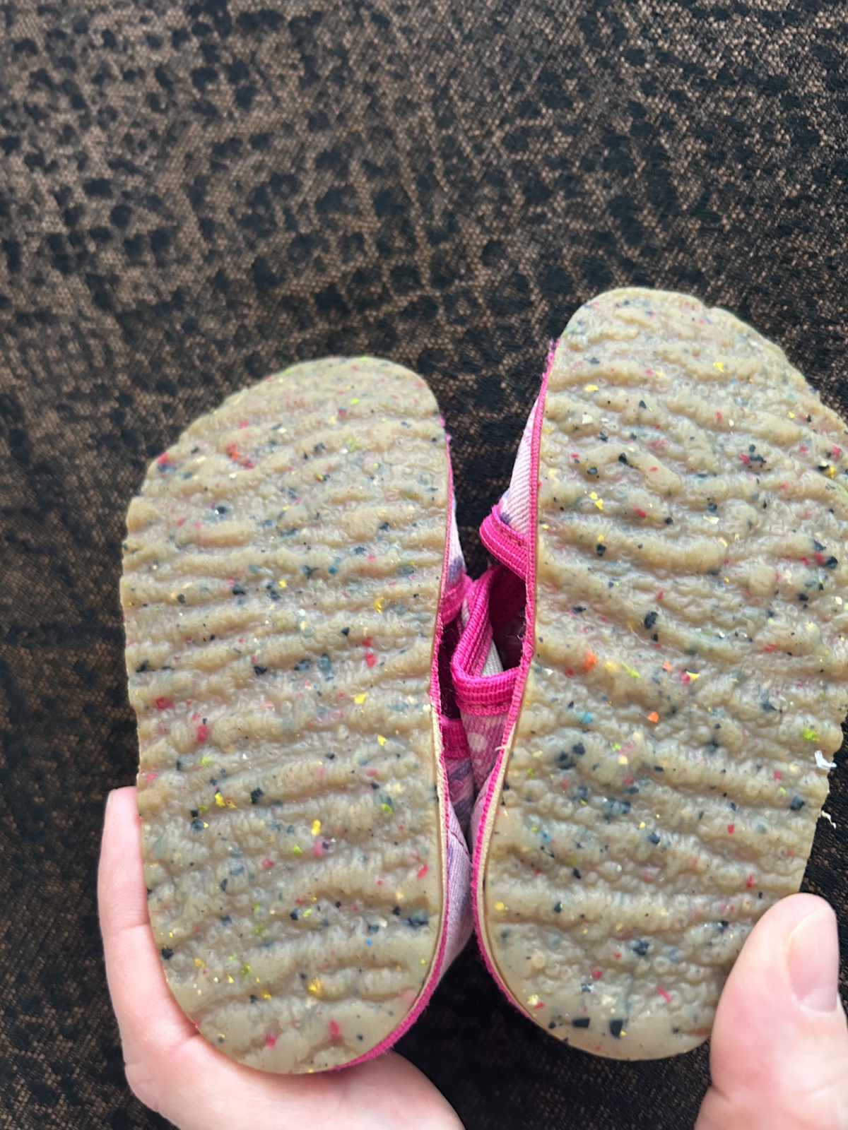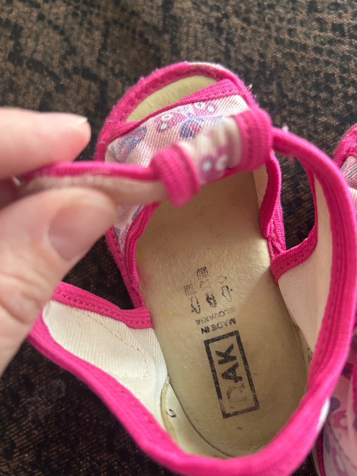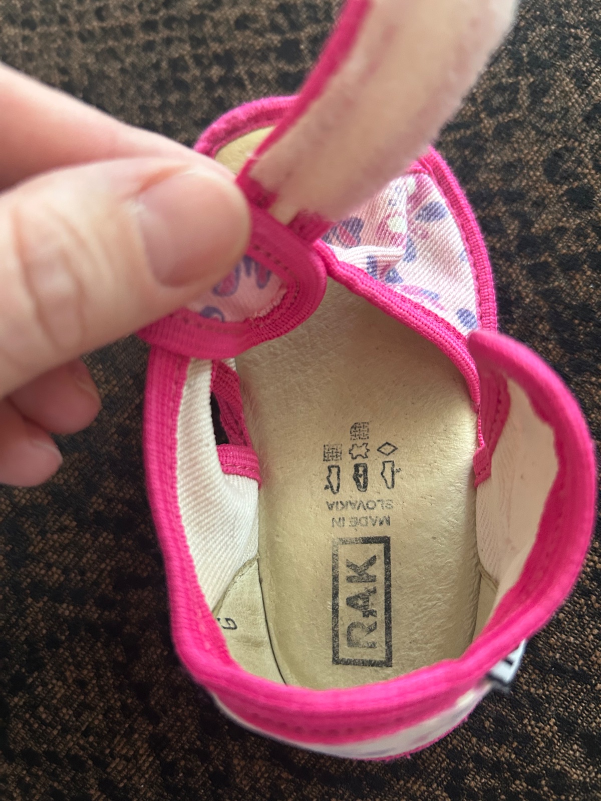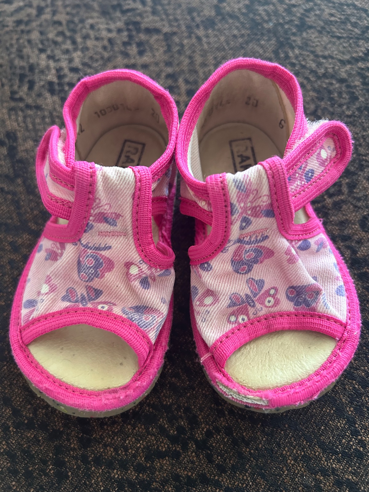 Skvele papucky s makkym vnutrom. Nosili sme asi 2 mesiace, rychlo vyrastla nozicka. Napriek tomu ze maju vpredu trhlinku, naozaj boli malo nosene, vidiet na spodku aj na vnutornych slapoch.