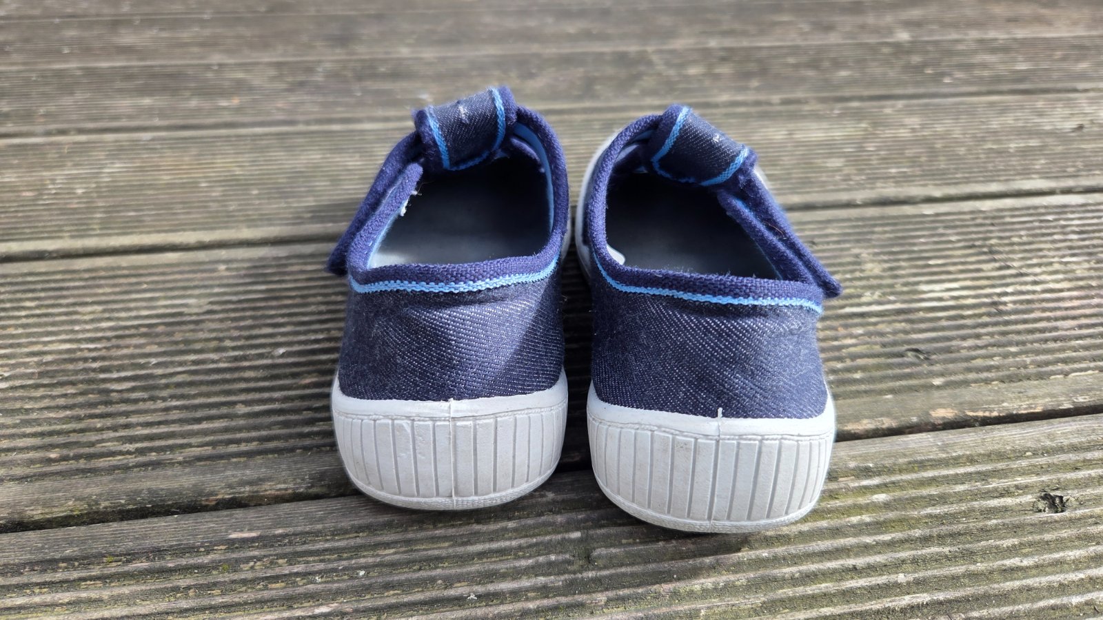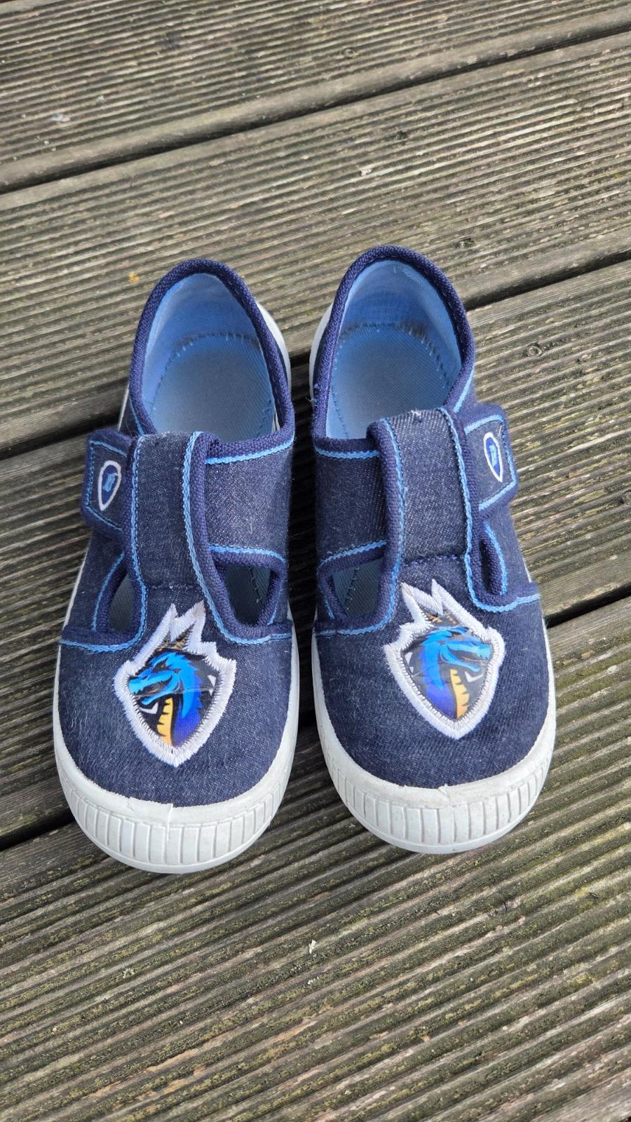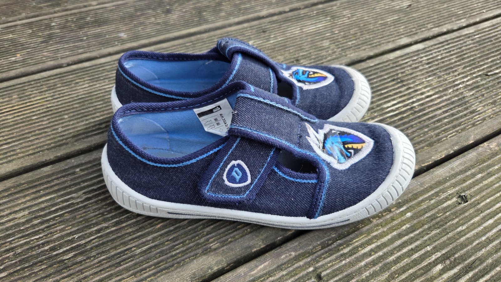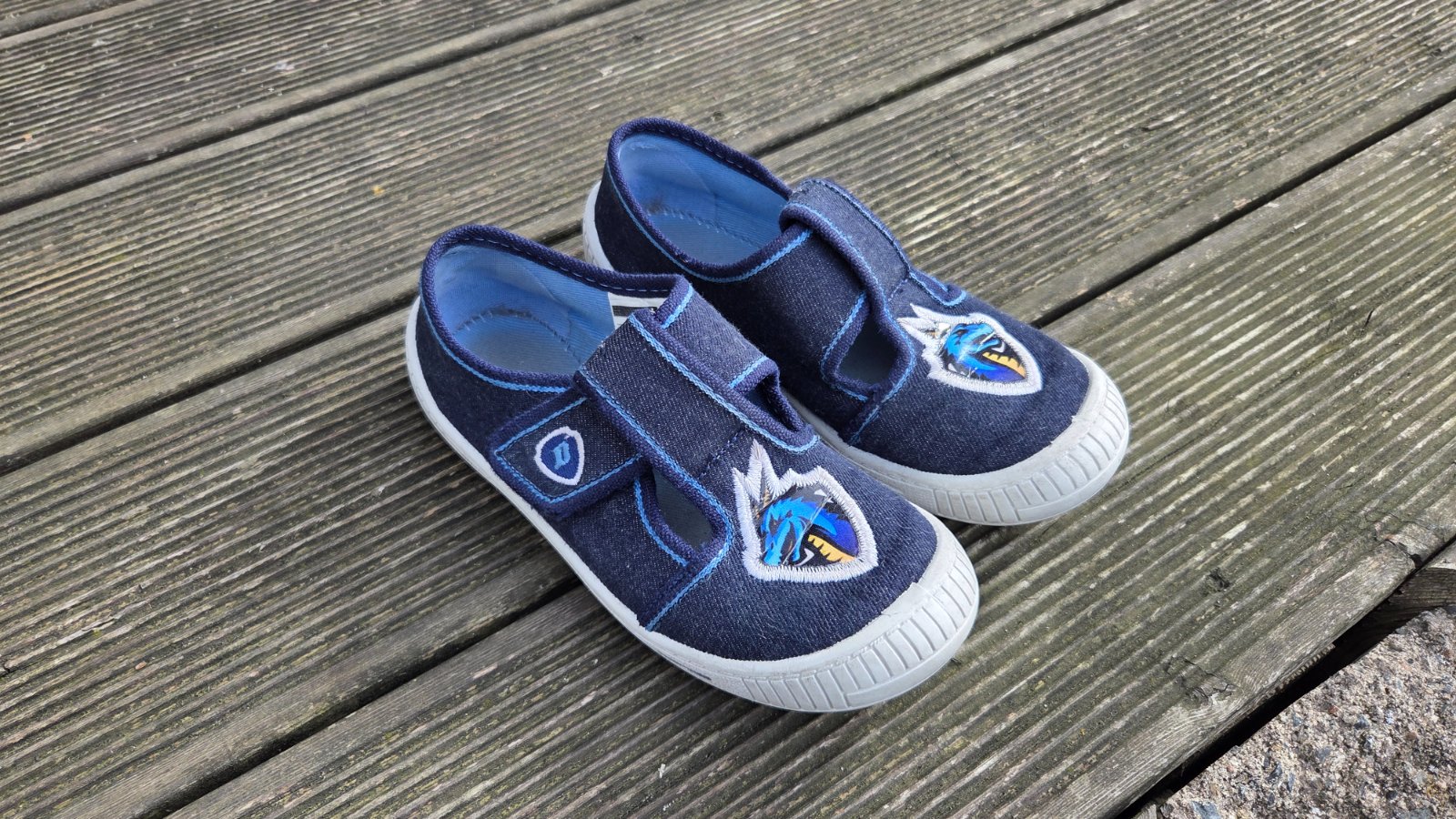 Predám málo nosené papuče / sandálky na suchý zips. Farba denim - rifľová, s obrázkom dinosaura. Bez akýchkoľvek poškodení.