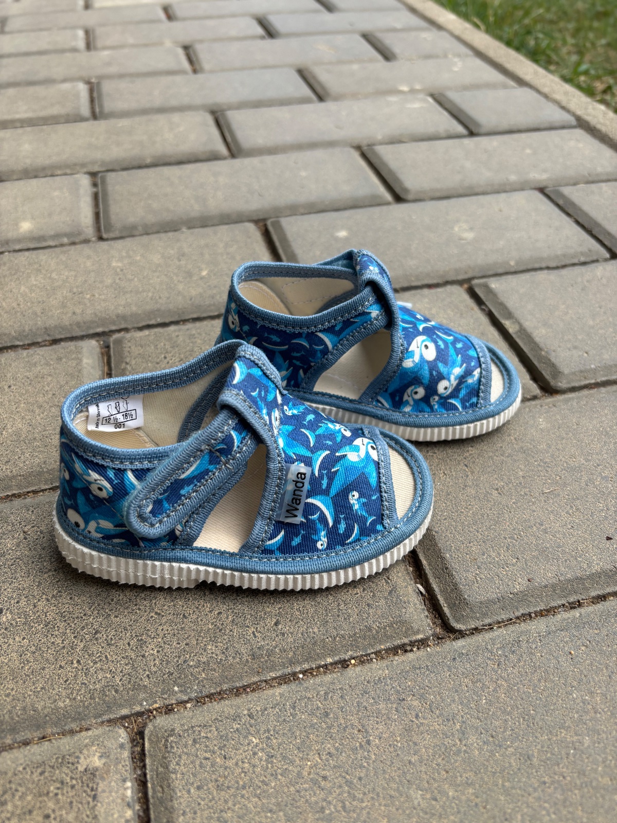 Detské papučky z prírodného textilného materiálu sandálkového typu so zatvorenou špičkou. Podošva je vyrobená z mäkkého, ale odolného styroporu. Uzatváranie je na suchý zips veľkosť 17 = vnútorná d...