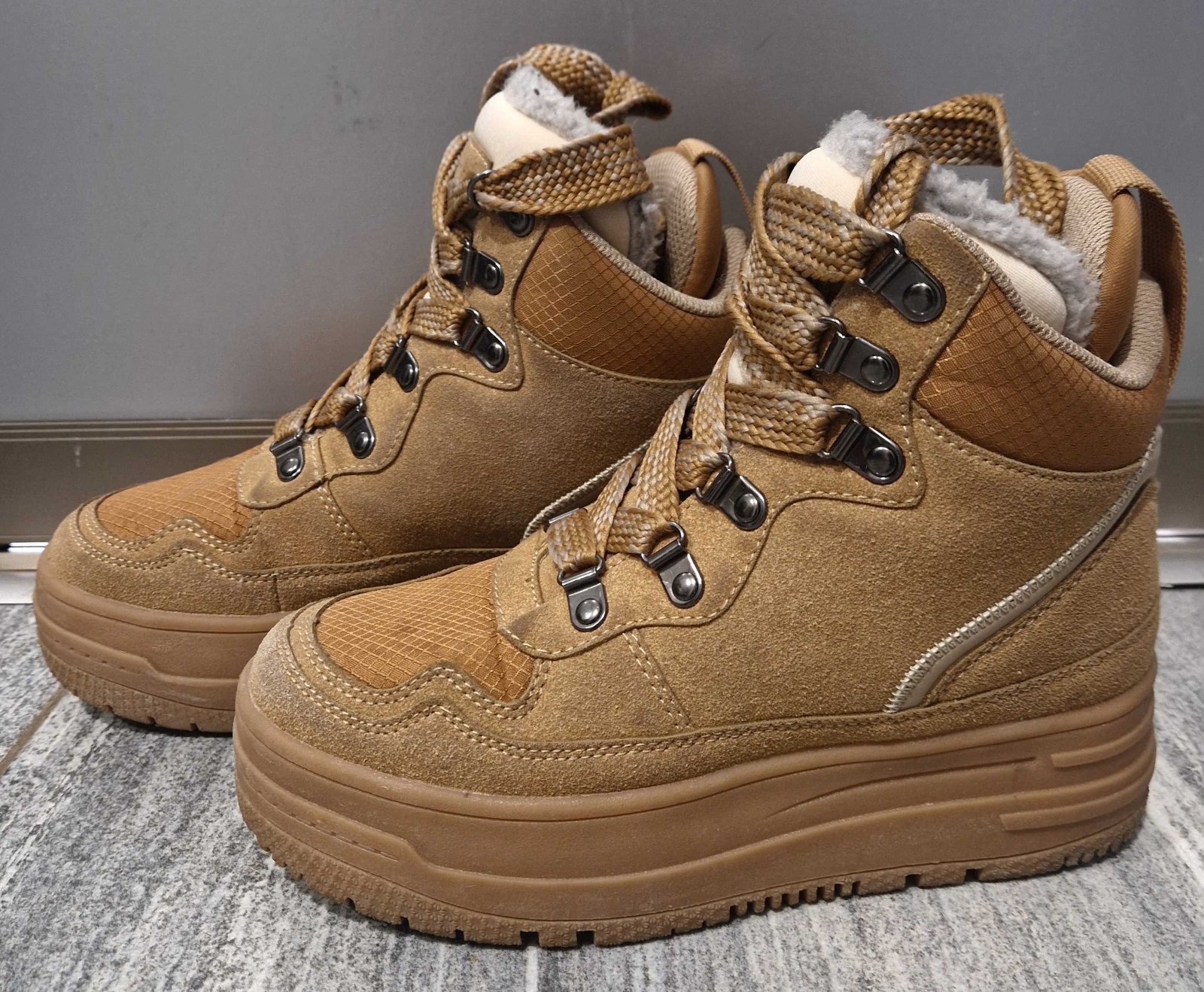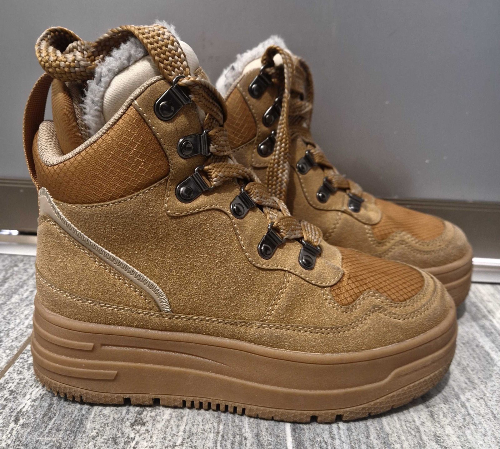 Krásne a hrubé topánky obuv na zimu na šnurovanie. Vyššia platforma. Obuté boli párkrát dcérou, žiaľ jej rýchlo vyrástla noha. Sú to dámske topánky, nie detské. Veľkosť 36