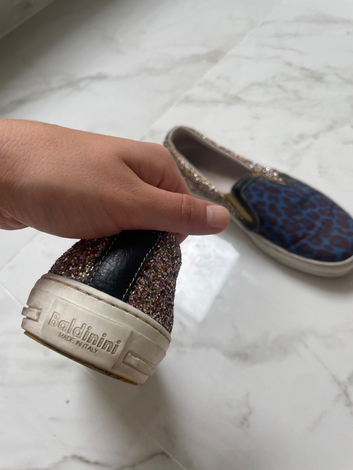 Exkluzívne tenisky prestížnej talianskej značky Baldinini, vyrobené s dôrazom na detail a komfort. Ide o originálny kúsok, ktorý spája odvážny modro-bordový leopardí vzor na prednej časti so žiarivým multicolor glitter povrchom po bokoch a vzadu. Vnútro je kožené, čo zabezpečuje maximálne pohodlie a priedušnosť aj pri dlhšom nosení.