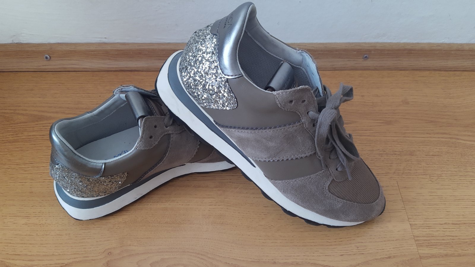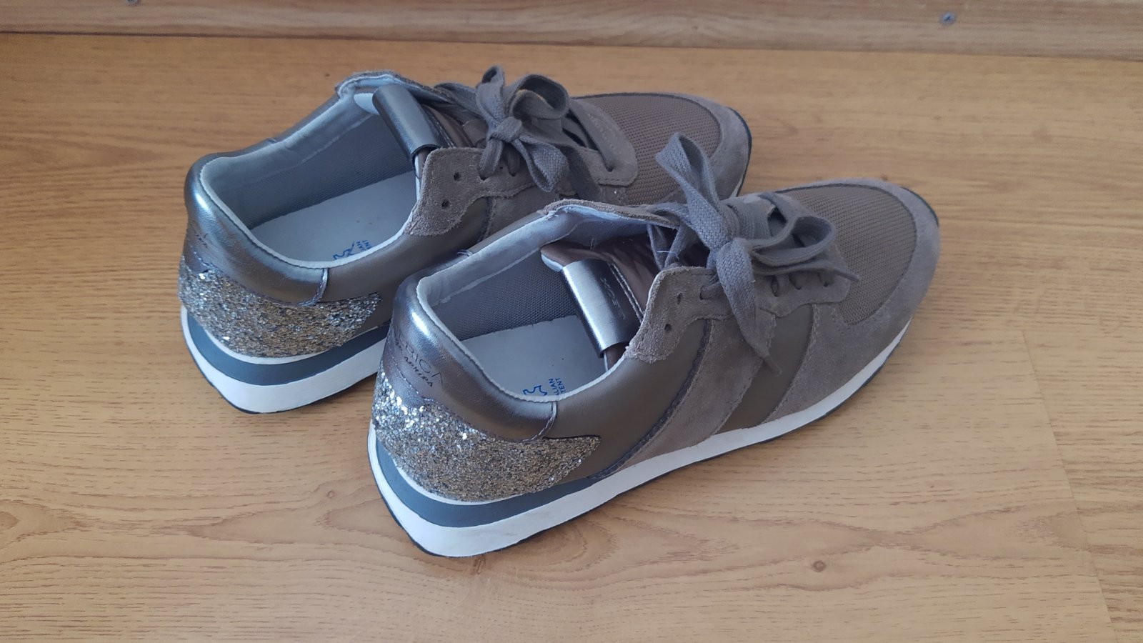 Predám 2x obuté tenisky, kožené vložky, zospodu pohodlna podrážka, zozadu s trblietavé, bez poškodenia, farba je hnedo-sivá. PC 60