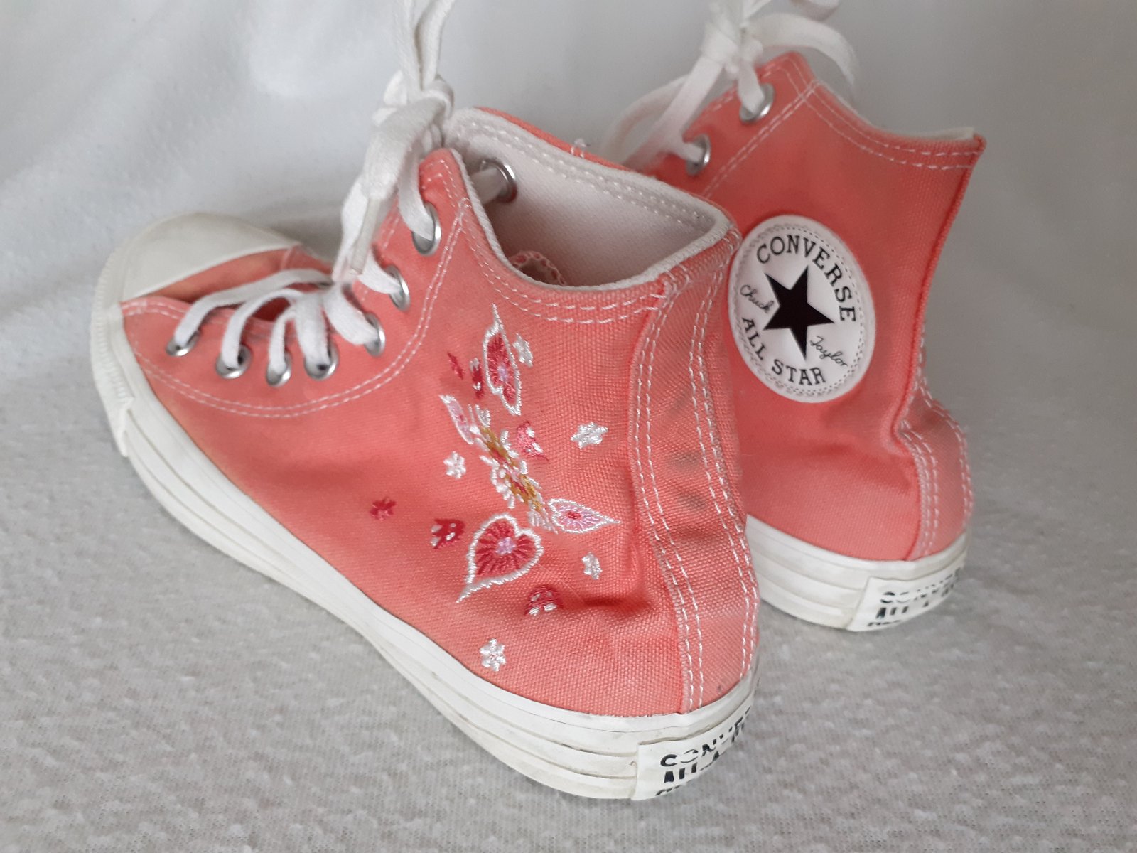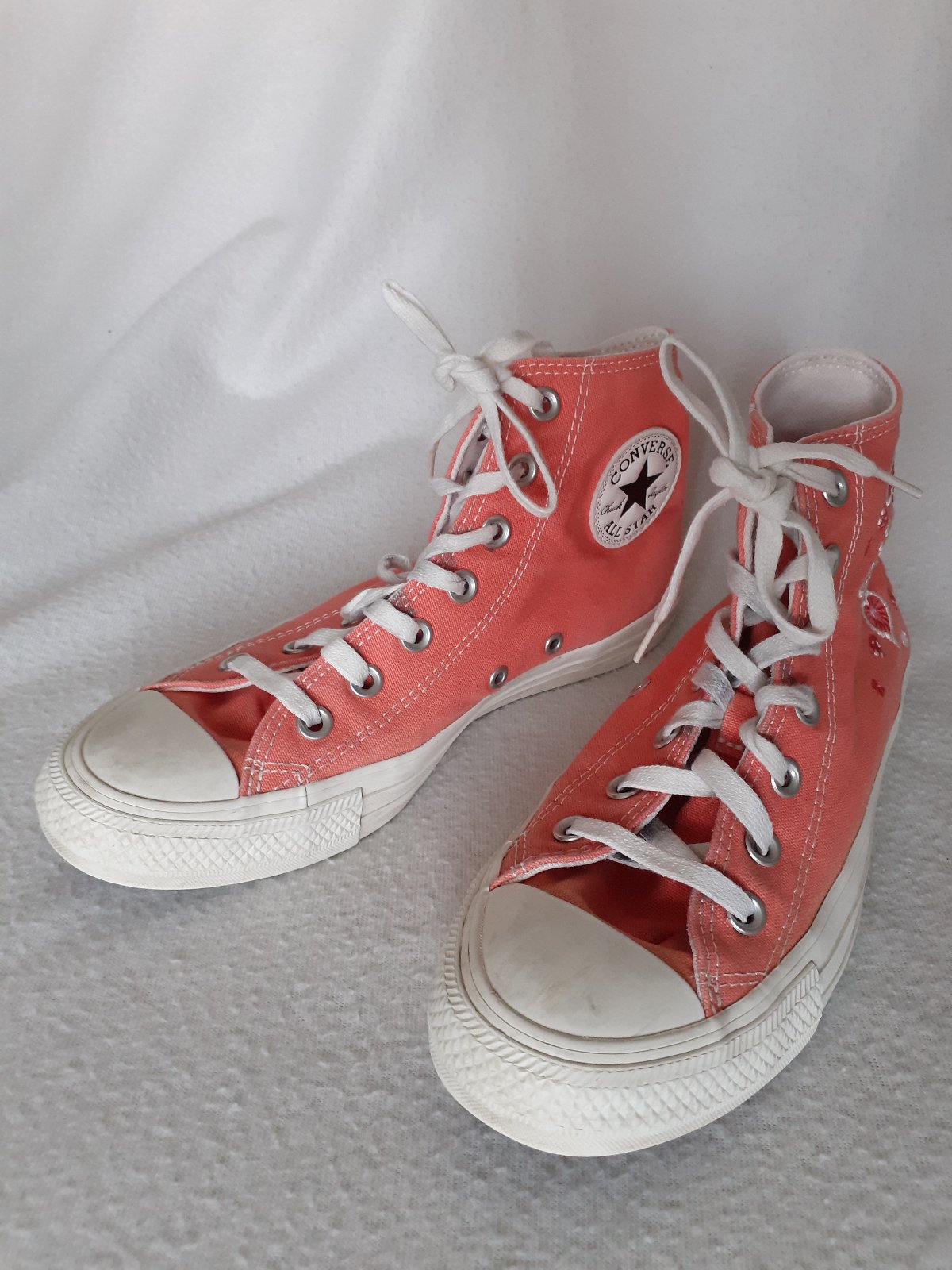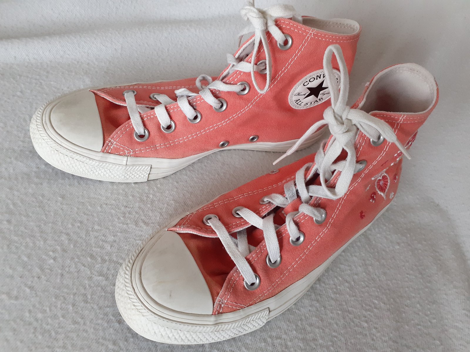 Predám dámske/dievčenské lososové tenisky Converse Chuck Taylor All Star veľkosti 38 - 39. Nameraná vnútorná dĺžka je 24,5cm. Tenisky boli obuté iba pár krát, pekný stav - viď. foto. Cena 14e + poštovné/osobne v Bratislave.