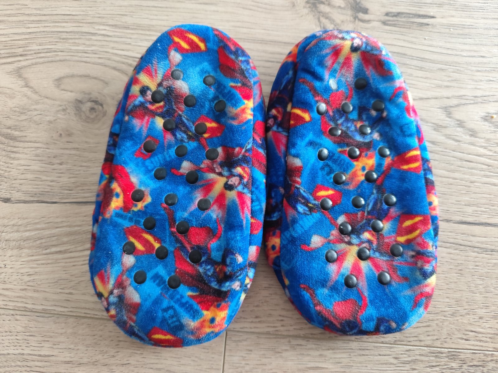 Superman mäkké papučky v peknom stave, nosené príležitostne. Veľkosť je 27, ale obuje aj menšia 28. Na spodku majú protišmykovú úpravu.