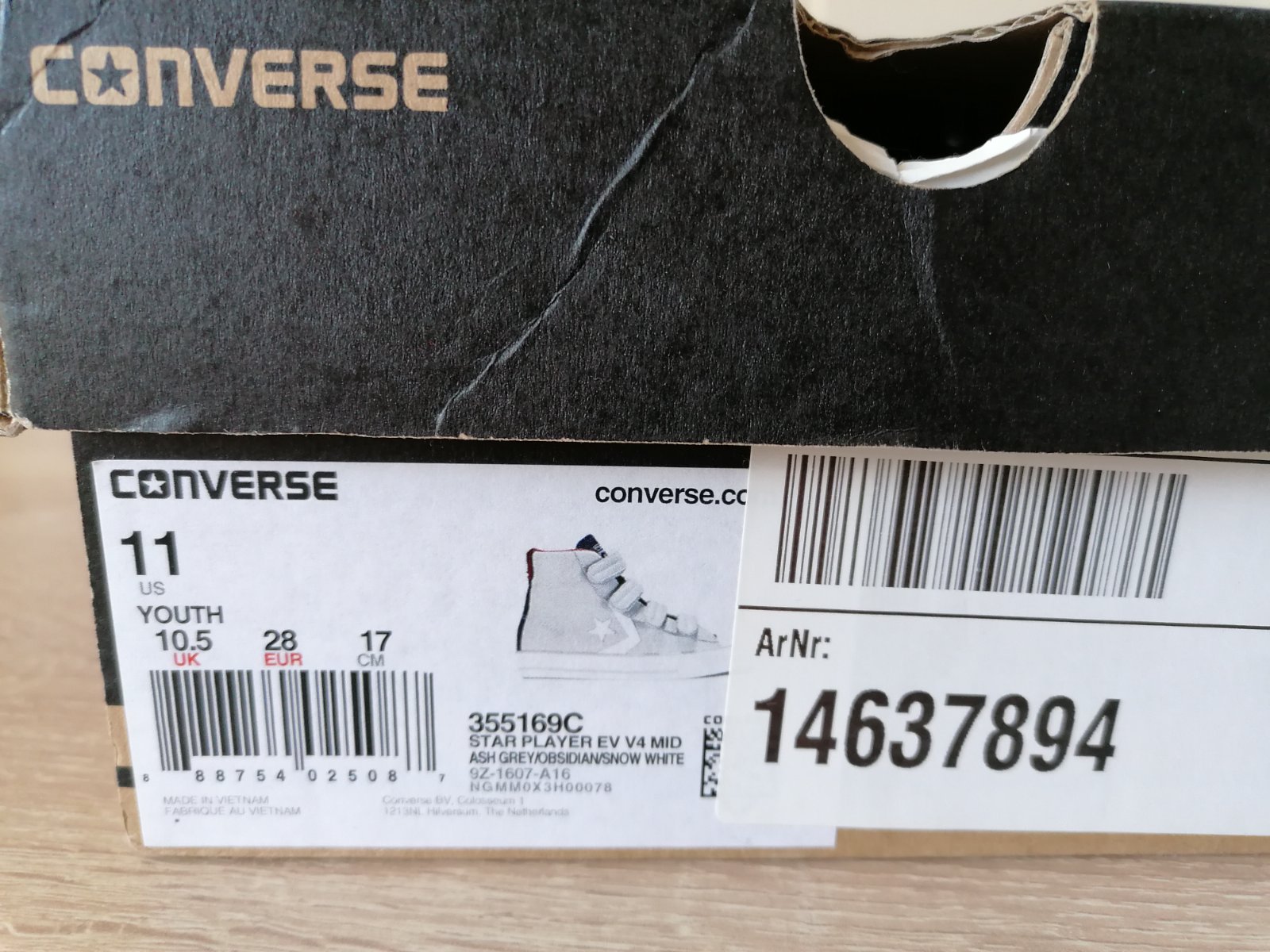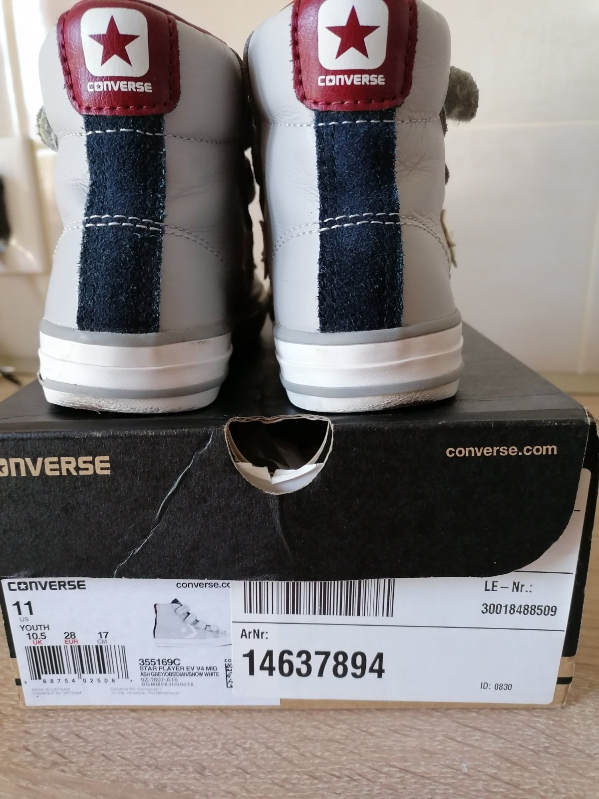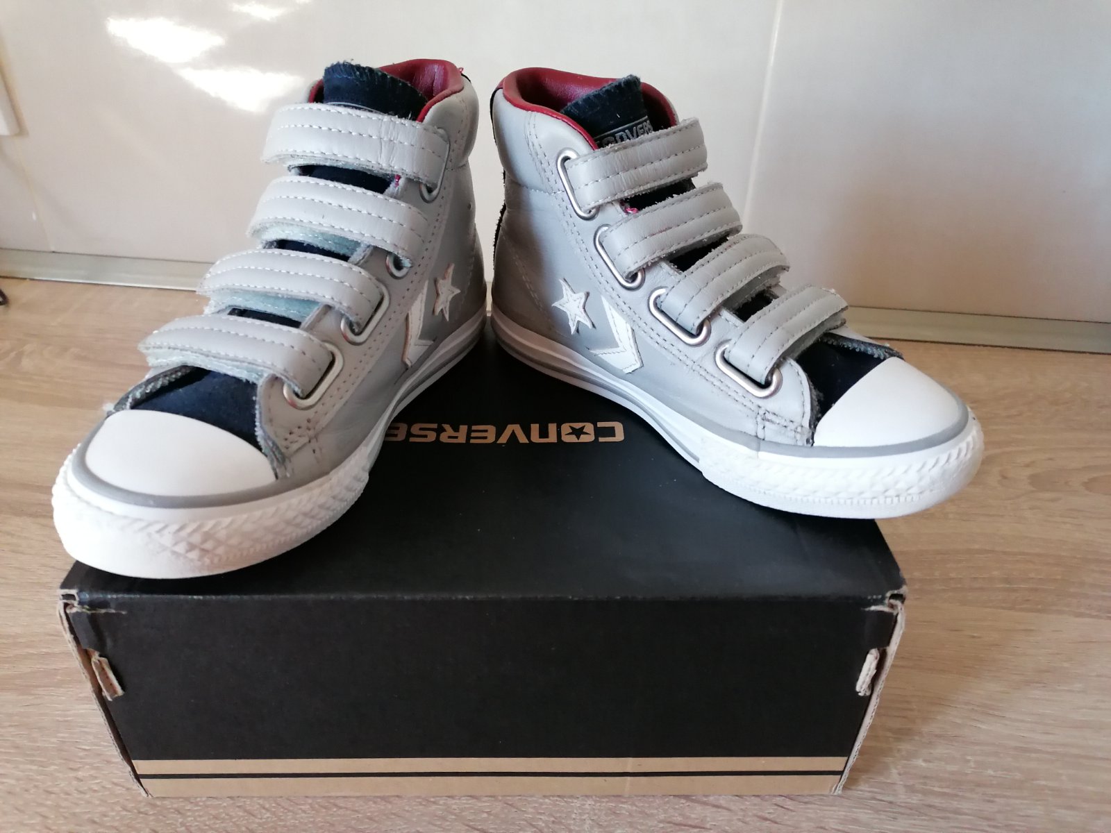Kožené nevyteplené Converse na suchý zips, nepremokavé. Drobec ich mal len pár krát obuté, ale majú šuchnuté spodky vzadu na päte od jedneho vozenia na tatrovke, nie veľmi, ale sú. Inak veľmi pekný stav. Veľkosť 28,VD sa horšie meria, cca 18-18,5 cm.