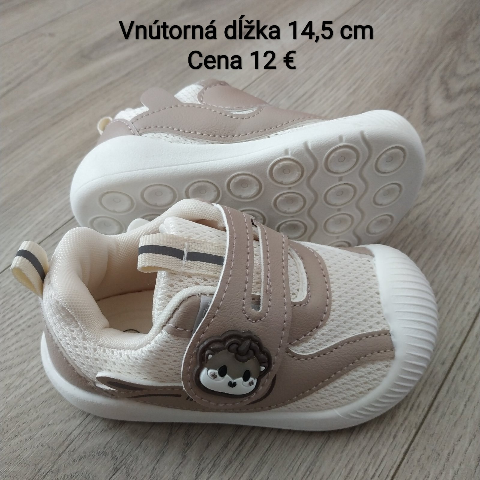 Detské topánočky - čínska veľkosť 19 - naša 22 - vnútorná dĺžka 14,5 cm. Priedušné, mäkké, veľmi ohybné a pohodlné topánočky. Nestihli sme použiť, rýchlo podrástli malému nožičky. Cena 10 € + pošta alebo osobný odber.