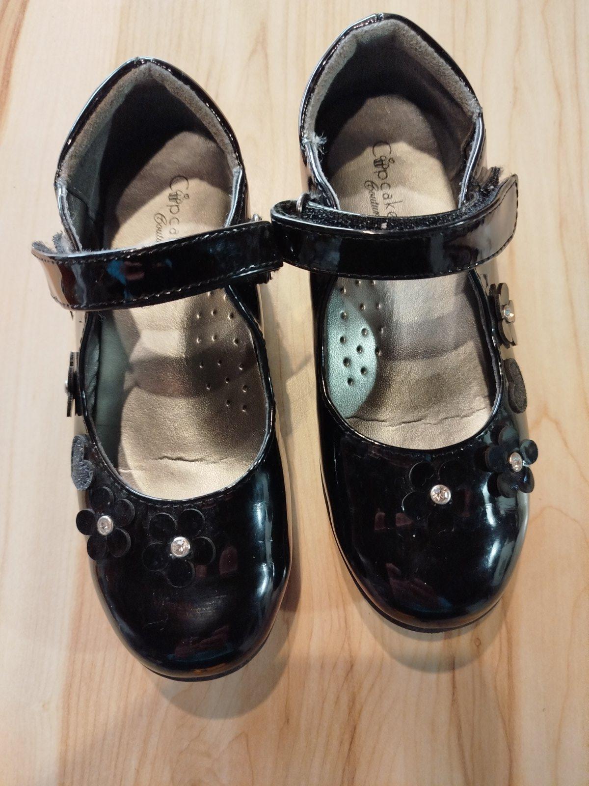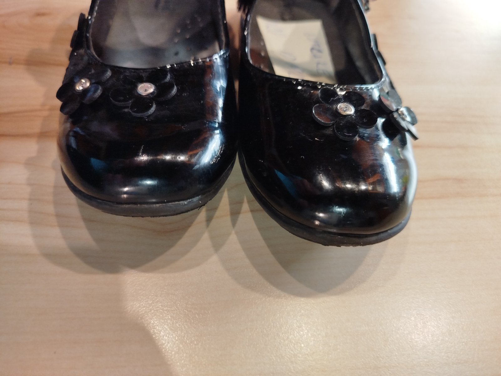 Predám dievčenské baleríny, veľkosť 28. Málo nosené, ošúchaná špička na pravej topánke (viď. obr.) Inak bez poškodenia. Biele lesklé s hviezdičkami.