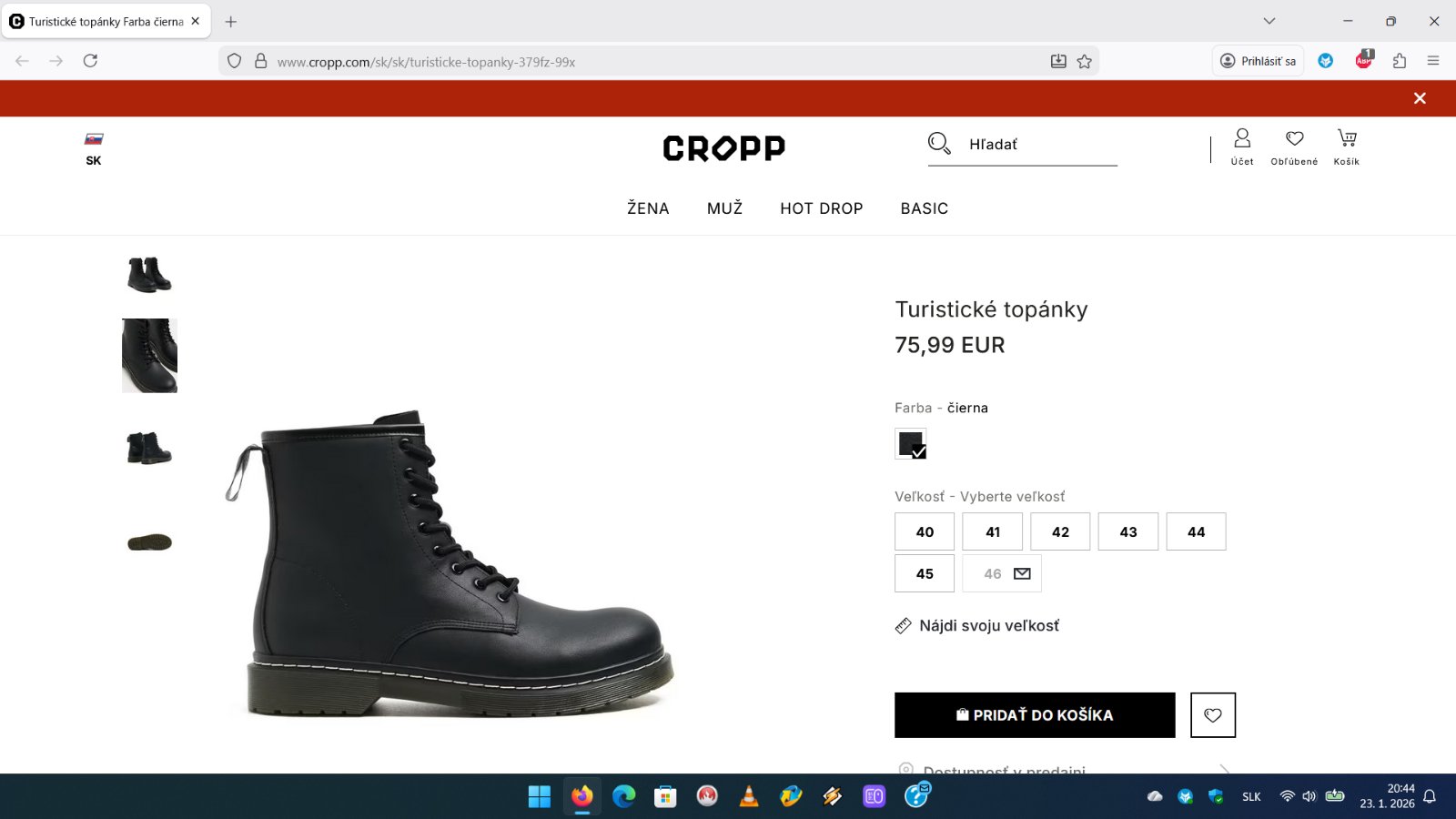 Ďalej predám pánske turistické topánky Cropp, veľkosť 42 = 27cm. Topánky sú nové, POLYURETÁN. Cena 40eur.