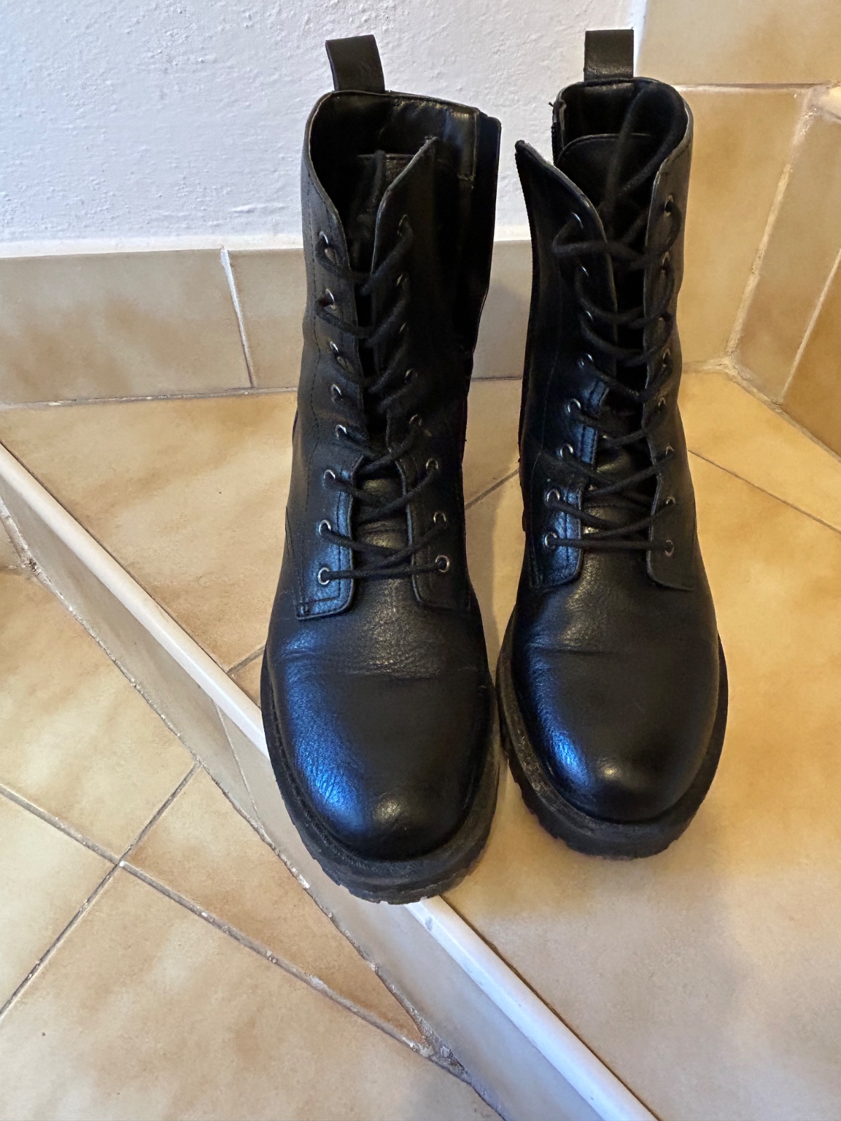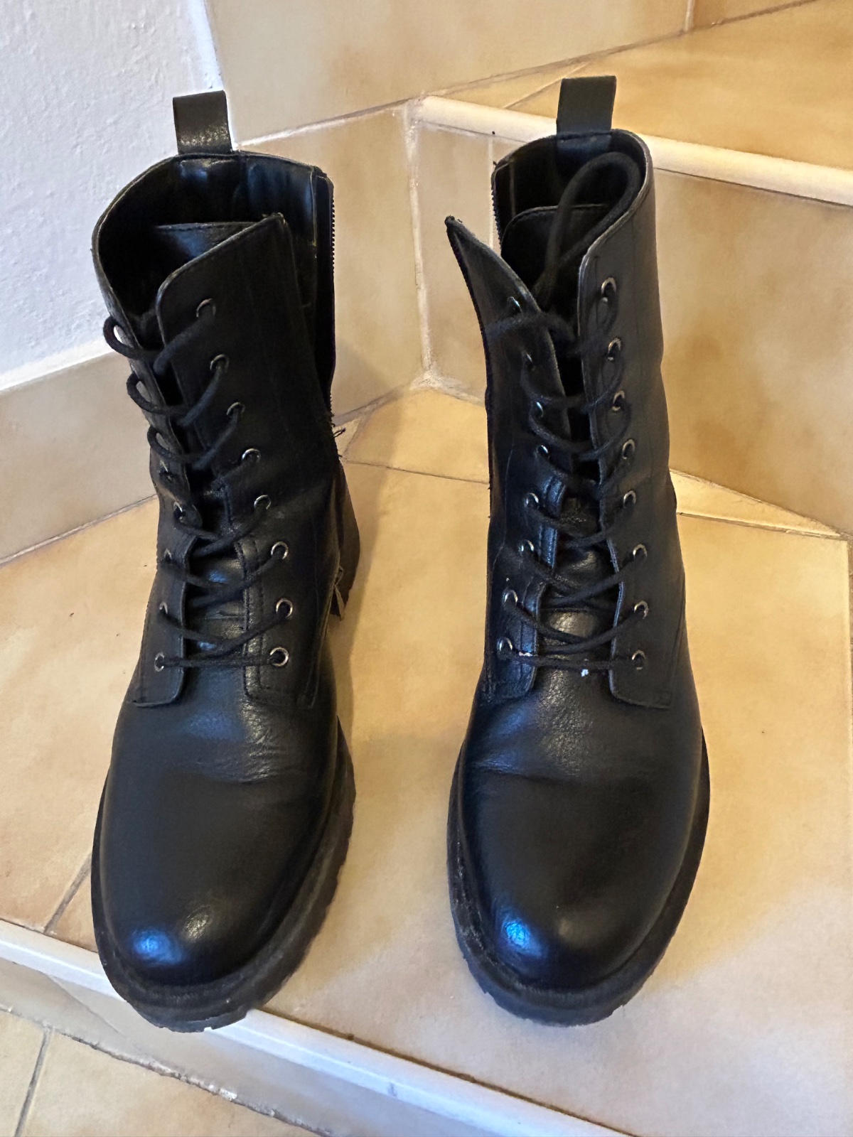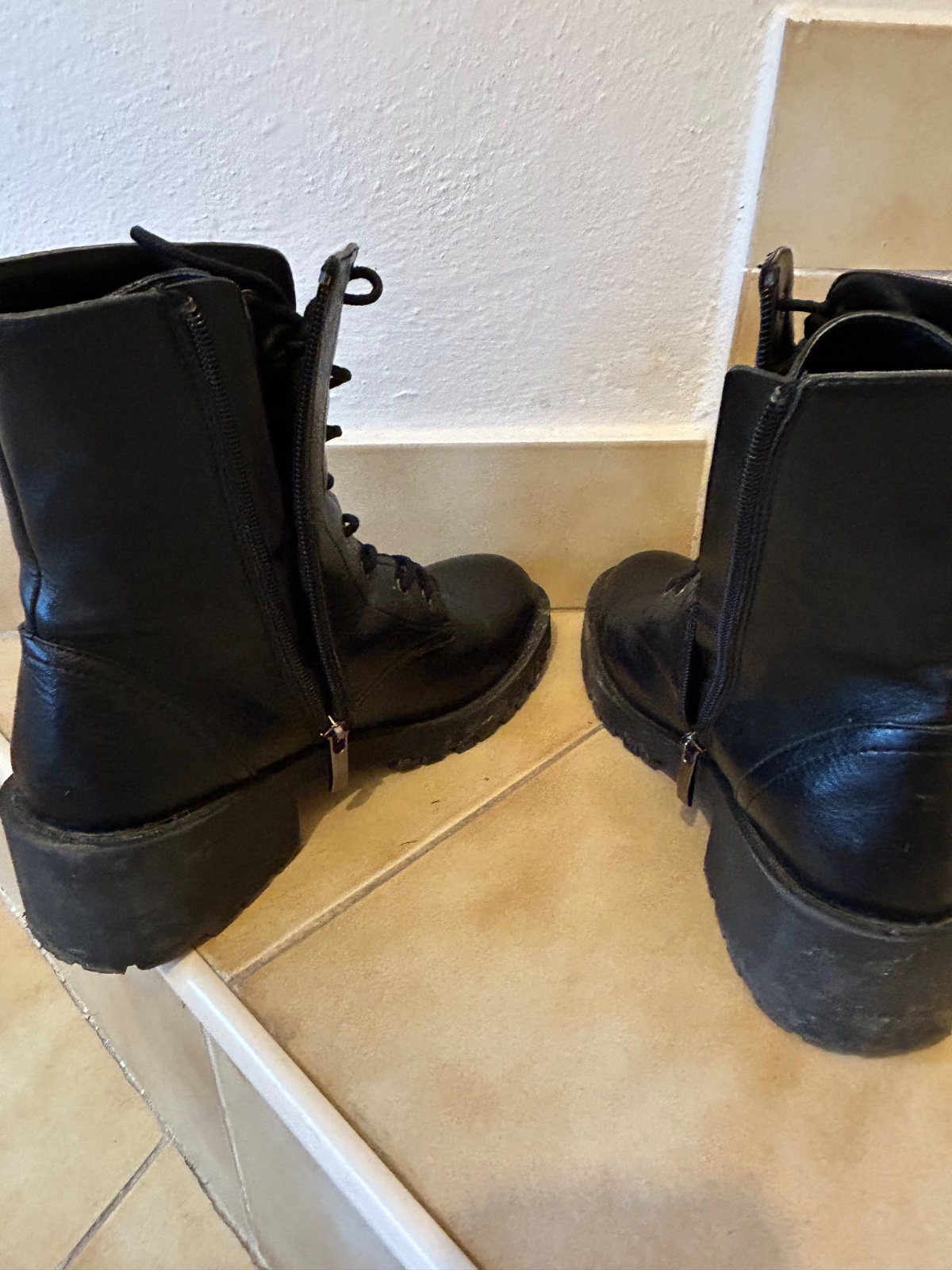 Čierne členkové topánky. Na zips aj šnúrky. Kupované v predajni medicine. Na jednej topanke sa vo vnútri topanky jemne šúpe.