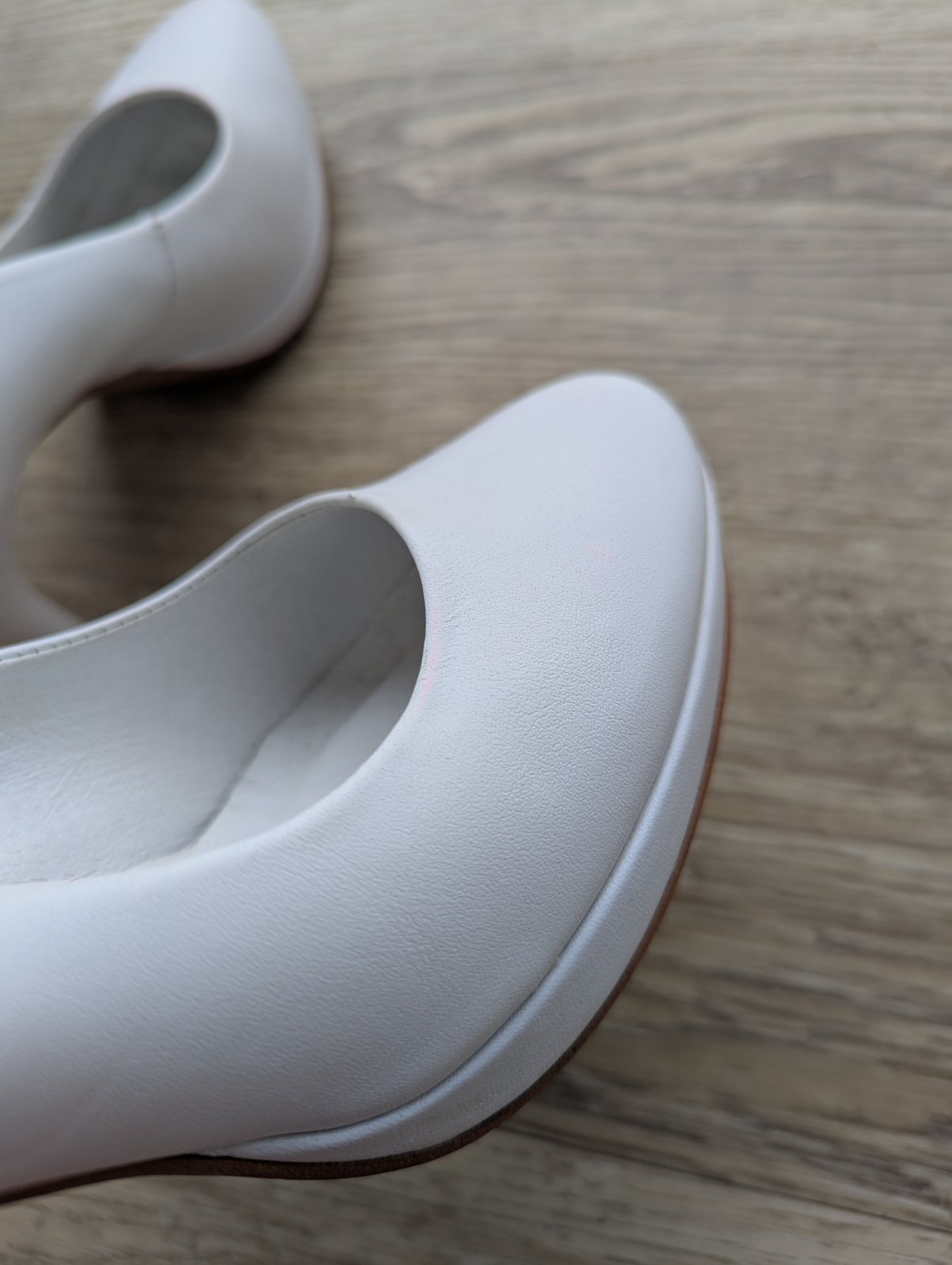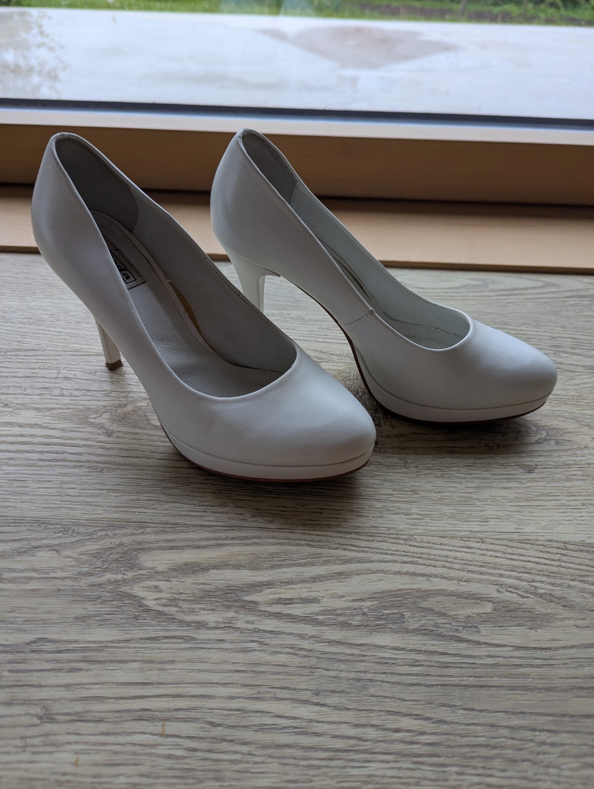 Presne 4x obuté svadobné lodičky. Na jednej je ruzovkasta skvrnka veľmi malá. Ak by mi nepadla klenba po deťoch nepredam ich. Sú kožené. Vhodné aj na dotvorenie. Veľkosť sedí na 37. Cena bez poštovného.