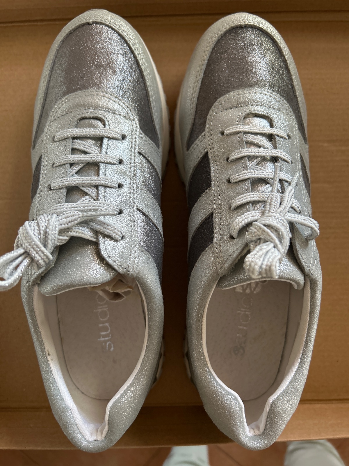 Predám strieborné tenisky kupované v Deichmann obuve, so šnurovaním. Nosené, ale plne funkčné. Dĺžka vnútornej vložky je cca 24,5-25 cm.