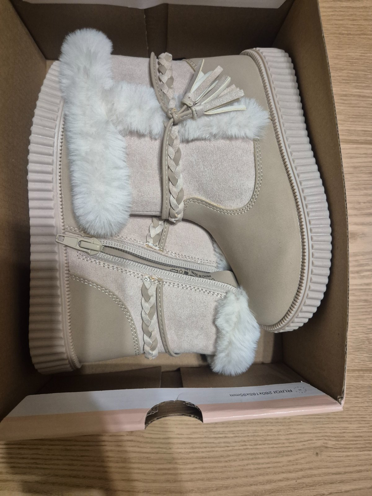 Kozusinkove zateplene topánky,na boku zips. Bez poskodenia. Parkrat na nozke. K tomu pridam next modre topanky