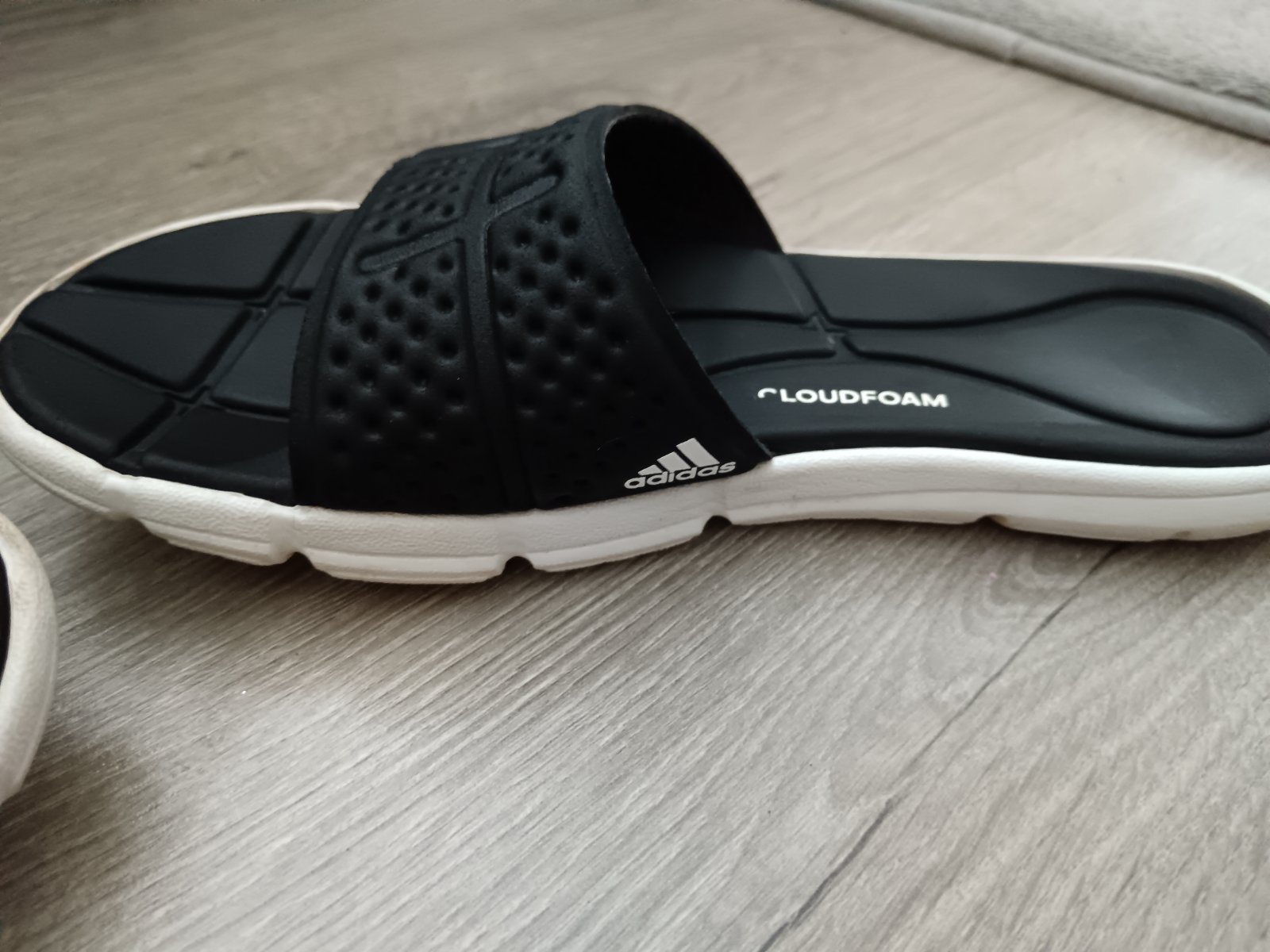 Predám šľapky zn. Adidas na donosenie. Plne funkčné, avšak vyblednuté biele pásiky.
